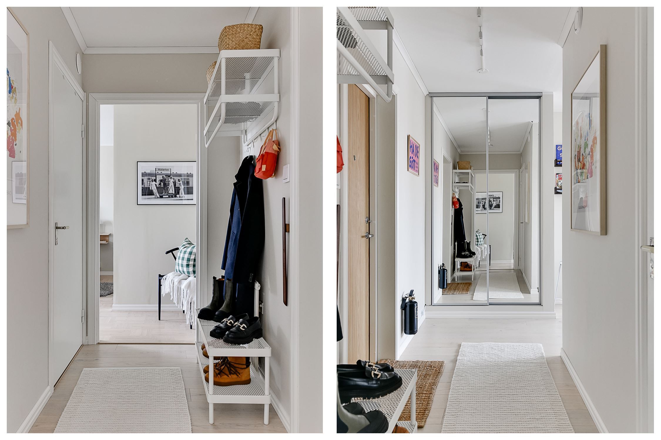 Redan i hallen märks bostadens höga standard. En enhetlig enstavsparkett breder ut sig genom hela lägenheten och sätter tonen tillsammans med ljusa ytskikt, goda avhängningsmöjligheter och en generös dubbelgarderob med eleganta glasskjutdörrar. Den centralt placerade entrén binder samman hela bostaden och öppnar upp mot såväl det sociala allrummet som sovrum, balkong och duschrum.