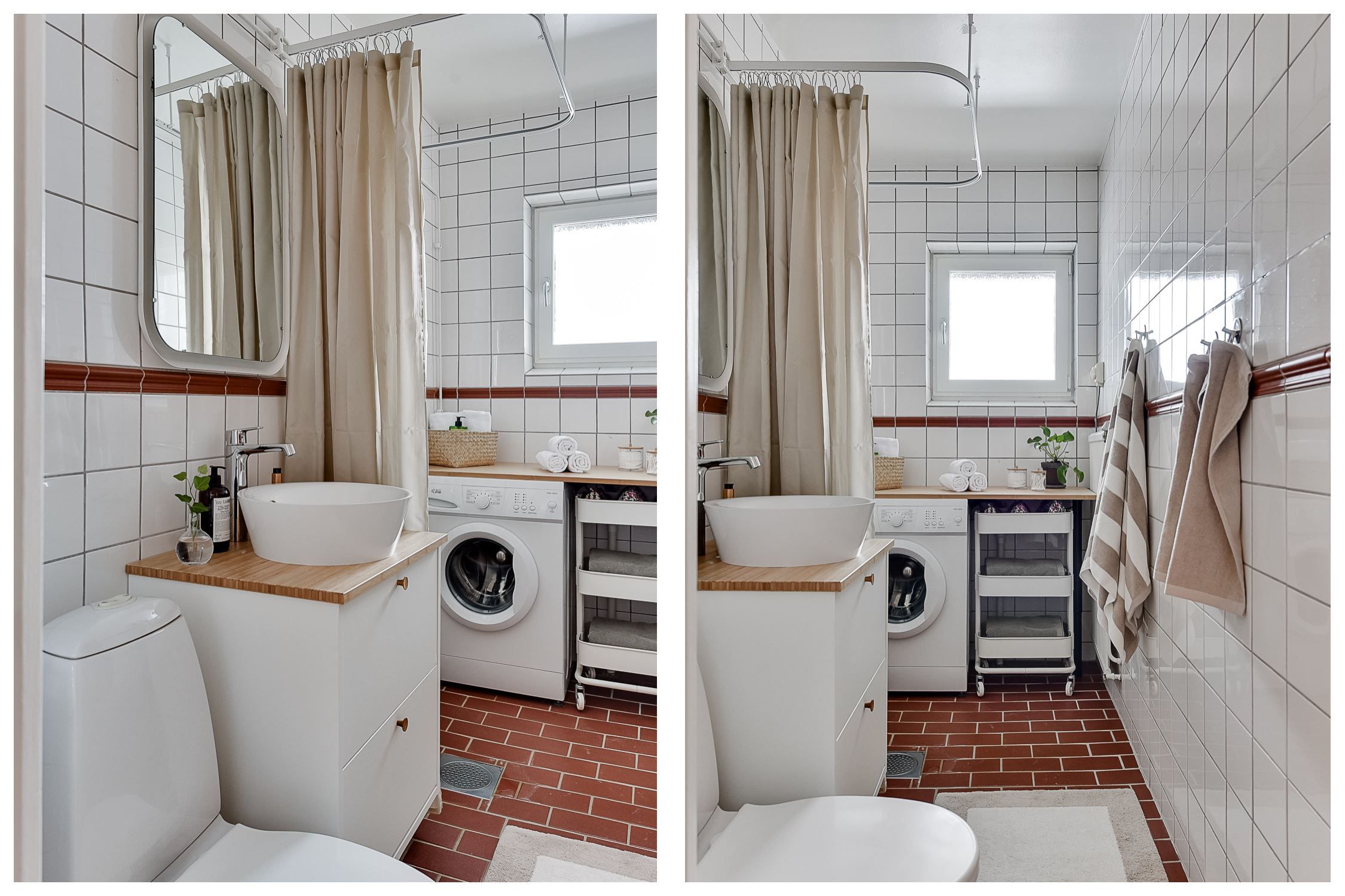 Duschrummet, stambytt och renoverat av föreningen, är ett tryggt och fräscht utrymme med moderniserade detaljer. Här återfinns kommod, wc, dusch, tvättmaskin samt arbetsyta – en mycket uppskattad funktion i en tvåa.