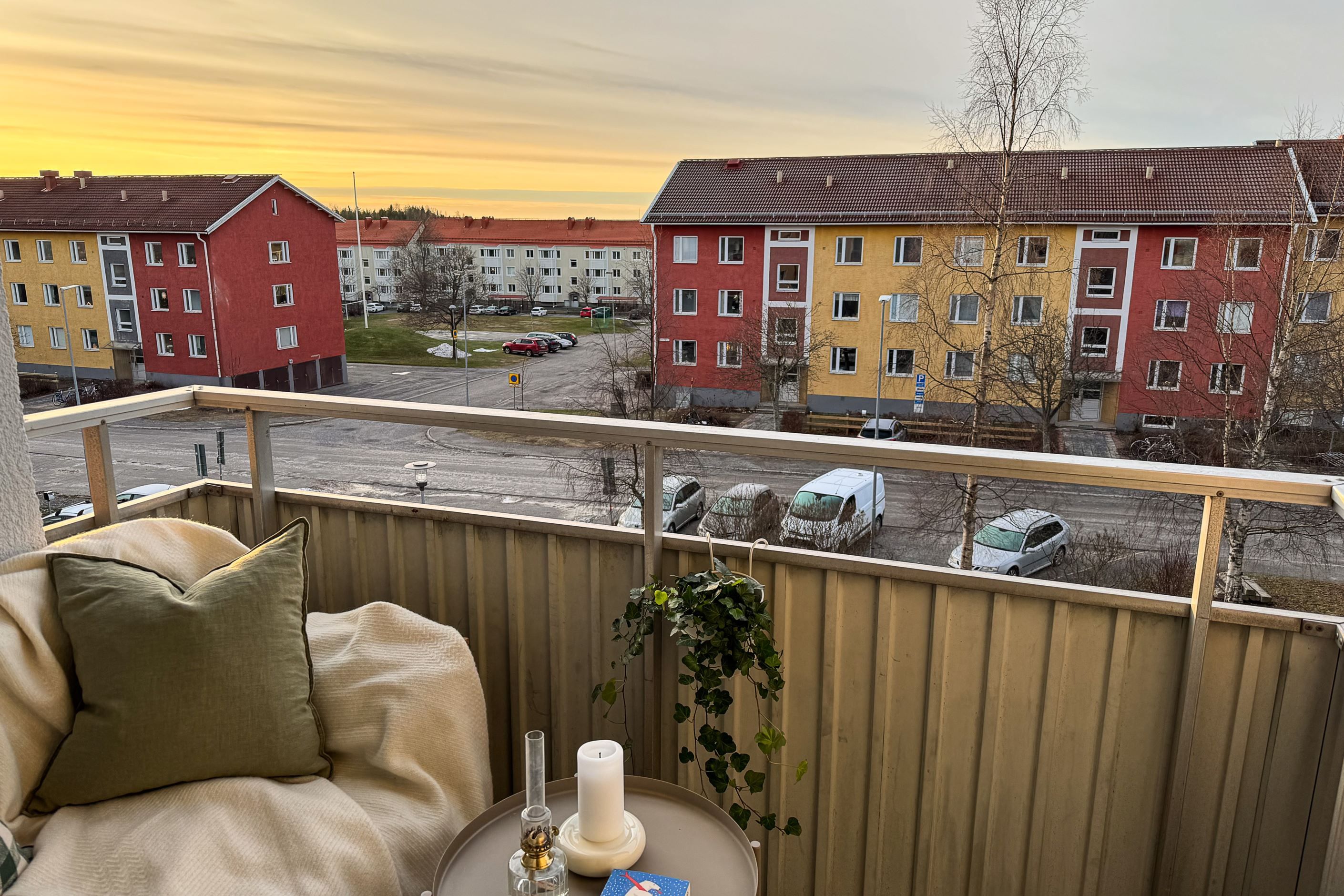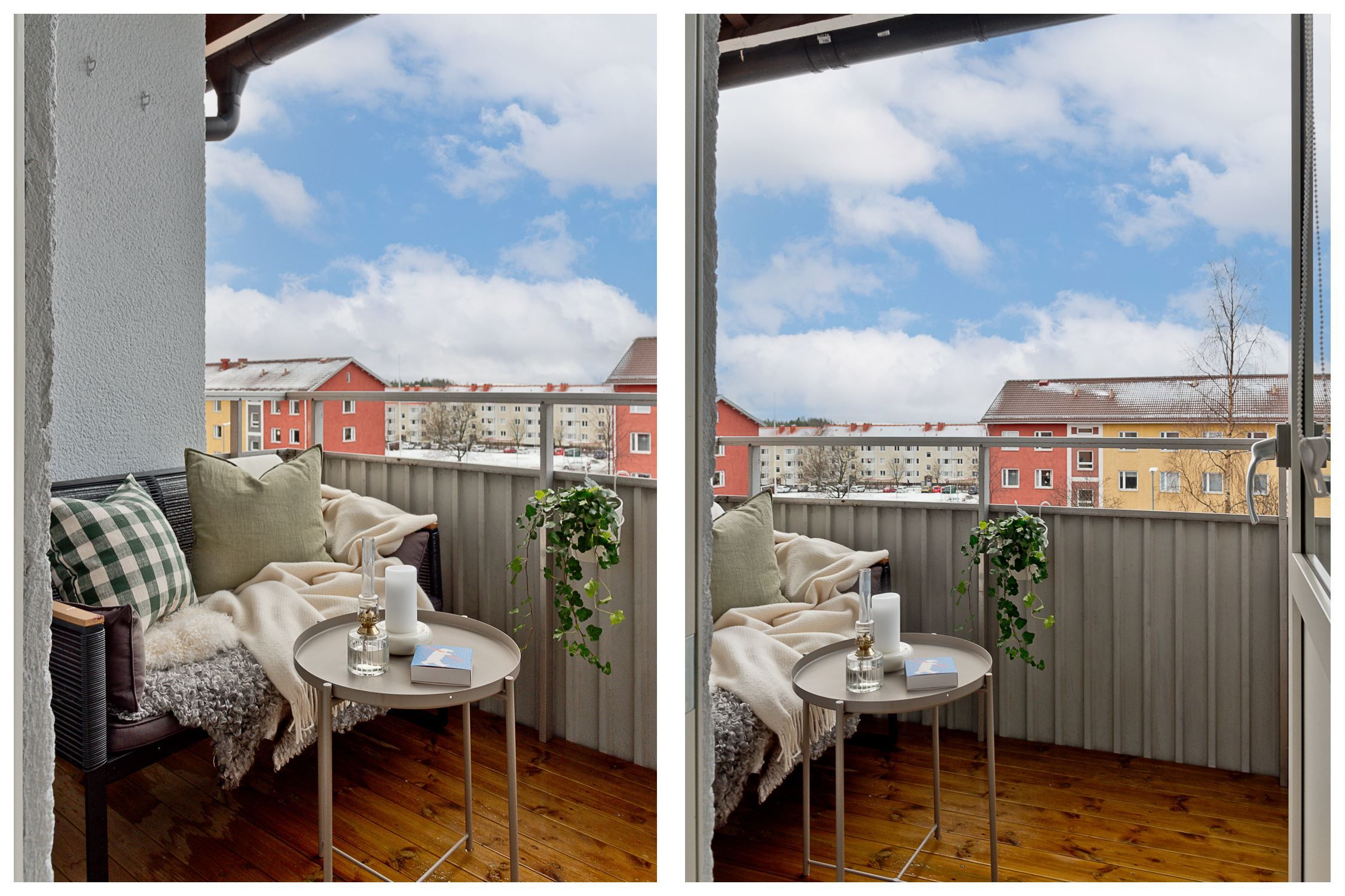 Från sovrummet nås även bostadens härliga balkong i idealiskt sydvästläge – en solig oas perfekt för caféset eller mindre loungegrupp där man kan njuta av utsikten och många soltimmar från högsta våningsplanet.
