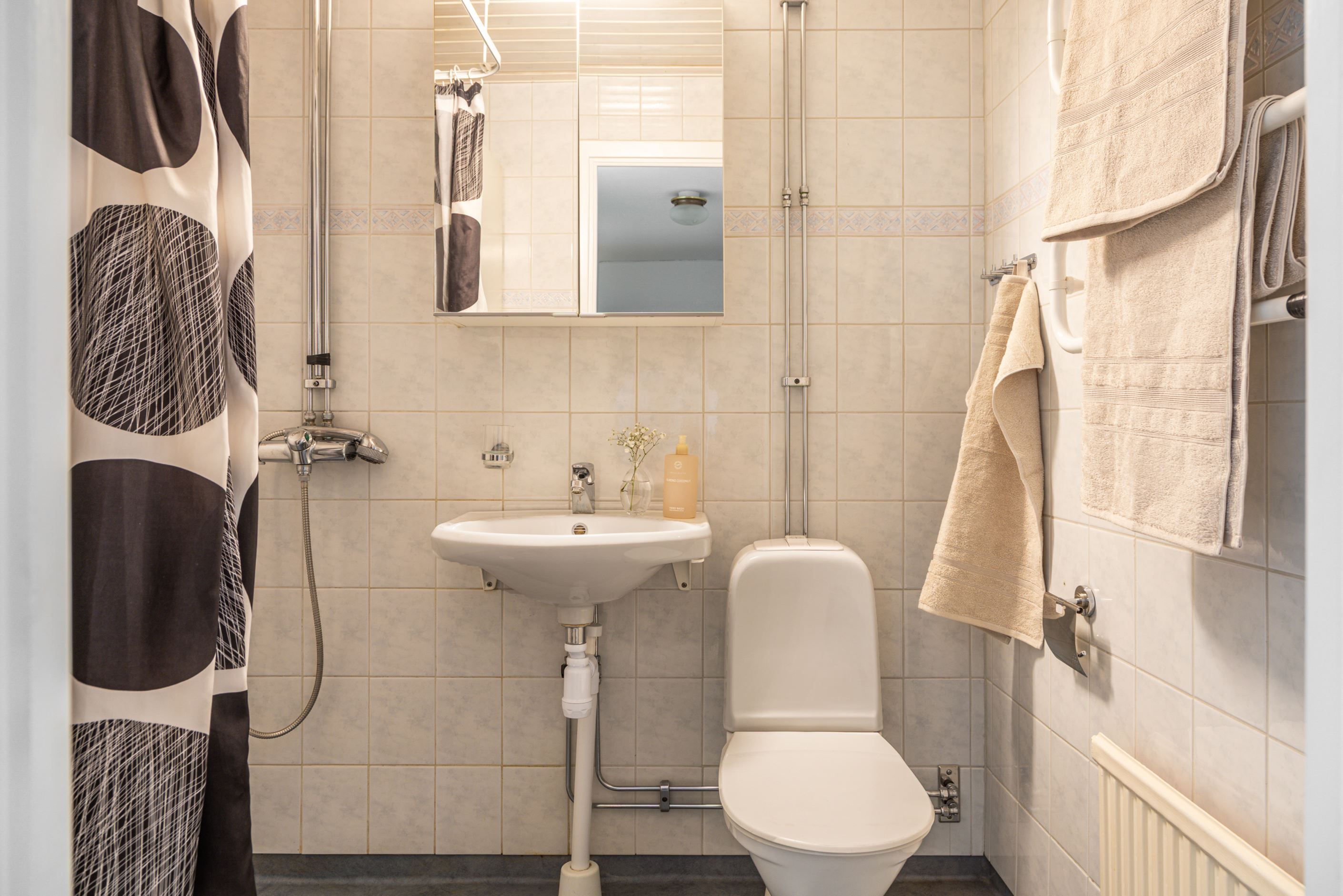 Fin WC/Dusch med kaklade väggar och plastmatta på golv