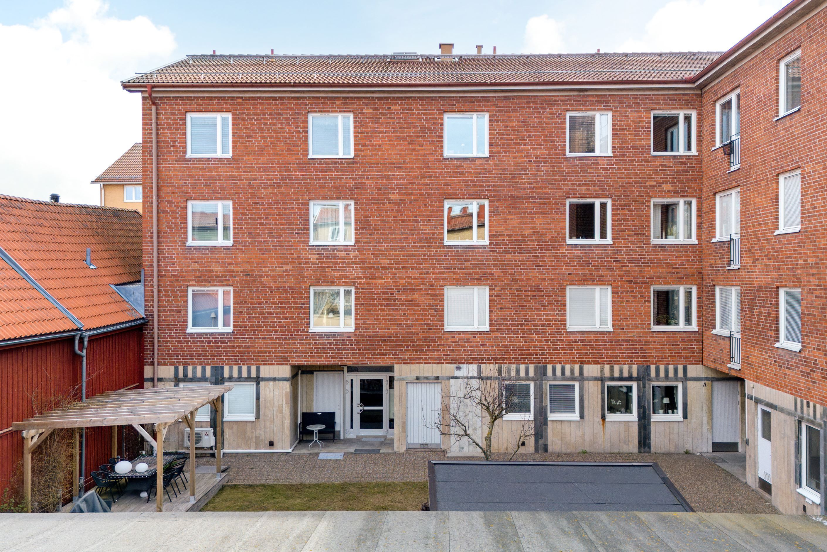 Jättefin innergård med cykelskjul och pergola