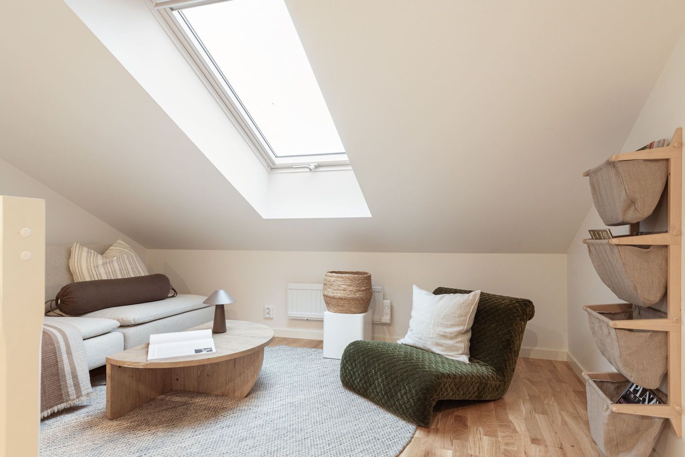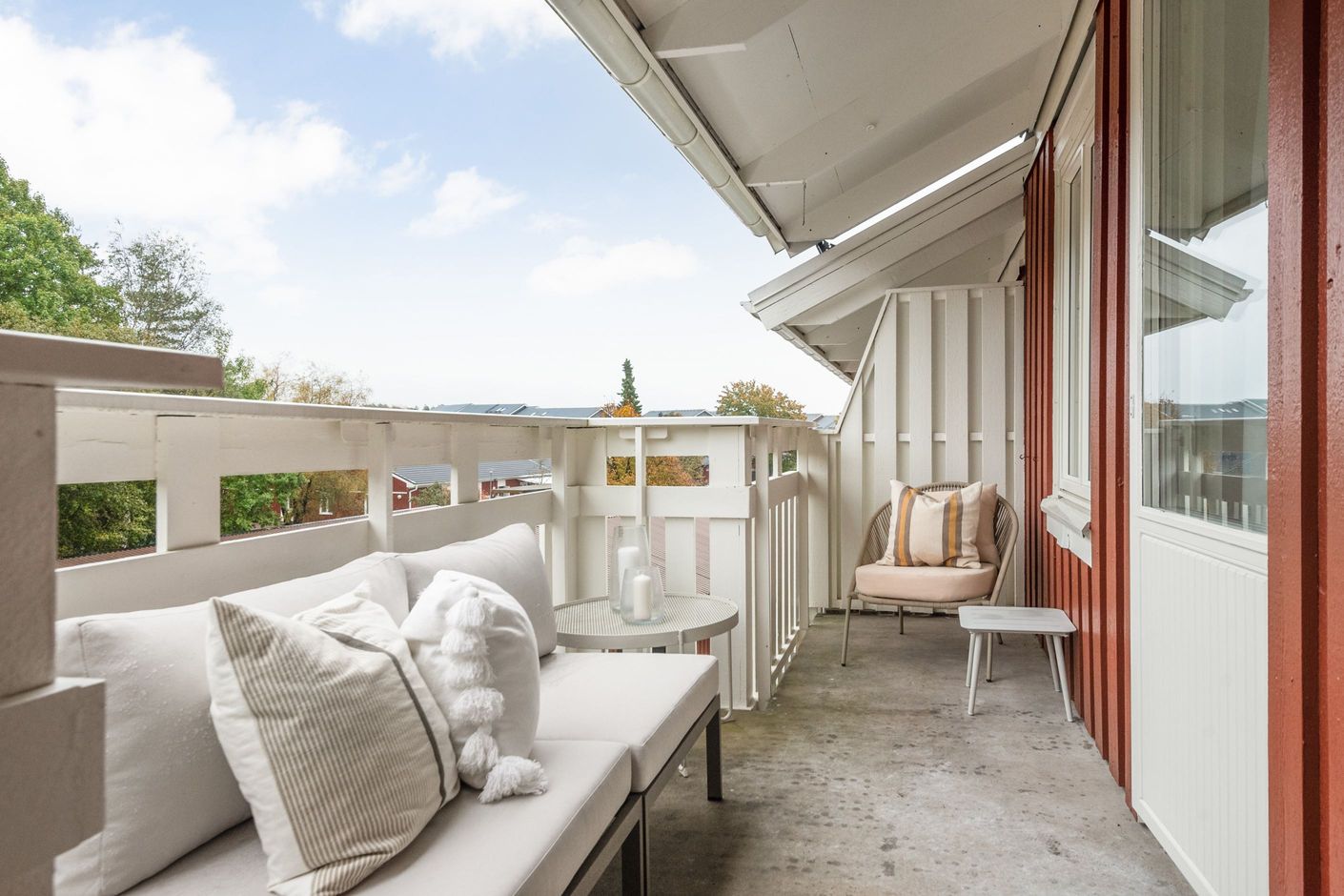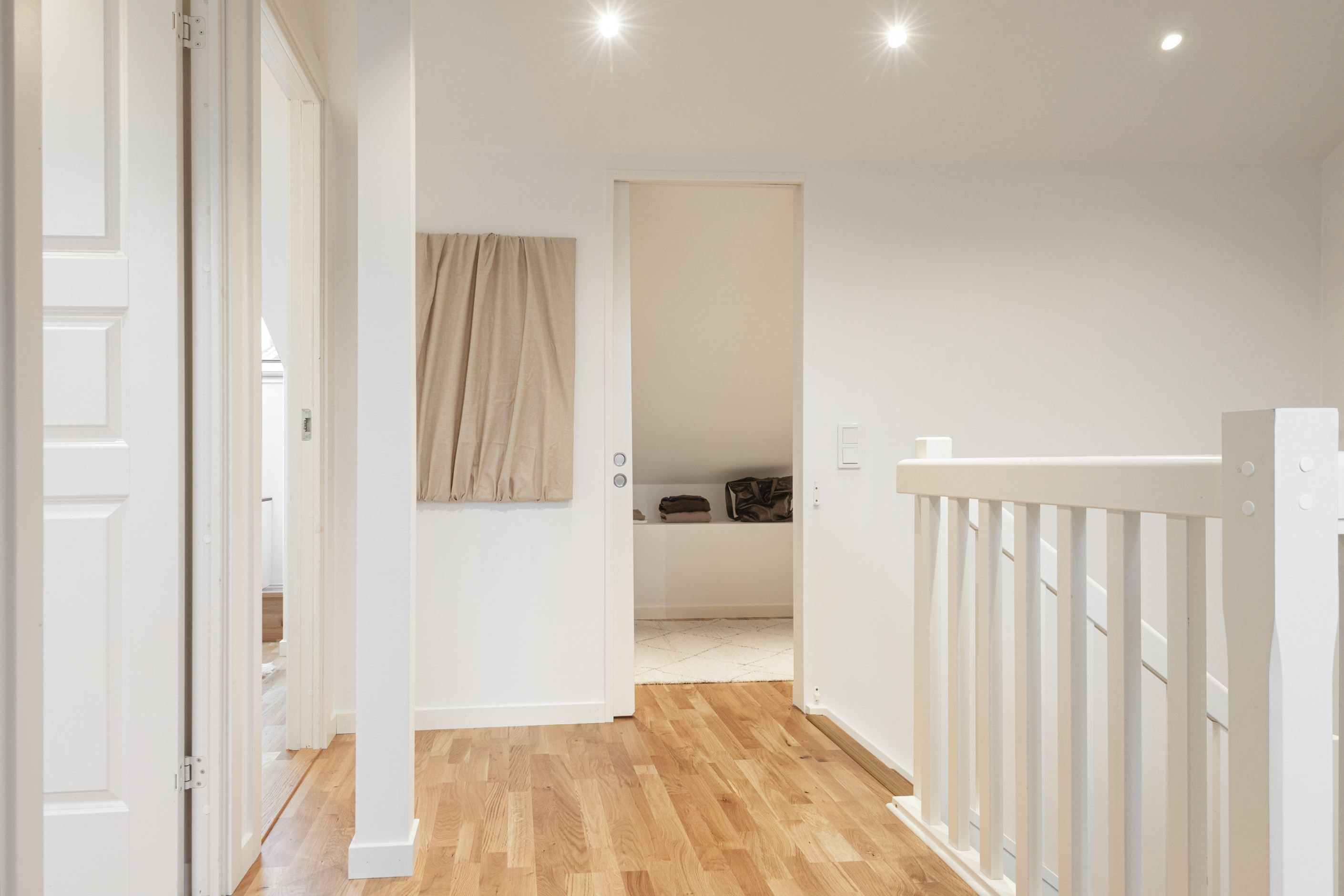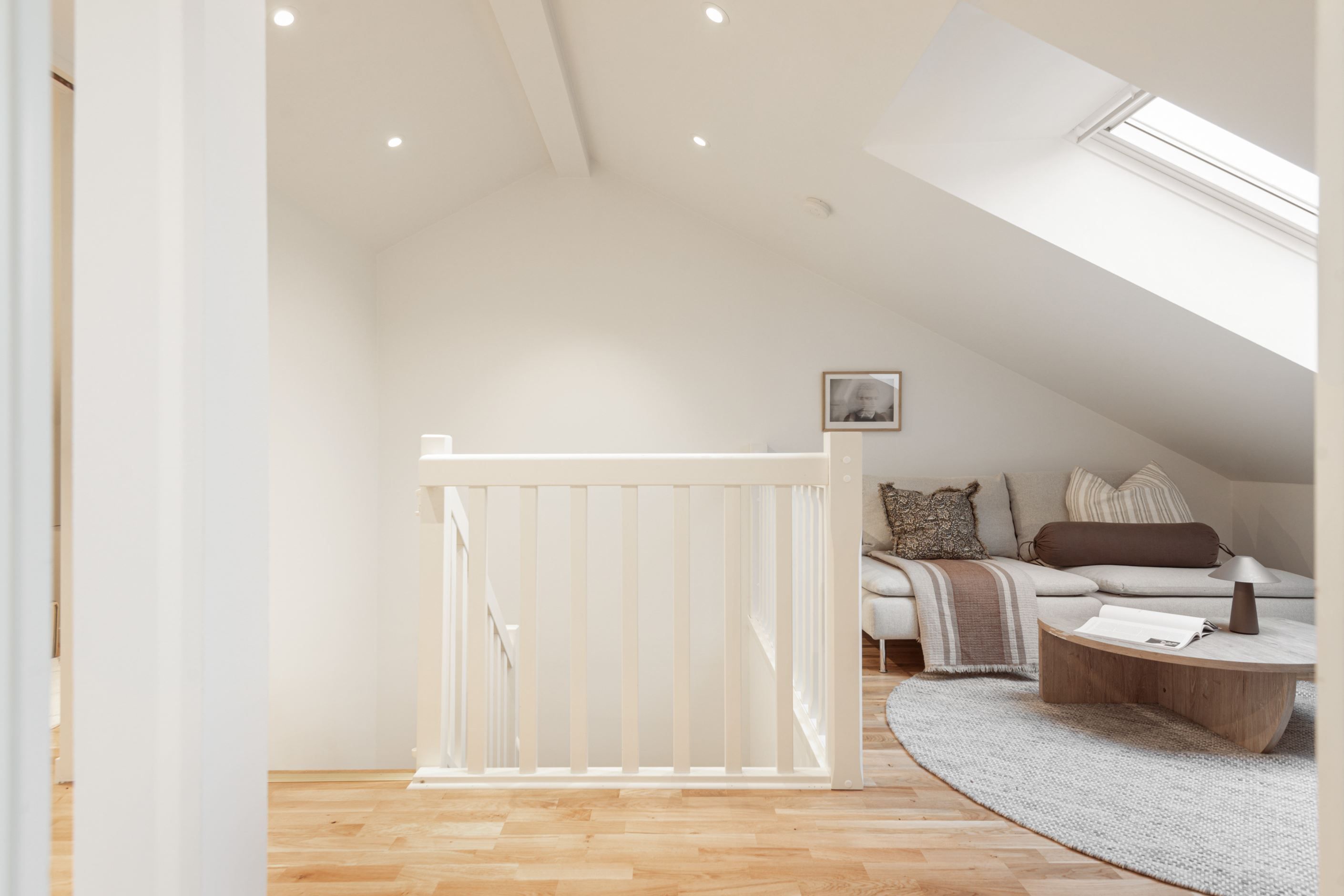 Planlösningen är genomtänkt med tre sovrum, varav två med takfönster som släpper in generöst ljus. Här finns även ett smakfullt väggkaklat badrum med badkar och kombinerad tvättavdelning, samt två härliga uteplatser – en rymlig balkong i högt läge och en trivsam entrébalkong.