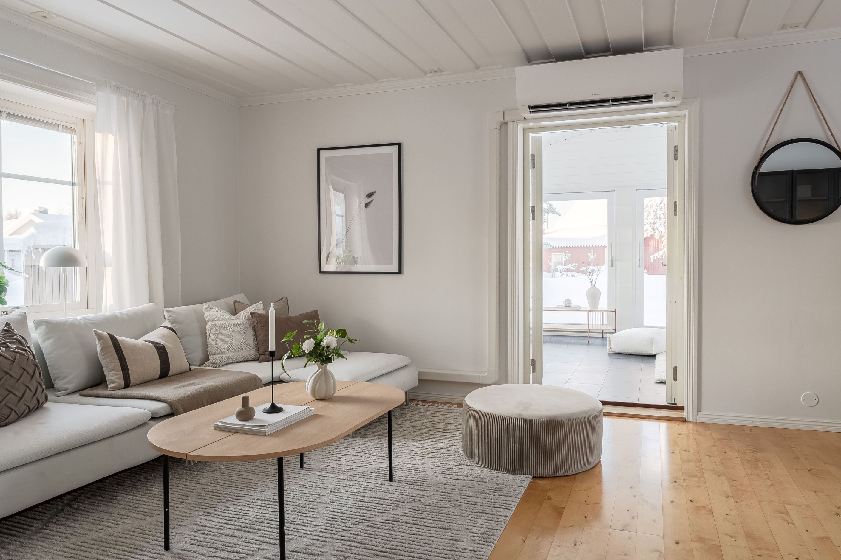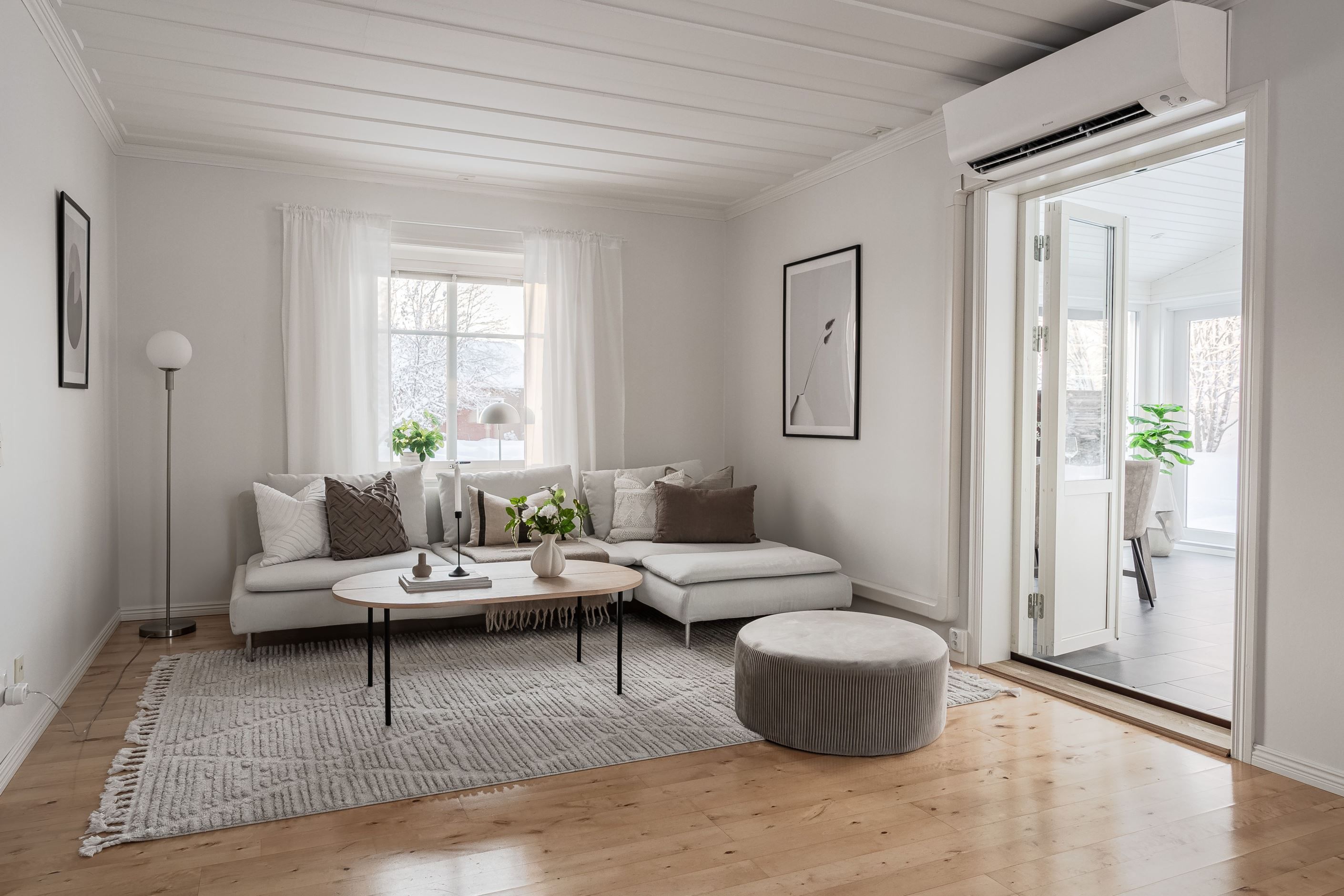 Här välkomnas du genom att kliva in i en ljus och öppen hall med en vacker kakelugn som ger en härlig mysfaktor och extra värme de kallare dagarna. Följt av en öppen och trivsam planlösning där både vardagsrum och uterummet definitivt är bostadens samlingspunkt. Bostaden erbjuder ett luftigt och trevligt kök som tack vare sin generösa yta ger utrymme även för det större sällskapet. Genomgående i hela bostaden finner man fina materialval och ljusa ytskikt.