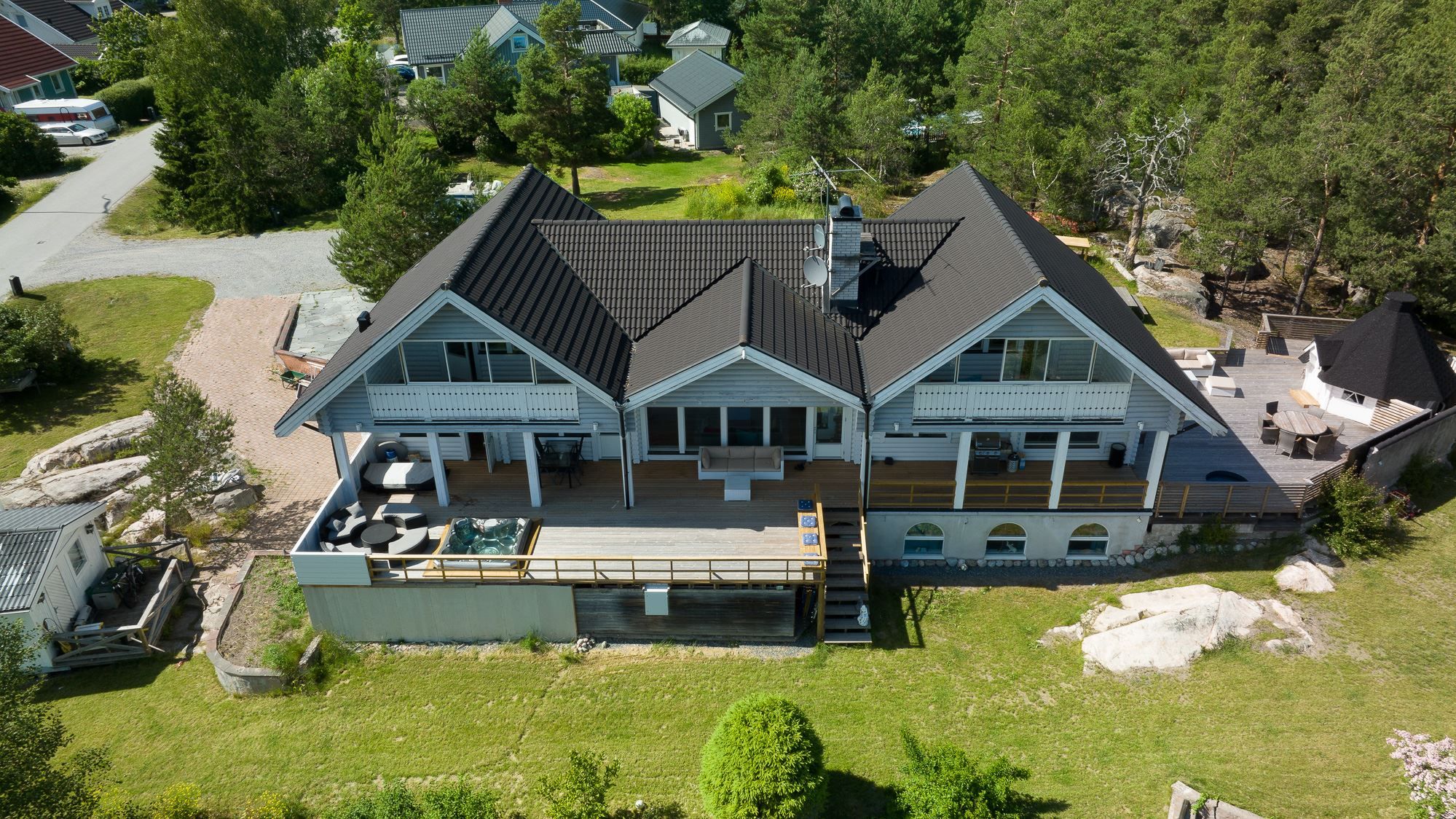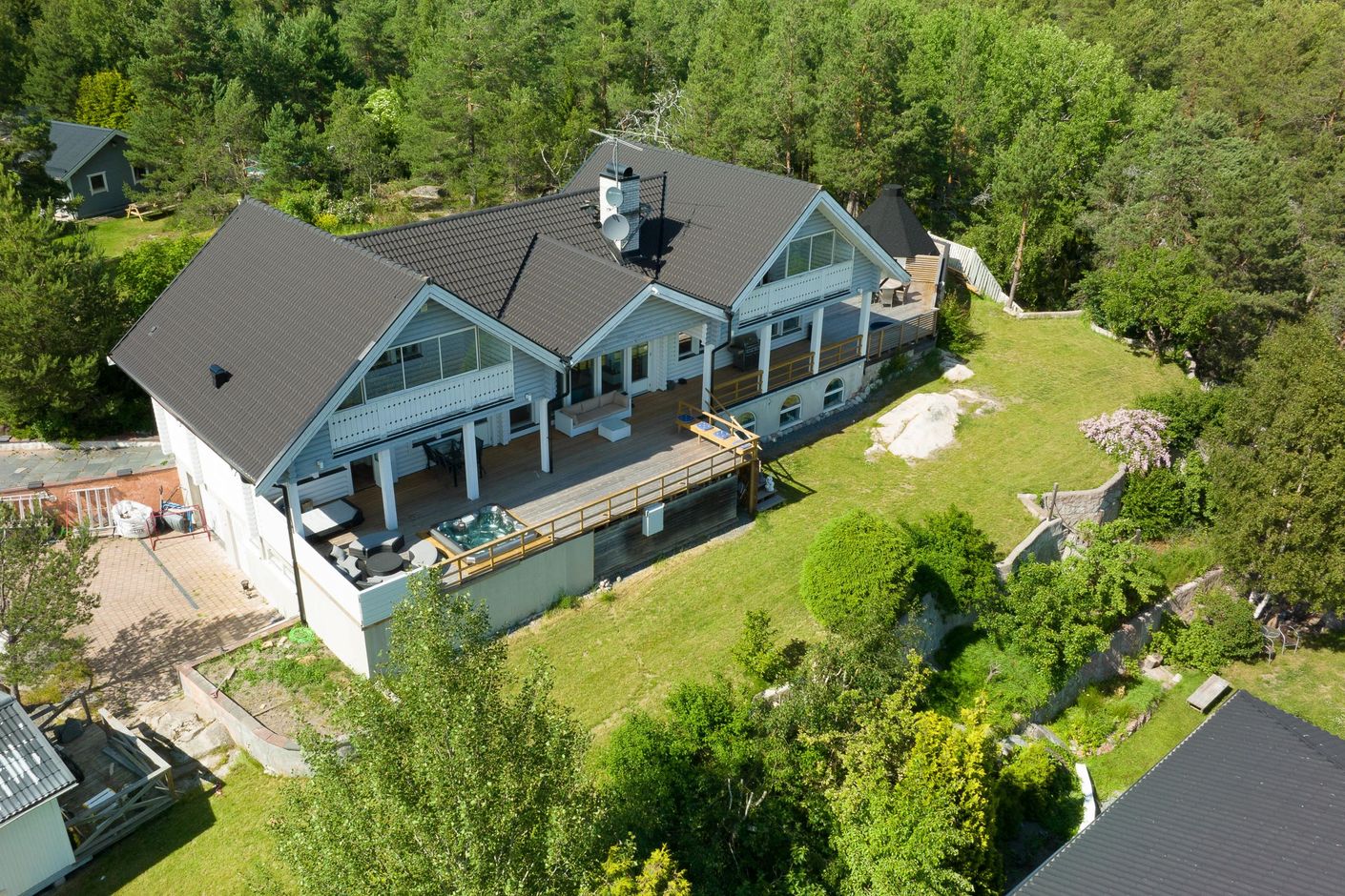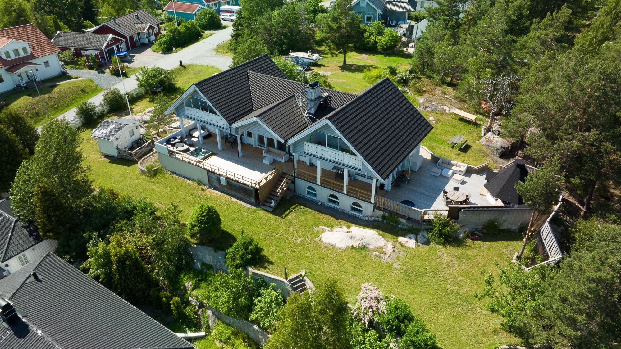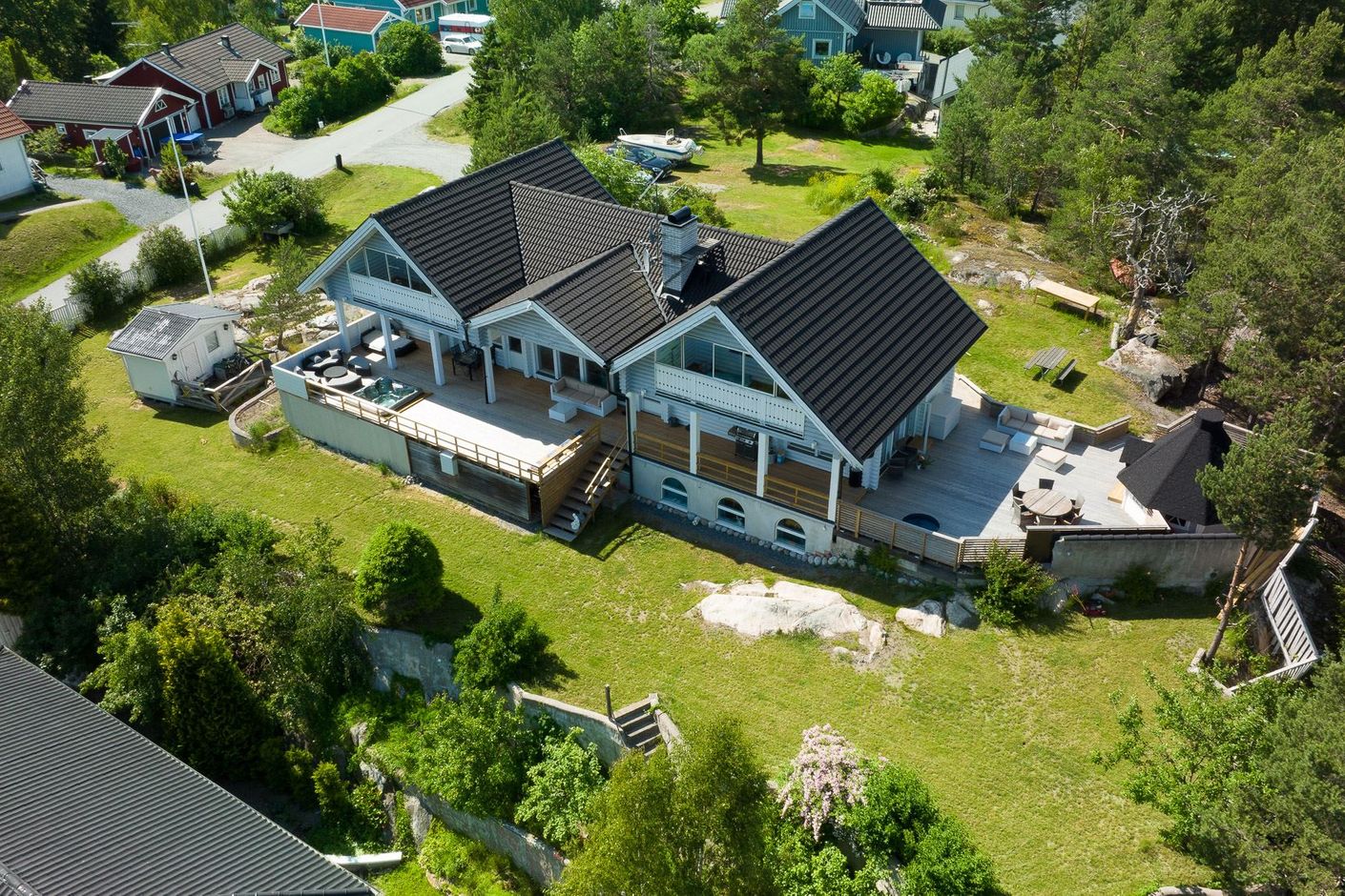 Med ett av Skärgårdsstads högsta lägen vilar detta maffiga och väl tilltagna örnnäste med en totalarea om 350 kvm. Detta herrgårdsliknande hus, som är uppfört 2005, präglas av ljus & rymd samt stora öppna sällskapsytor såväl in- som utvändigt. Det höga läget gör att man får sol från morgon till kväll samtidigt som man ser ut över havet. Den stora trädäckade terrassen har gott om plats för stora loungegrupper, matbord, solstolar etc. Här finns ett lusthus med eldstad samt ett nedsänkt spa-bad placerat. Tomten, som är om 1417 kvm, består till största del av plan och fin trädgårdstomt med bergidagen, men har även inslag av viss del naturtomt. Här finns också möjlighet att förvärva en båtplats i Skärgårdsstad Hamn (klass 2).