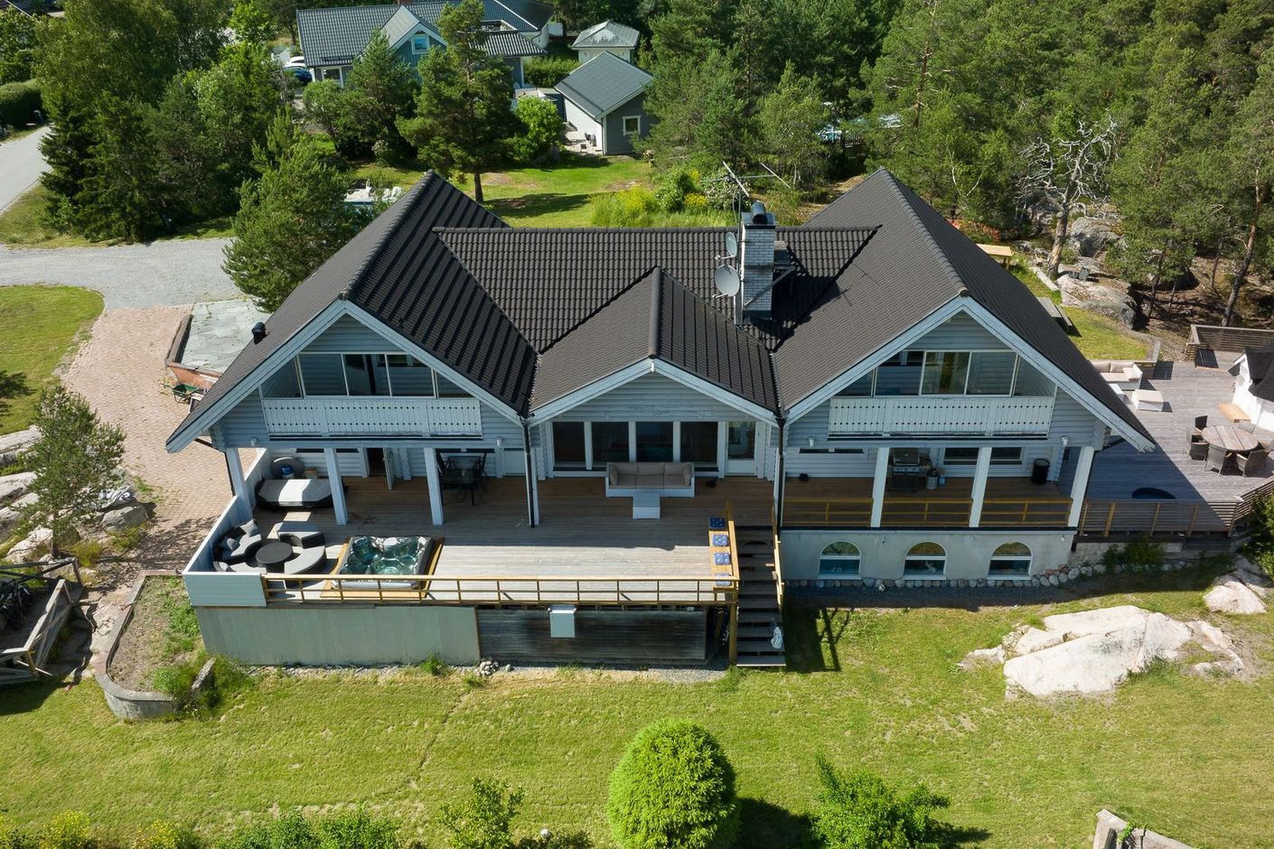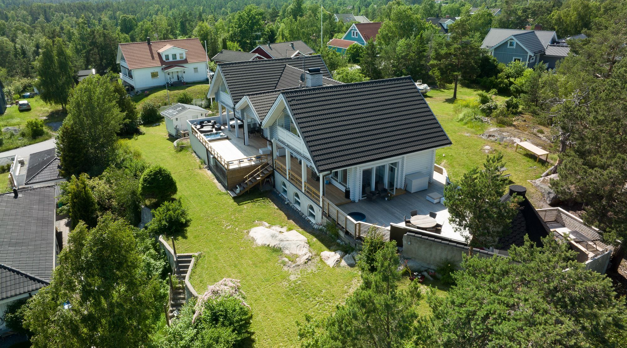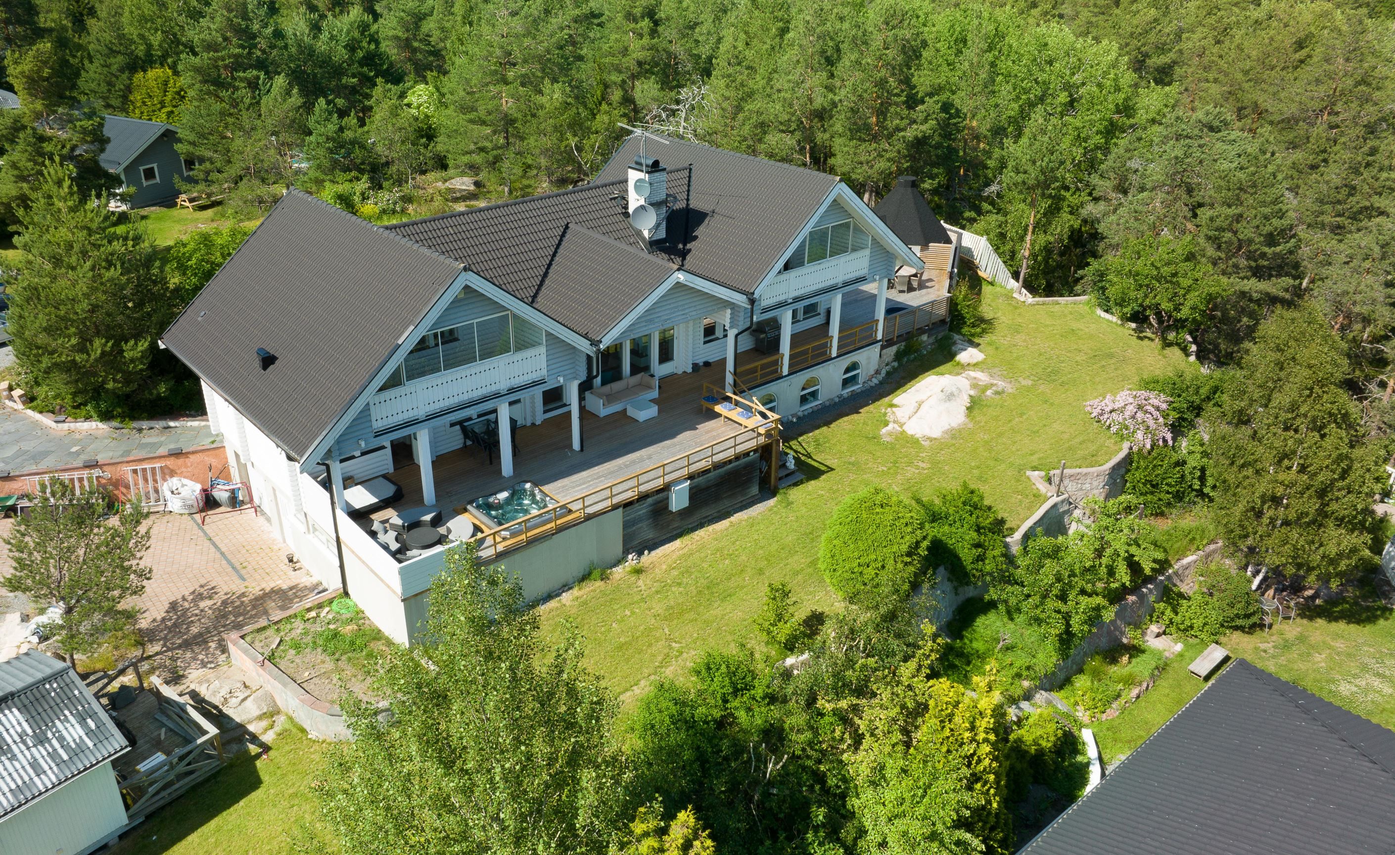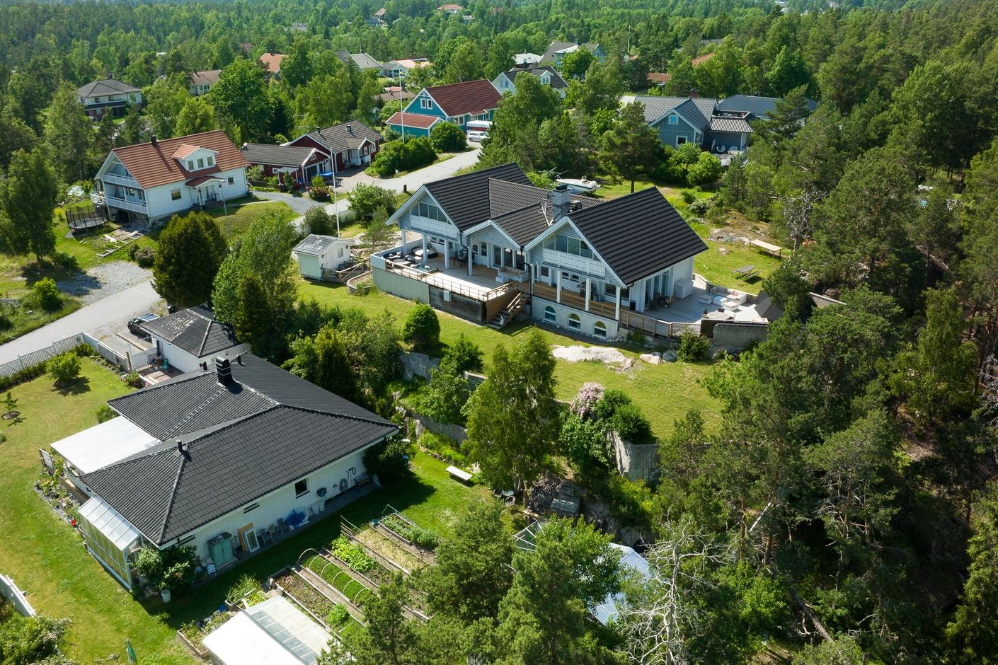 Med ett av Skärgårdsstads högsta lägen vilar detta maffiga och väl tilltagna örnnäste med en totalarea om 350 kvm. Detta herrgårdsliknande hus, som är uppfört 2005, präglas av ljus & rymd samt stora öppna sällskapsytor såväl in- som utvändigt. Det höga läget gör att man får sol från morgon till kväll samtidigt som man ser ut över havet. Den stora trädäckade terrassen har gott om plats för stora loungegrupper, matbord, solstolar etc. Här finns ett lusthus med eldstad samt ett nedsänkt spa-bad placerat. Tomten, som är om 1417 kvm, består till största del av plan och fin trädgårdstomt med bergidagen, men har även inslag av viss del naturtomt. Här finns också möjlighet att förvärva en båtplats i Skärgårdsstad Hamn (klass 2).