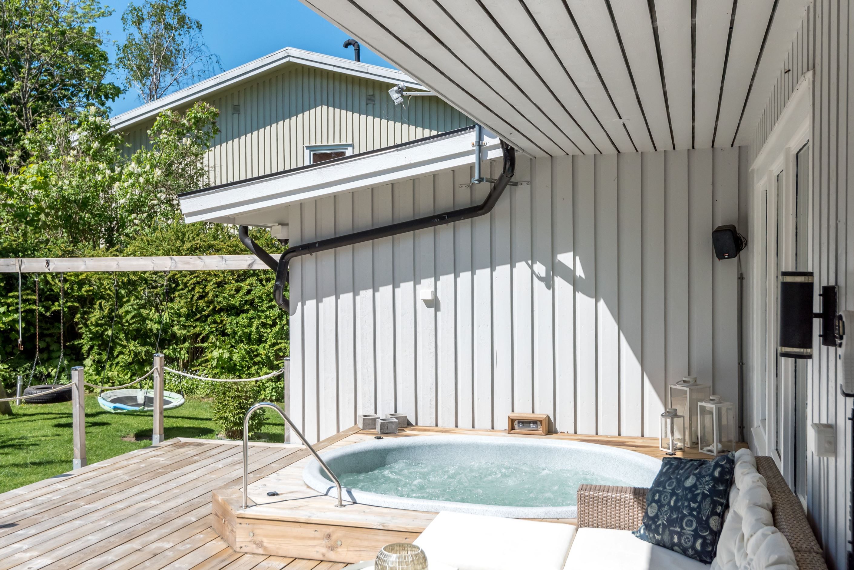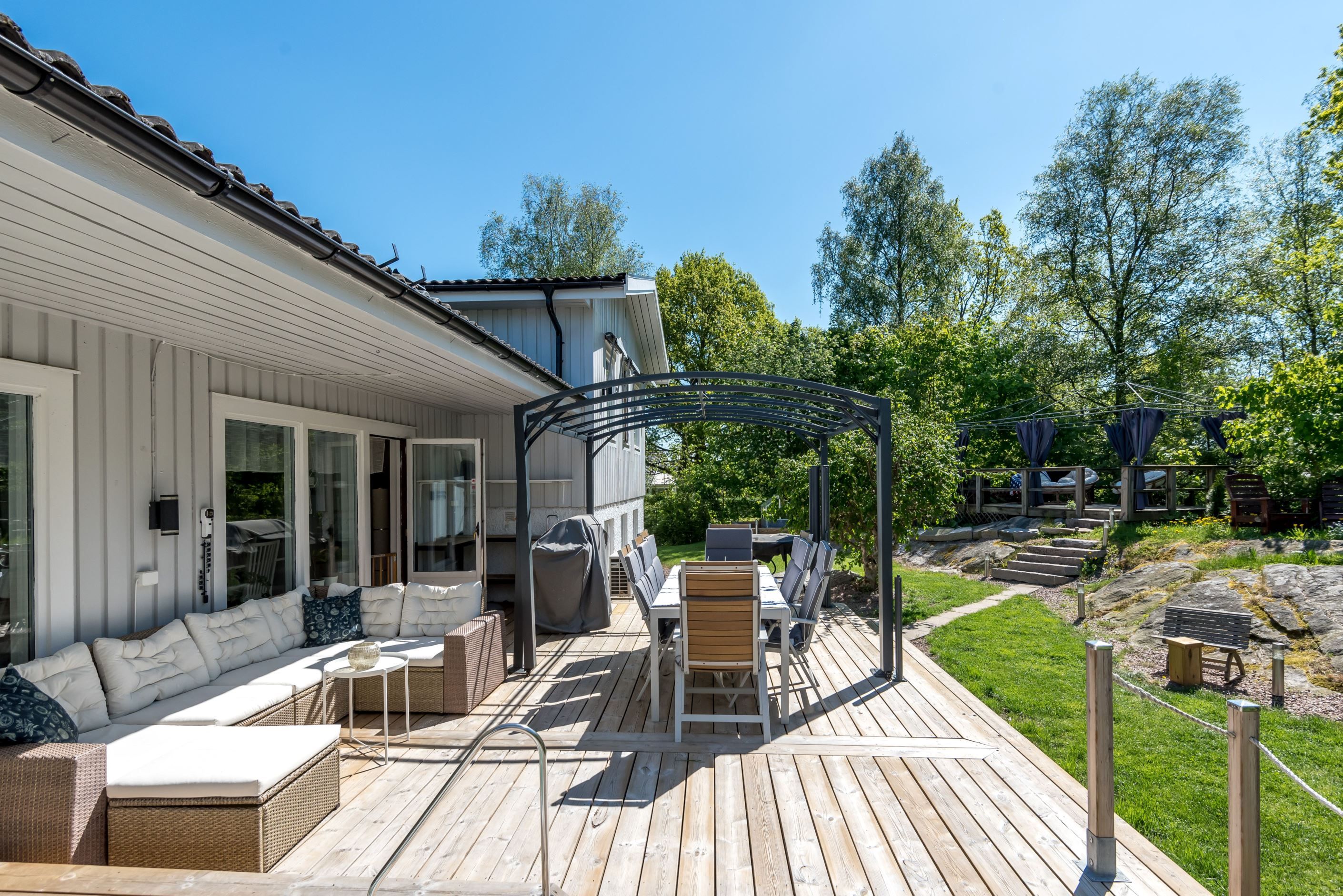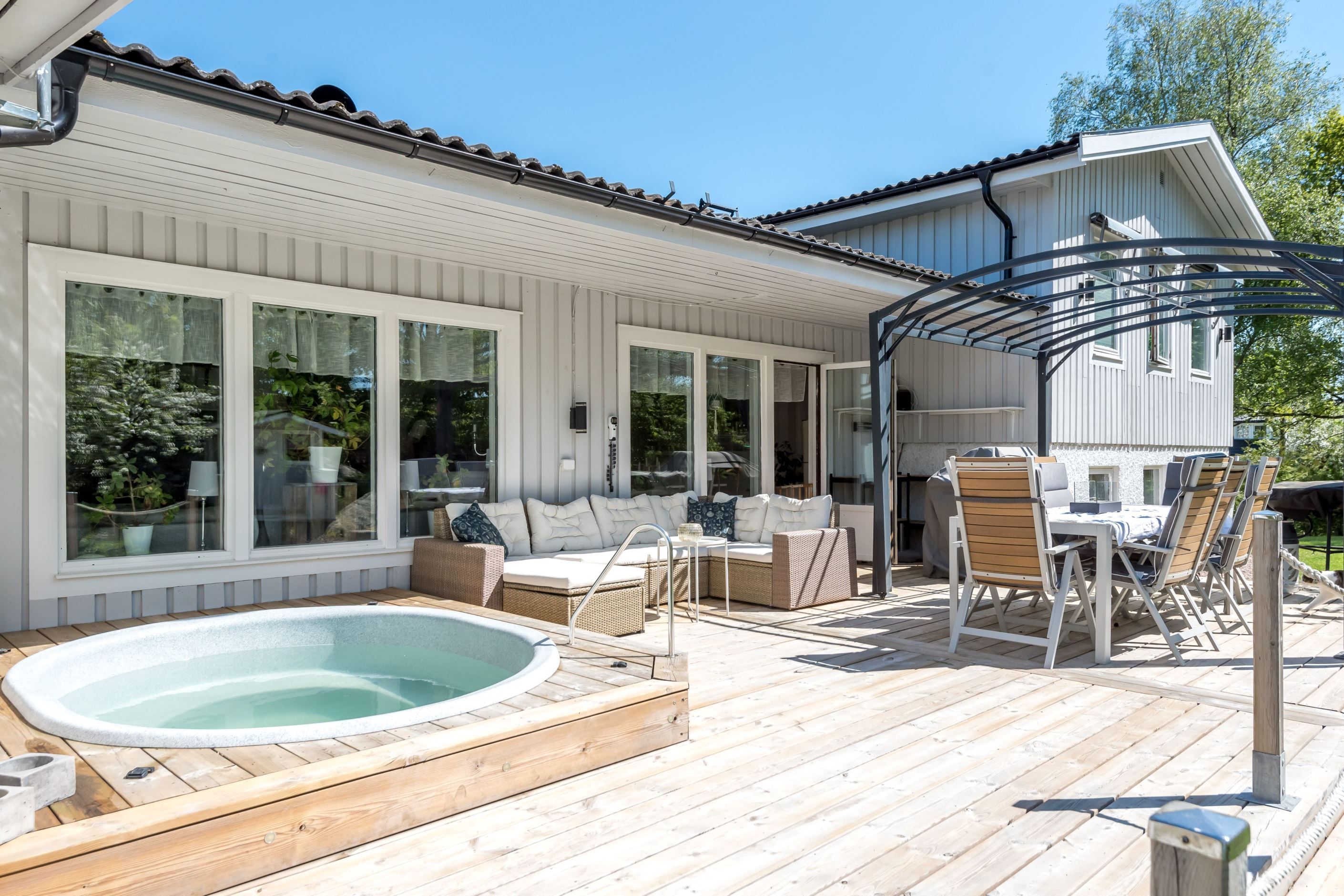 Den soliga altanen byggd 2021 i anslutning till vardagsrummet måste upplevas på plats. Här finns bland annat en pool, stora sociala ytor och en underbar trädgård. Det vidbyggda garaget är uppvärmt via en luft-/luftvärmepump och har en egen ingång från baksidan.