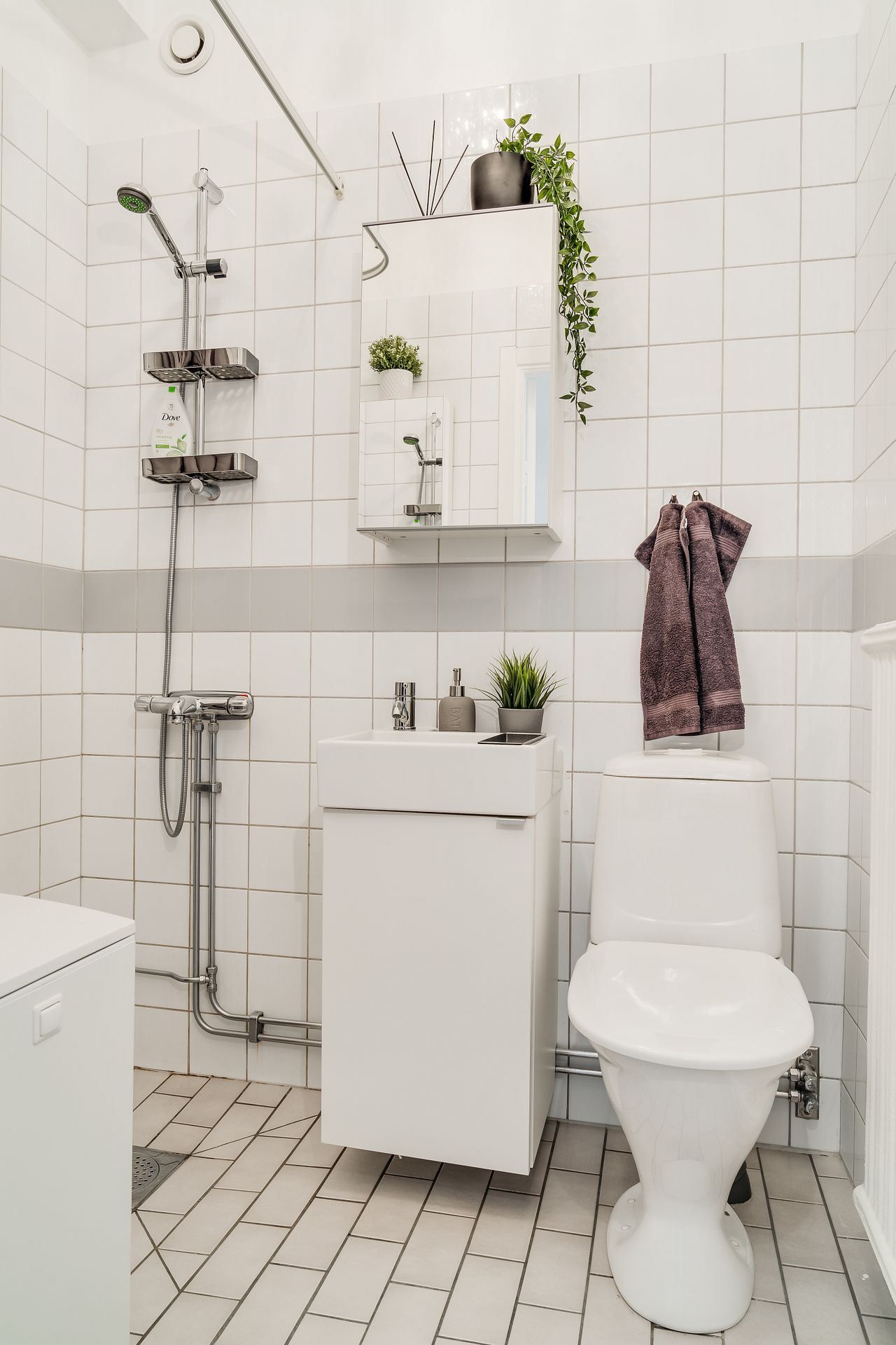 Rakt fram i hallen, mellan kök och vardagsrum ligger sedan lägenhetens renoverade badrum. På golvet finner du ett ljust grått klinker med golvvärme och väggarna är beklädda med vitt kakel. Vore inte detta nog så har du också tillgång till din egen tvättmaskin samt en vit kommod och tillhörande spegel ovanför, perfekt för småförvaring.