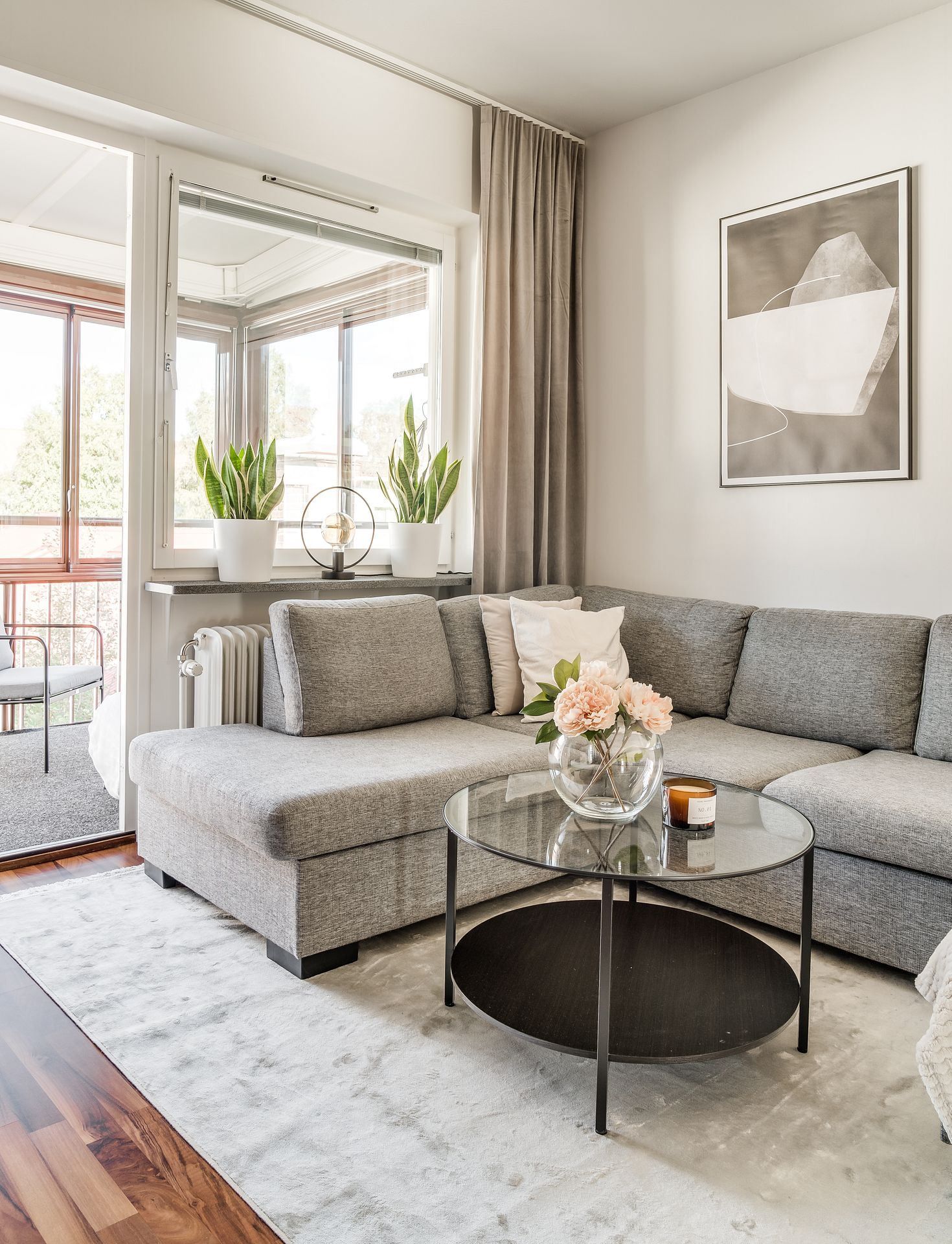 Mitt emot köket finner du ett gediget vardagsrum där du kan möblera med både en större soffgrupp med tillhörande soffbord och tv-möbel samtidigt som ett större matsalsbord ryms där du kan hålla mer formella middagar med vänner och familj. Via vardagsrummet når du dessutom bostadens fantastiska inglasade balkong.