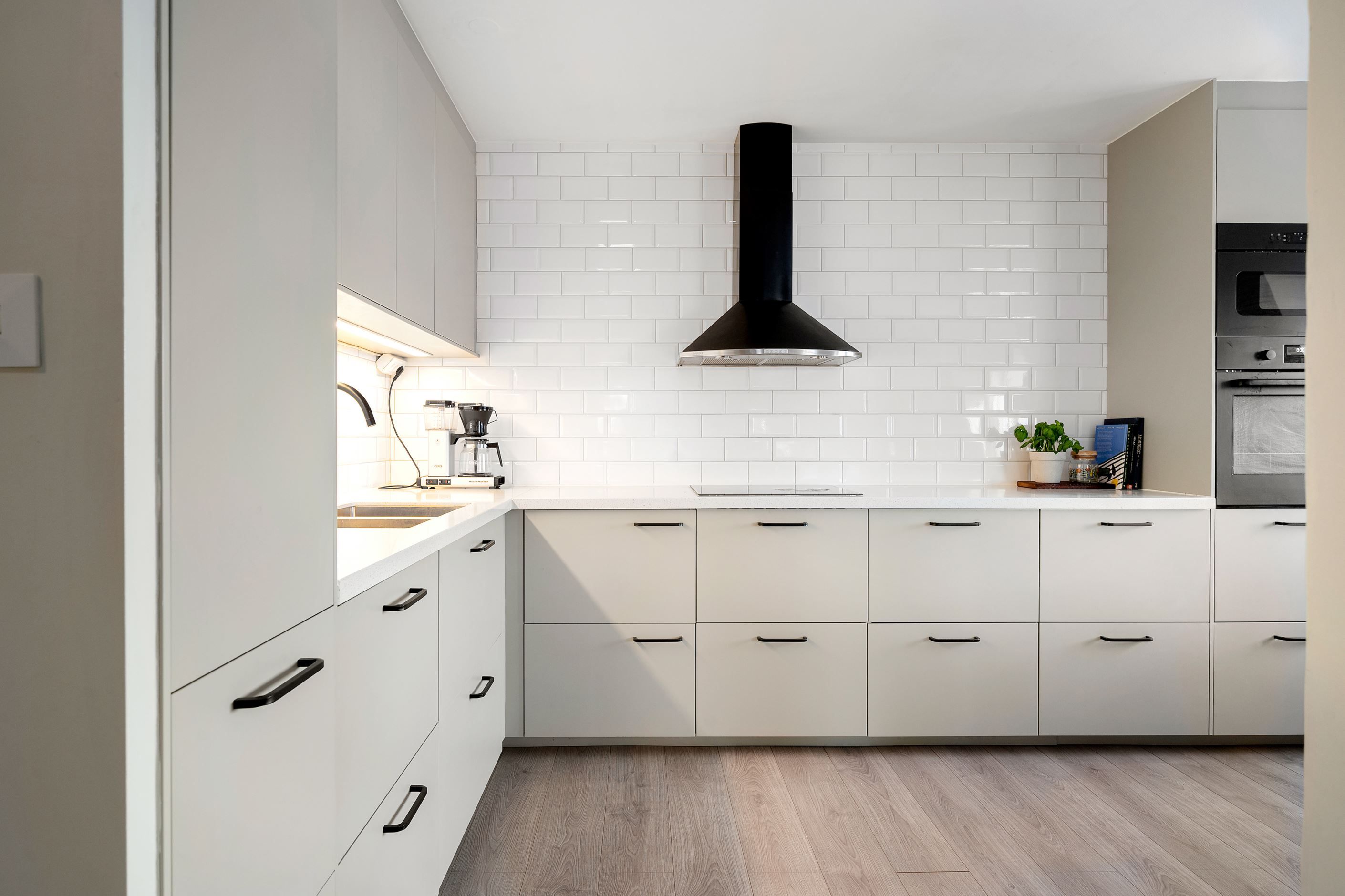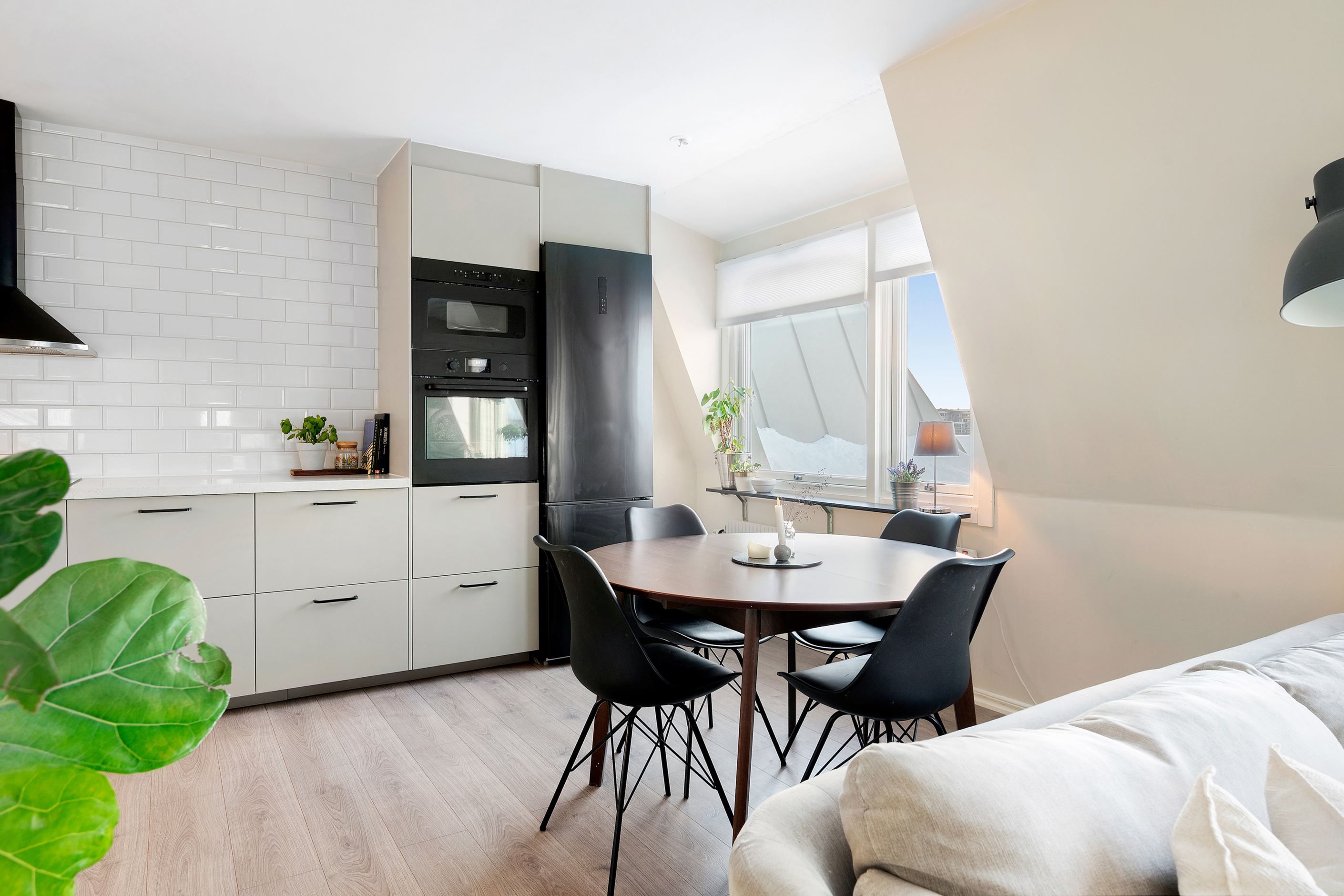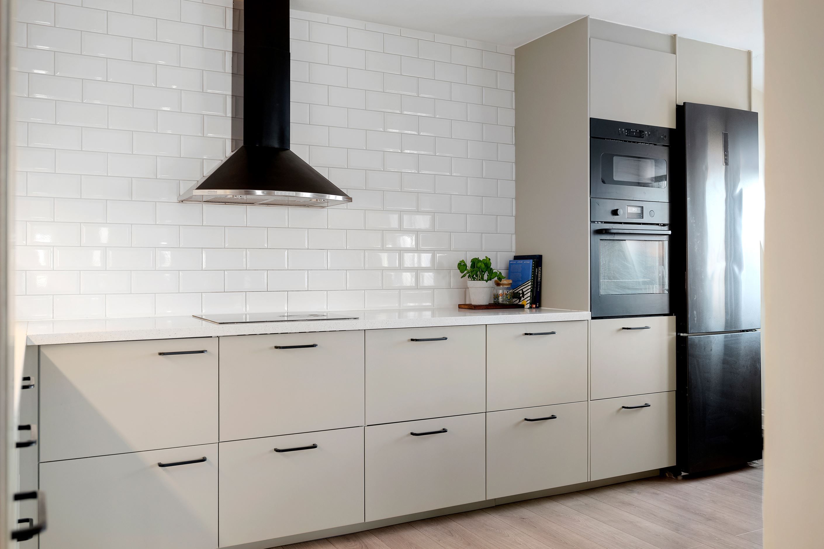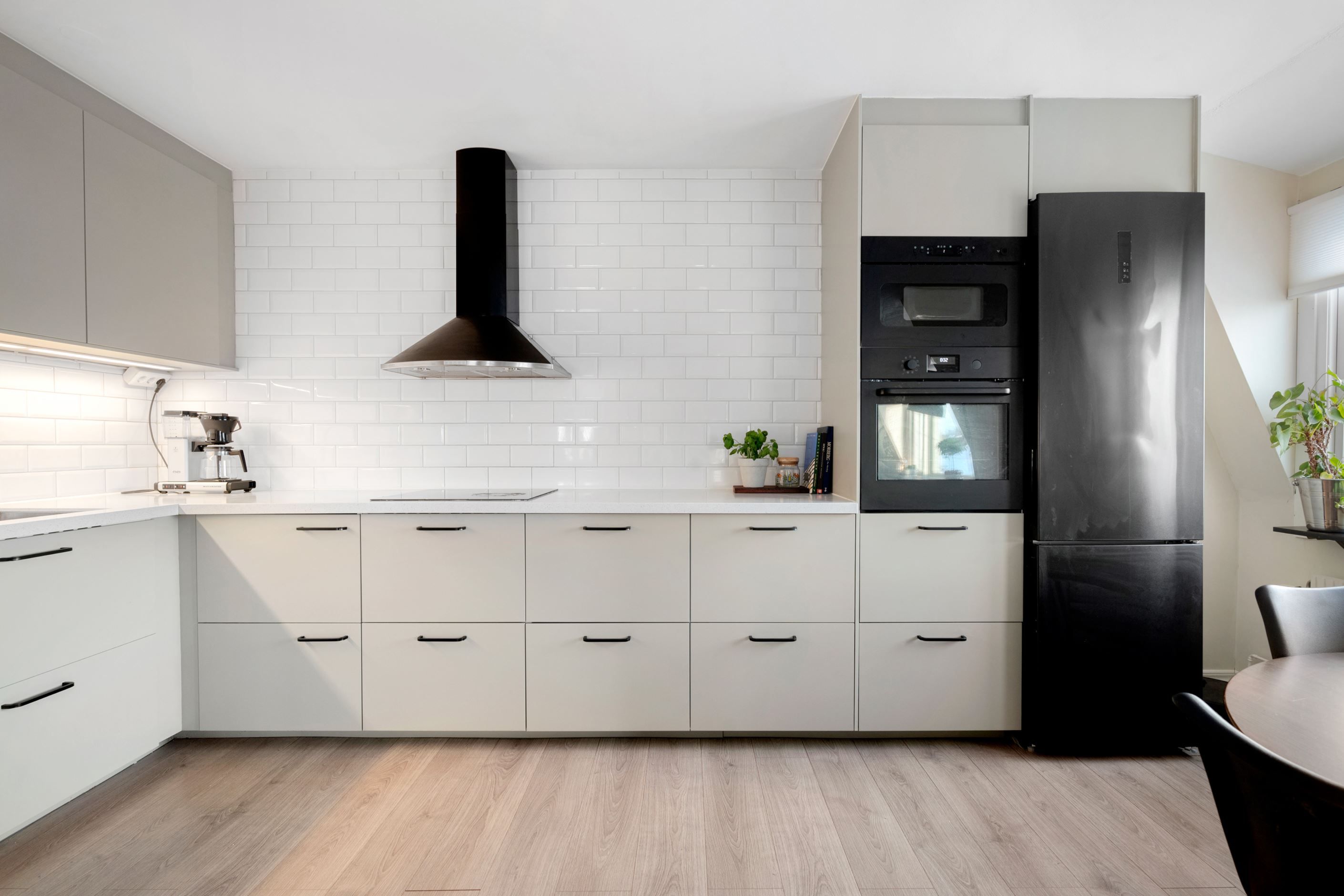 Köket är smakfullt renoverat i en mjuk beige ton med släta luckor, ljus bänkskiva och klassiskt vitt kakel som elegant ramar in arbetsytorna. Den maskinella utrustningen är integrerad och väl genomtänkt, vilket ger ett stilrent uttryck utan att tumma på funktionaliteten. Här finns alla förutsättningar för såväl vardagsmiddagar som trevliga kvällar i gott sällskap.