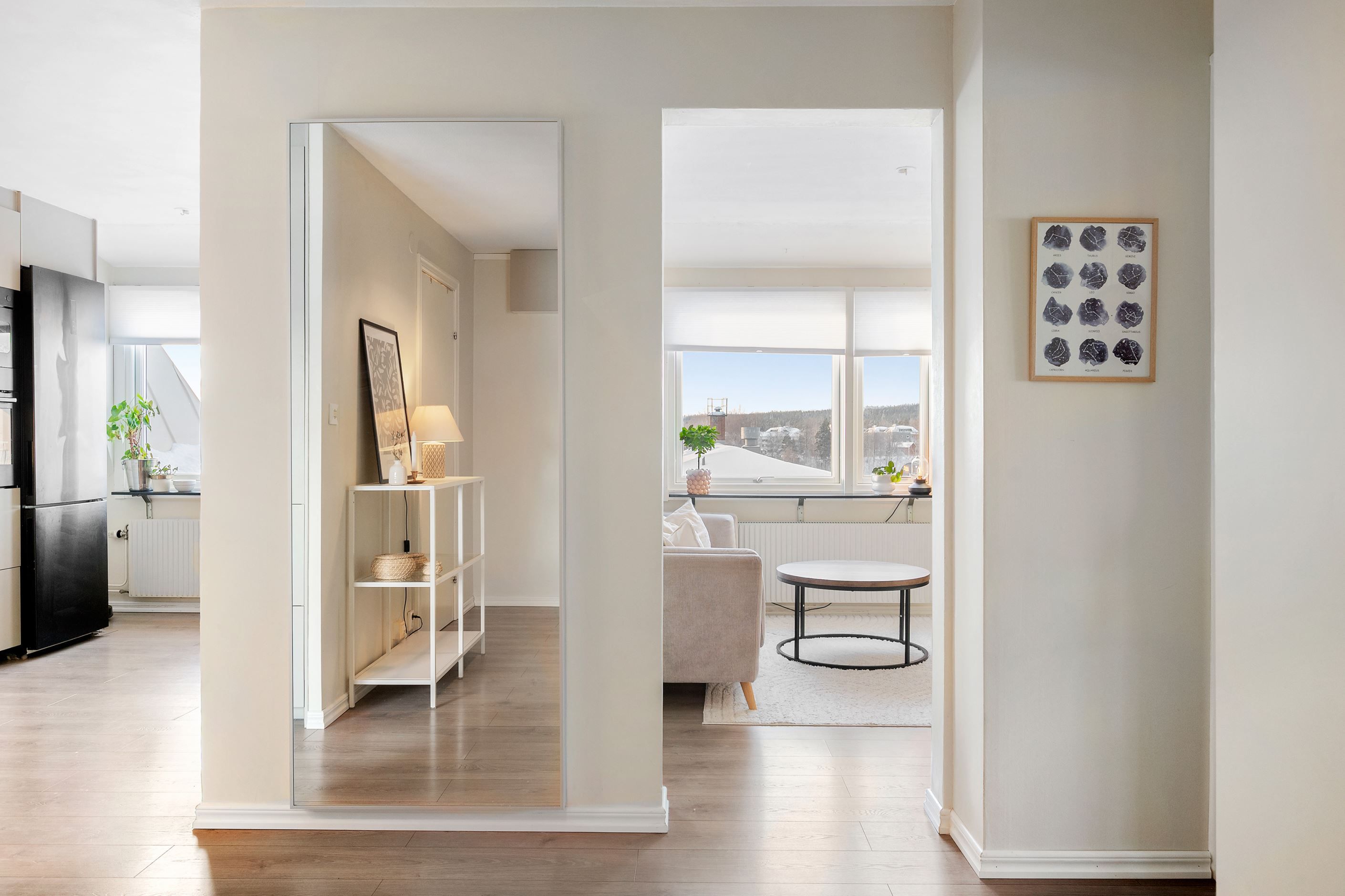 Redan när du kliver in möts du av en ljus och enhetlig känsla där diskreta kulörer och genomtänkta detaljer skapar ett stilrent helhetsintryck. Den öppna planlösningen mellan kök och vardagsrum ger bostaden en naturlig samlingspunkt – en social och trivsam yta där ljuset flödar in genom flera generösa fönsterpartier. Här skapas en härlig rymd som gör hemmet både luftigt och levande, oavsett årstid.