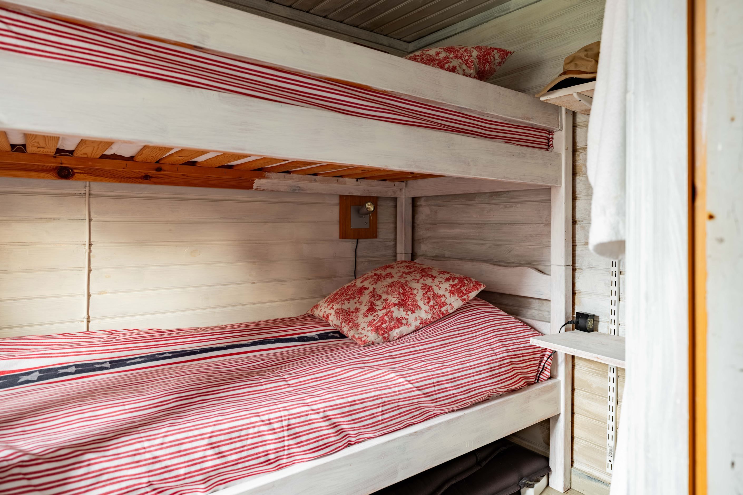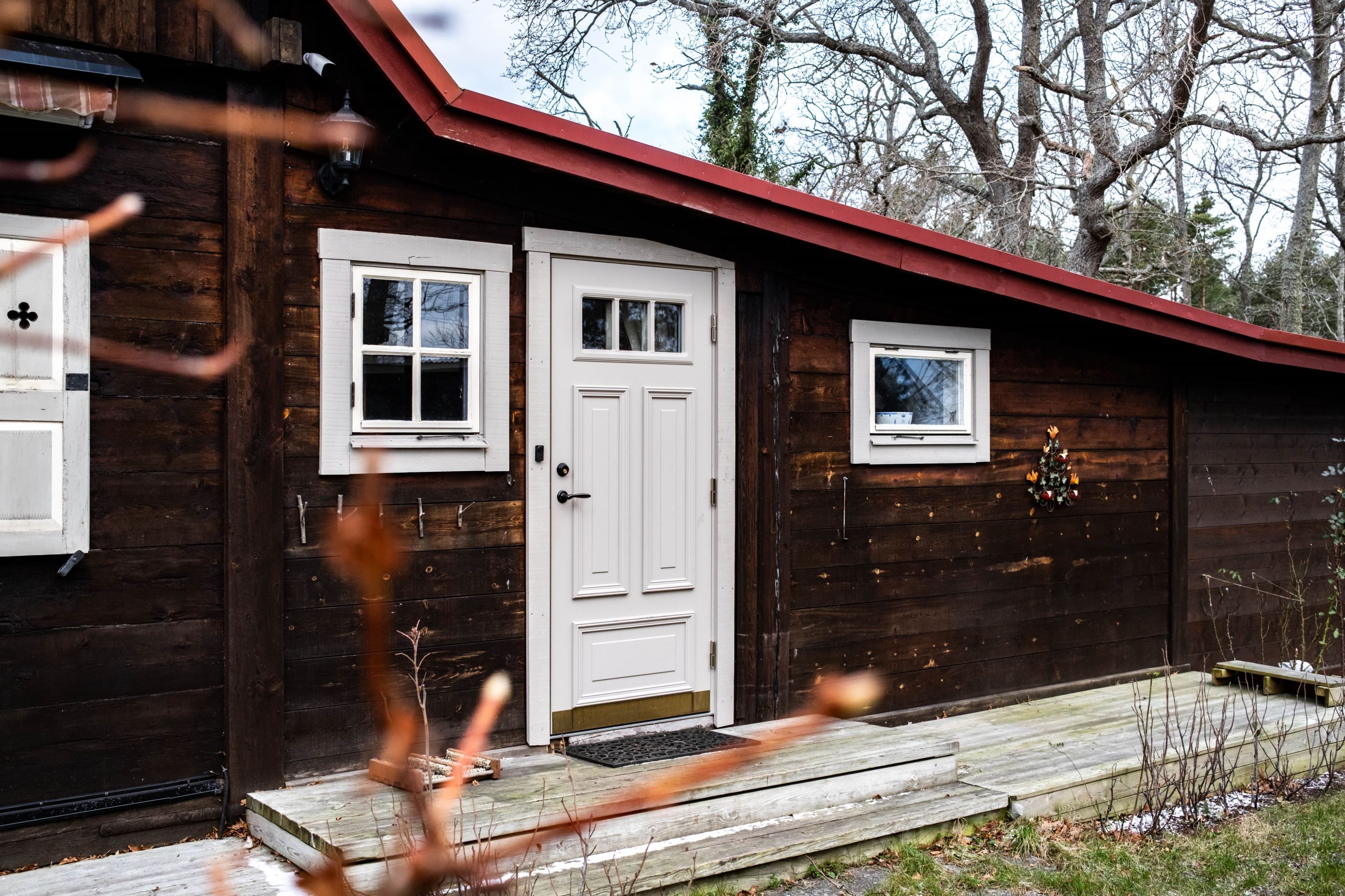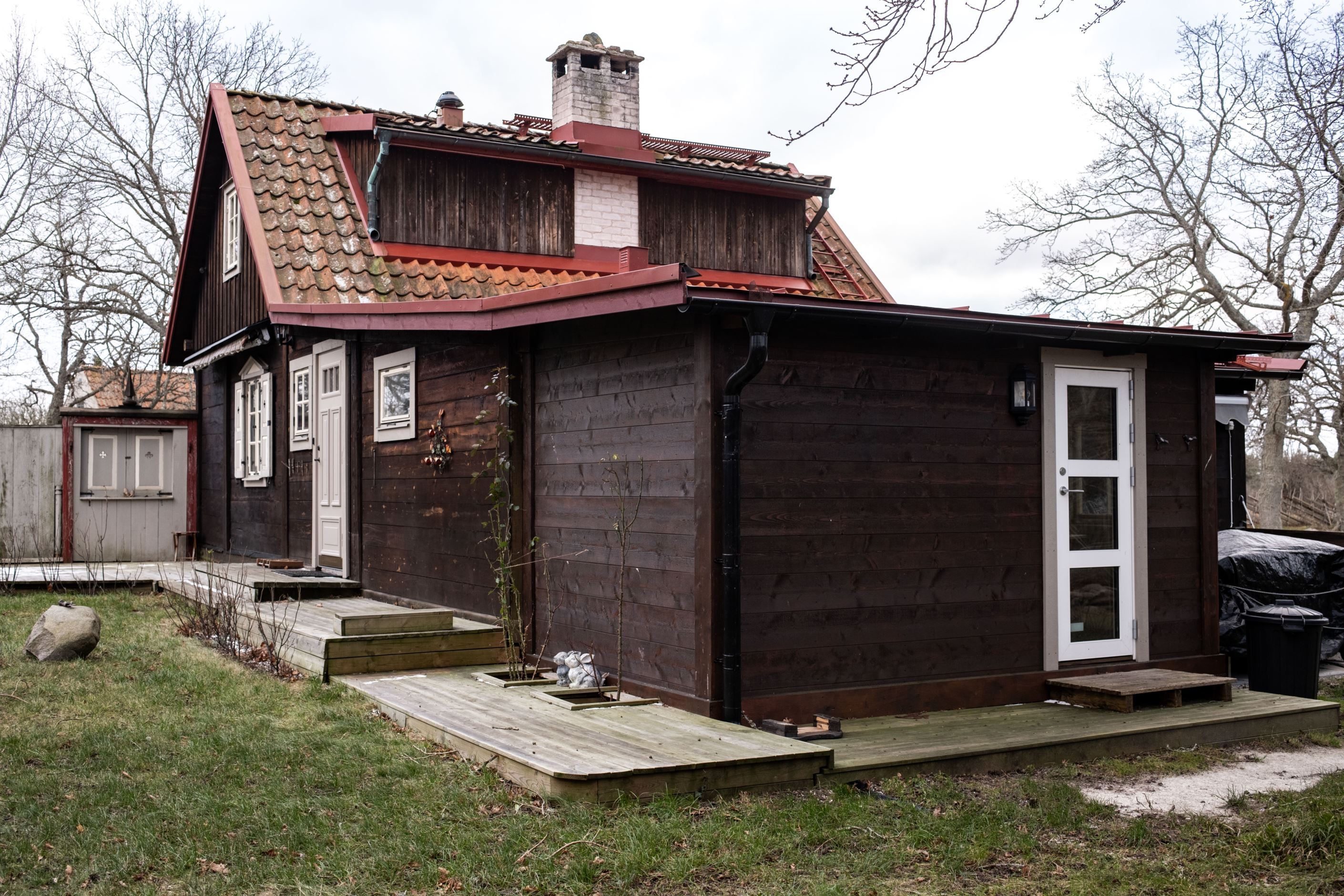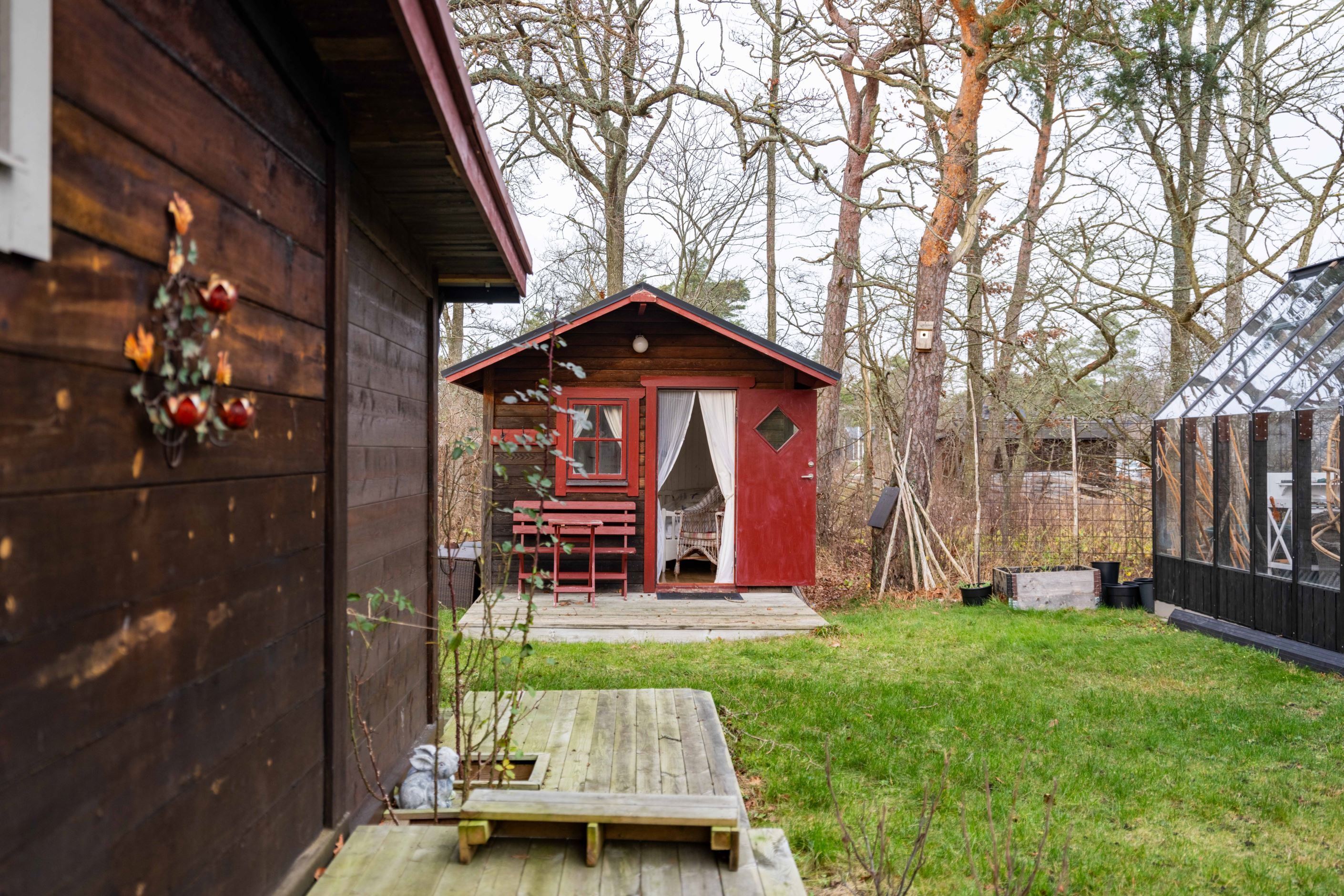 För gäster finns tre separata sovstugor, vilket gör att alla kan bo nära men ändå ha sitt eget. Fastigheten är fylld av små, älskvärda lösningar – som platsen bakom barnens sovstuga där tänder borstas i kvällsljuset. Medan man väntar på sin tur sätter man sig på bänken. En enkel stund som blir ett minne för livet.