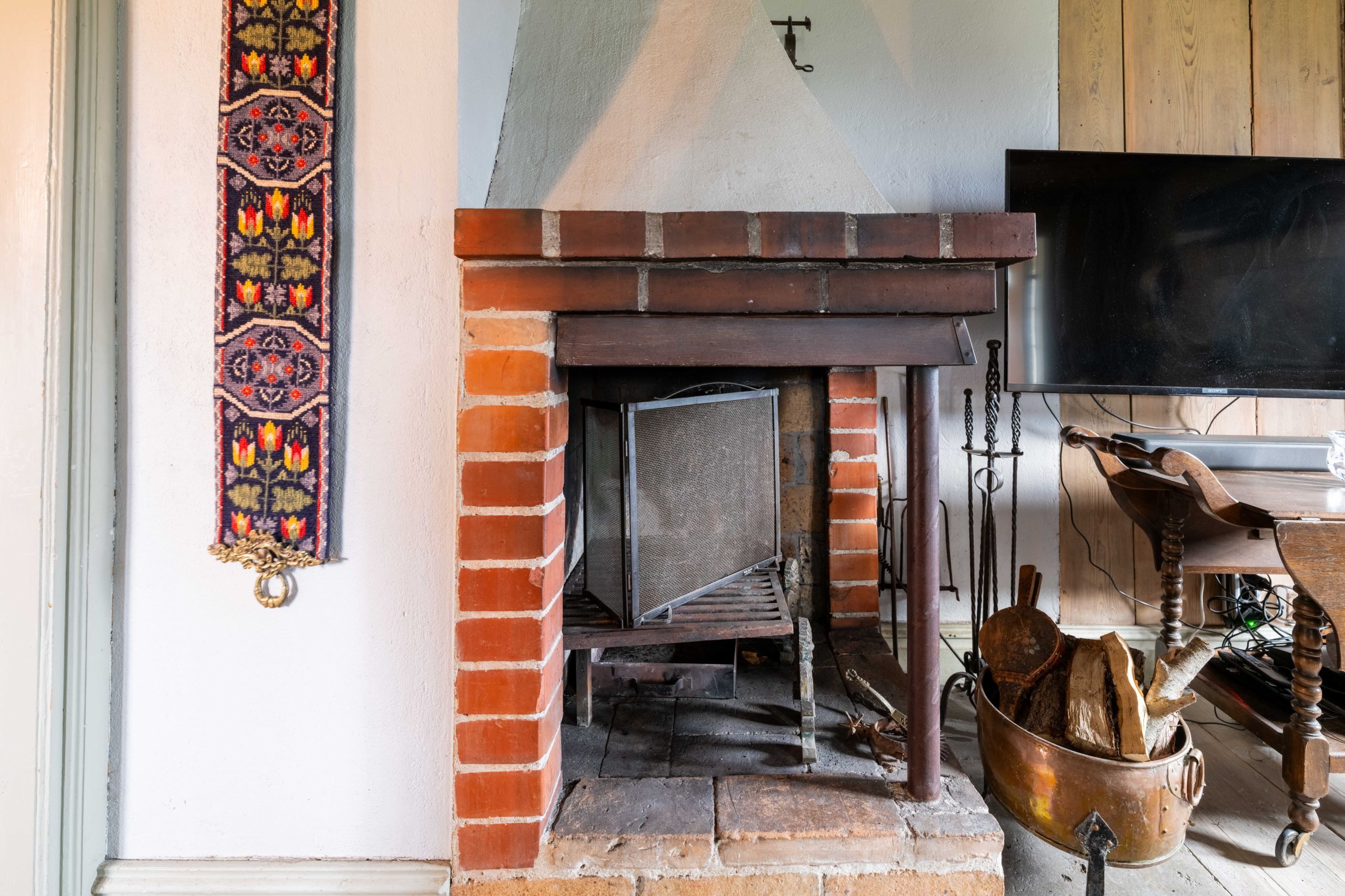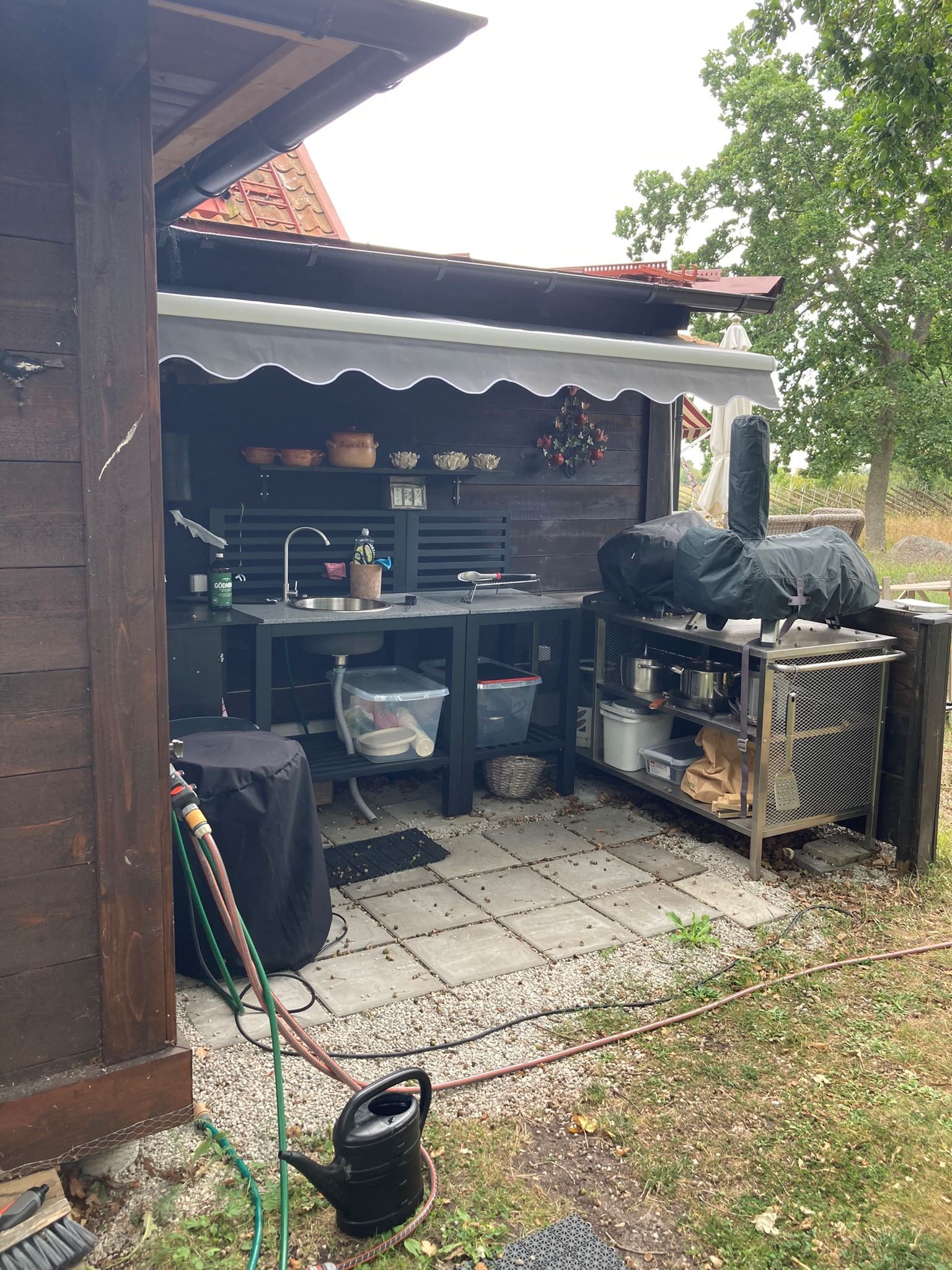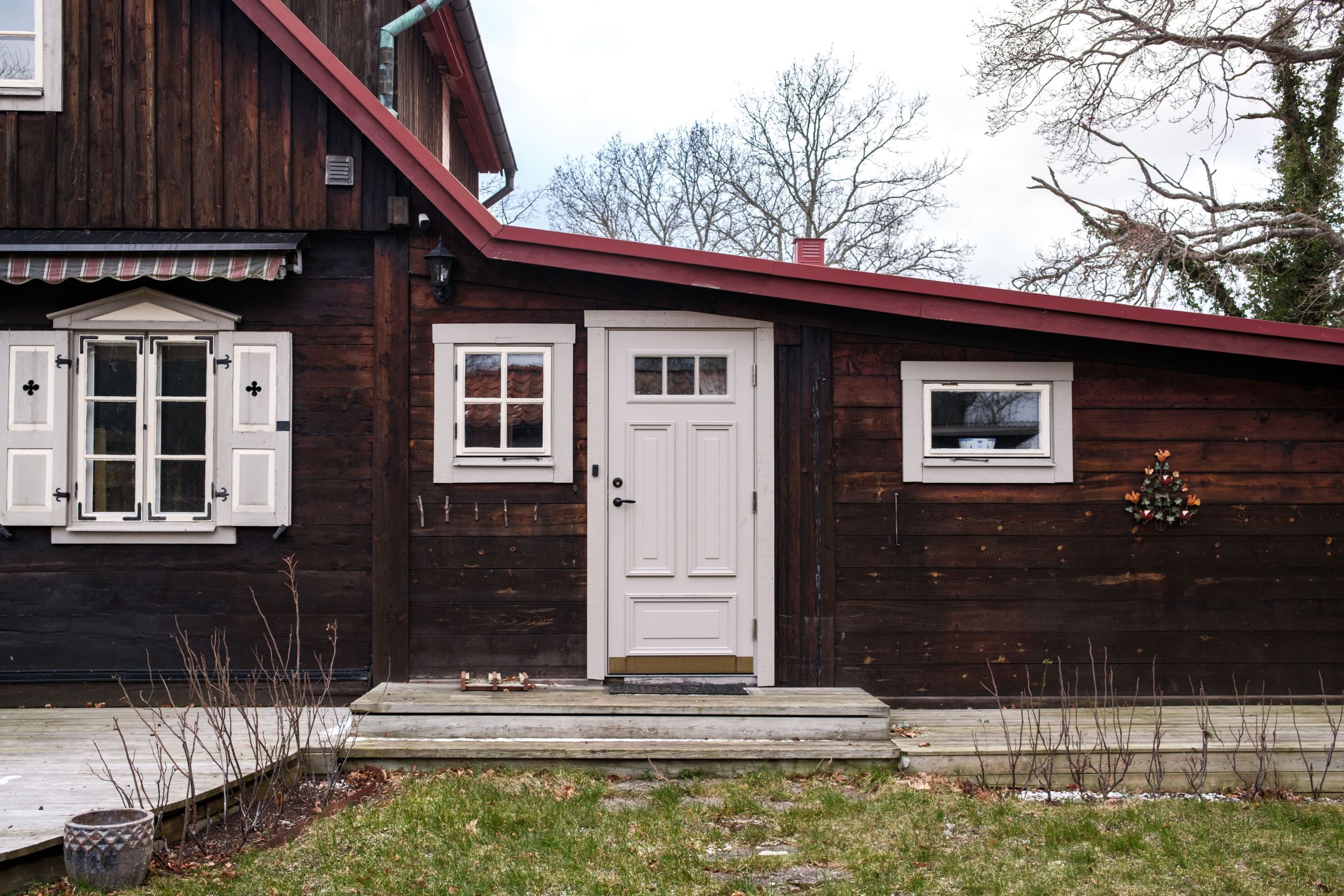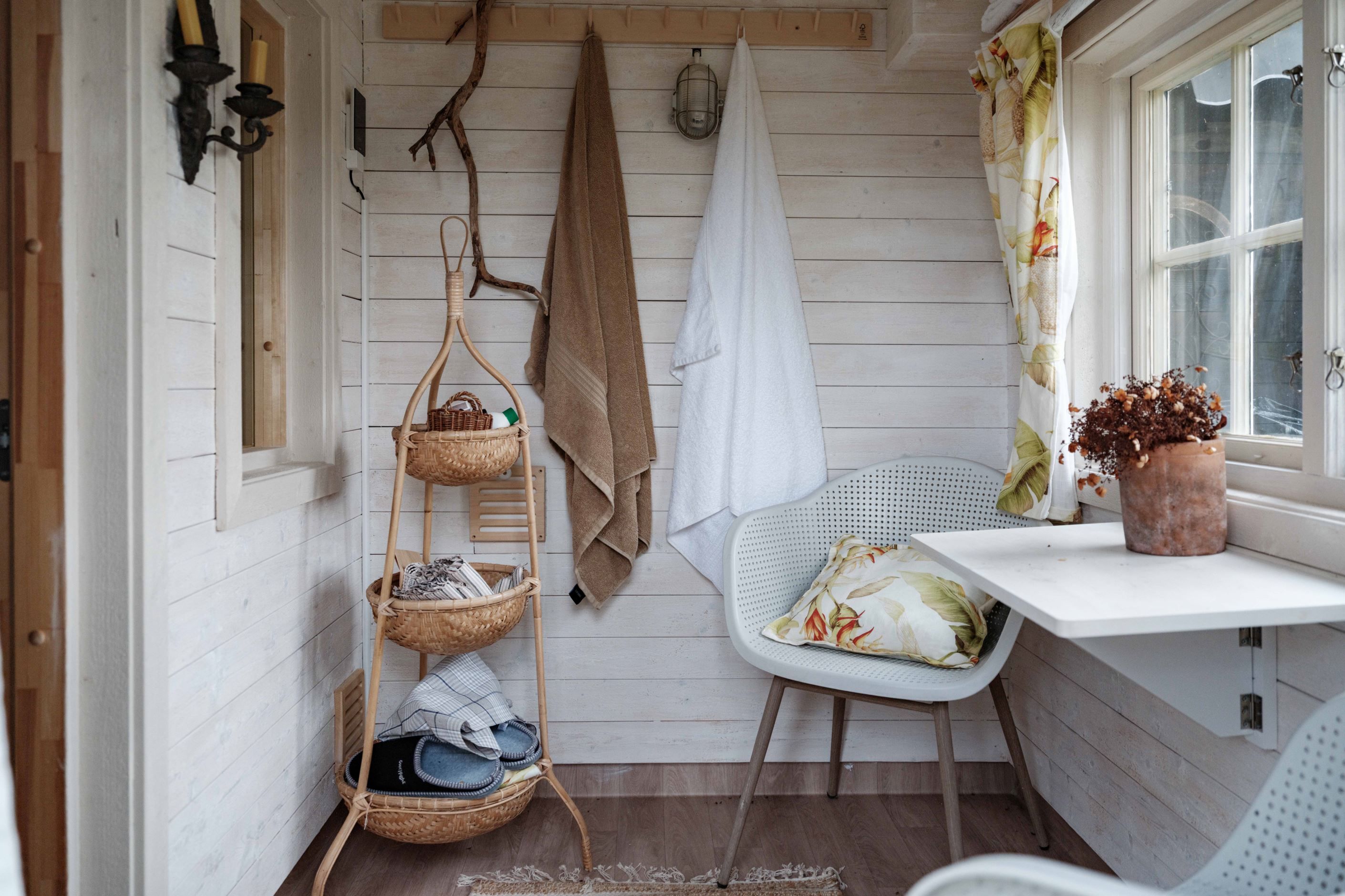 För gäster finns tre separata sovstugor, vilket gör att alla kan bo nära men ändå ha sitt eget. Fastigheten är fylld av små, älskvärda lösningar – som platsen bakom barnens sovstuga där tänder borstas i kvällsljuset. Medan man väntar på sin tur sätter man sig på bänken. En enkel stund som blir ett minne för livet.