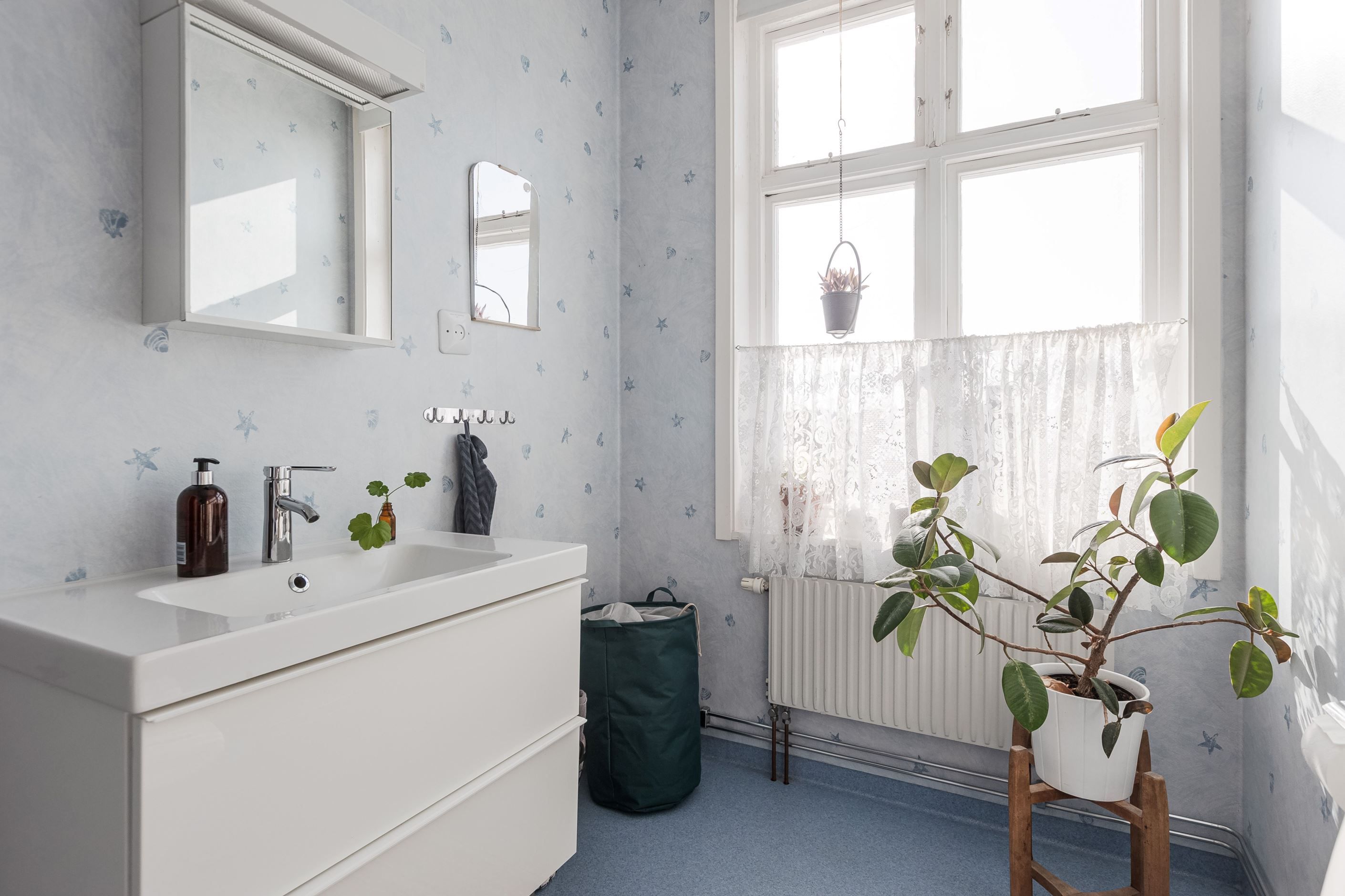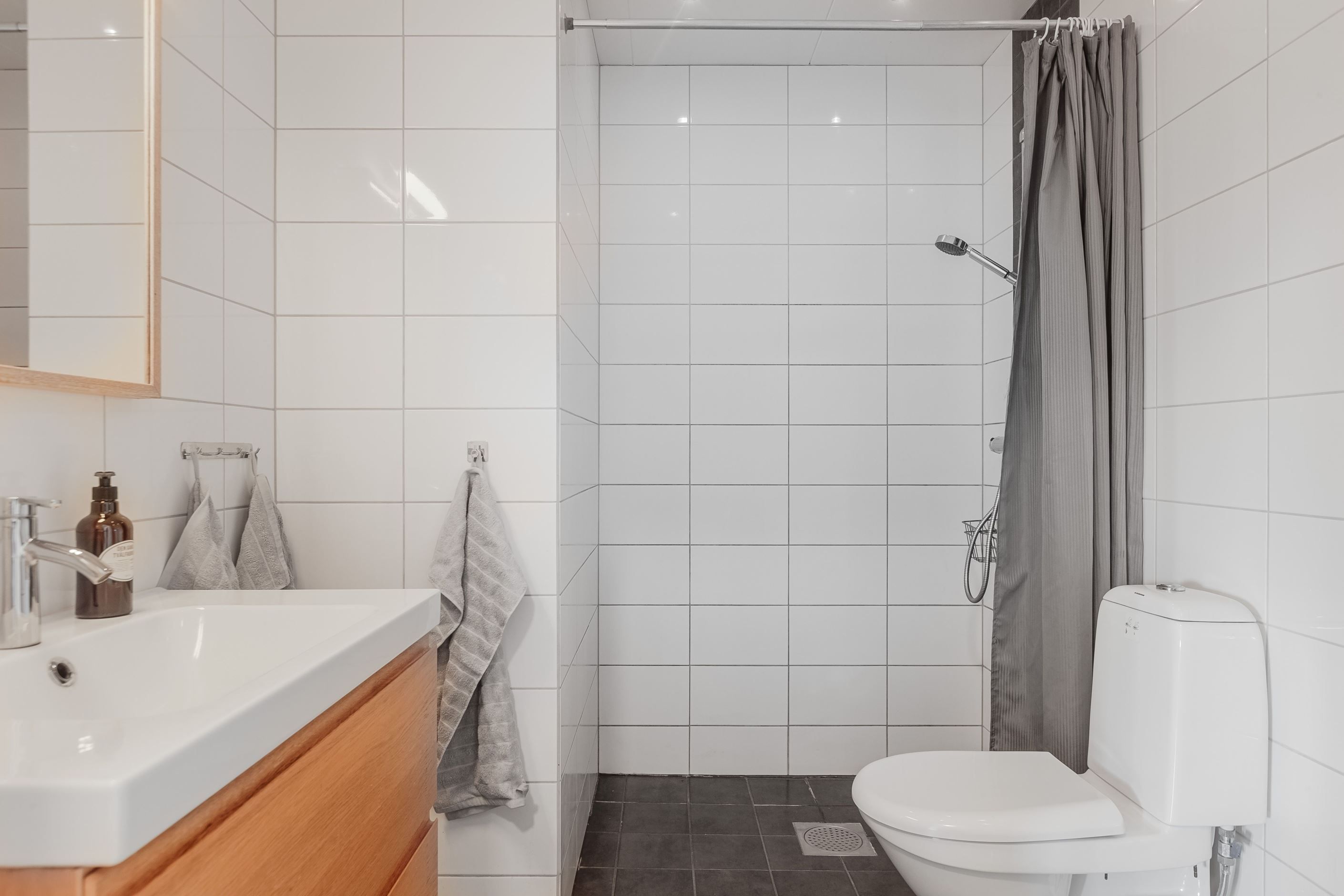 Lägenhet 2 på övre plan om 2 r.o.k på ca 48 kvm som förr var skolsysterns mottagning. Mindre hall som flyter ihop med kök och vardagsrum. Duschrum med plastmatta och duschkabin.