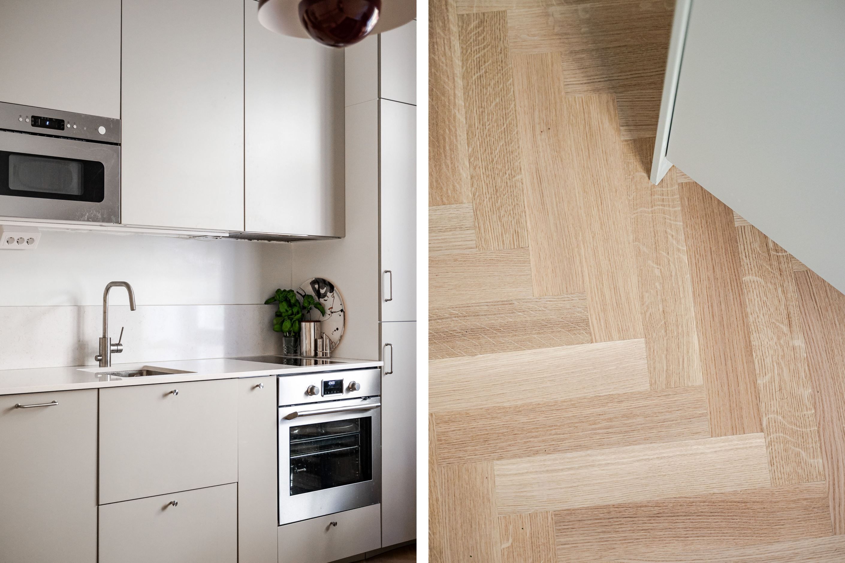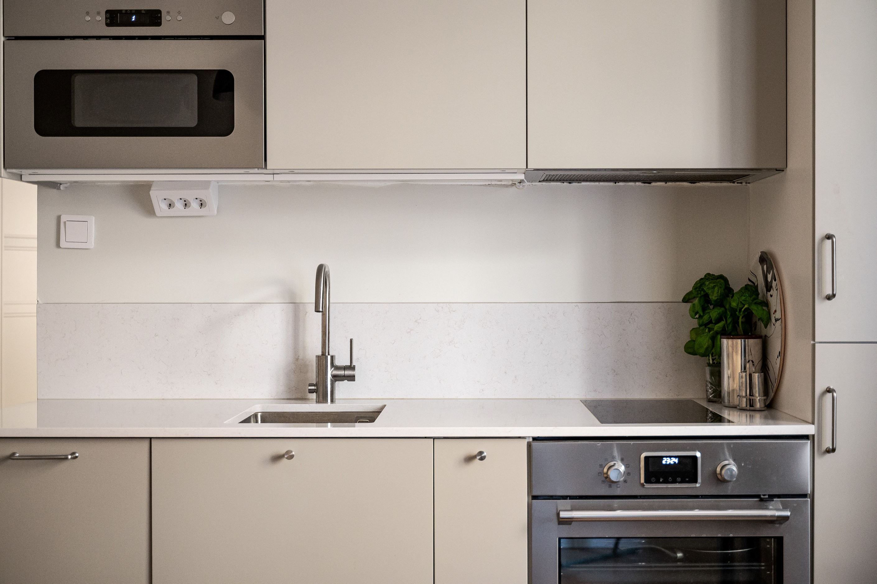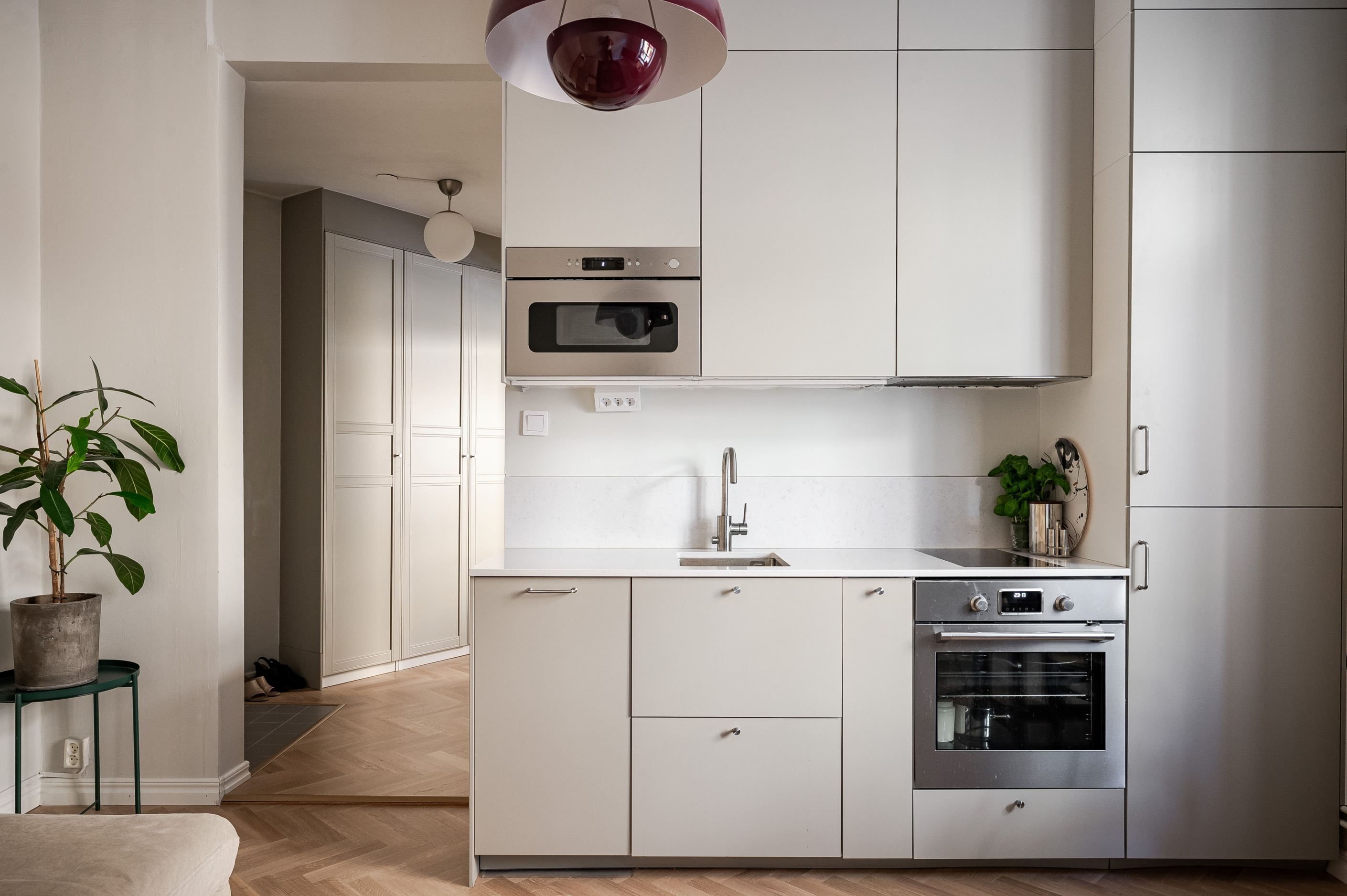 När man kliver in möts man av en välkomnande hall med bra garderobsförvaring. Vidare öppnar bostaden upp mot ett stort sällskapsrum i öppen planlösning med kök, där det finns gott om plats för både soffa och matbord. Köket är fullt utrustat med diskho, diskmaskin, spishäll, ugn, integrerad mikro samt kombinerad kyl och frys. De släta beigea köksluckorna tillsammans med en stilren kompositstenbänkskiva skapar ett sobert och elegant intryck.