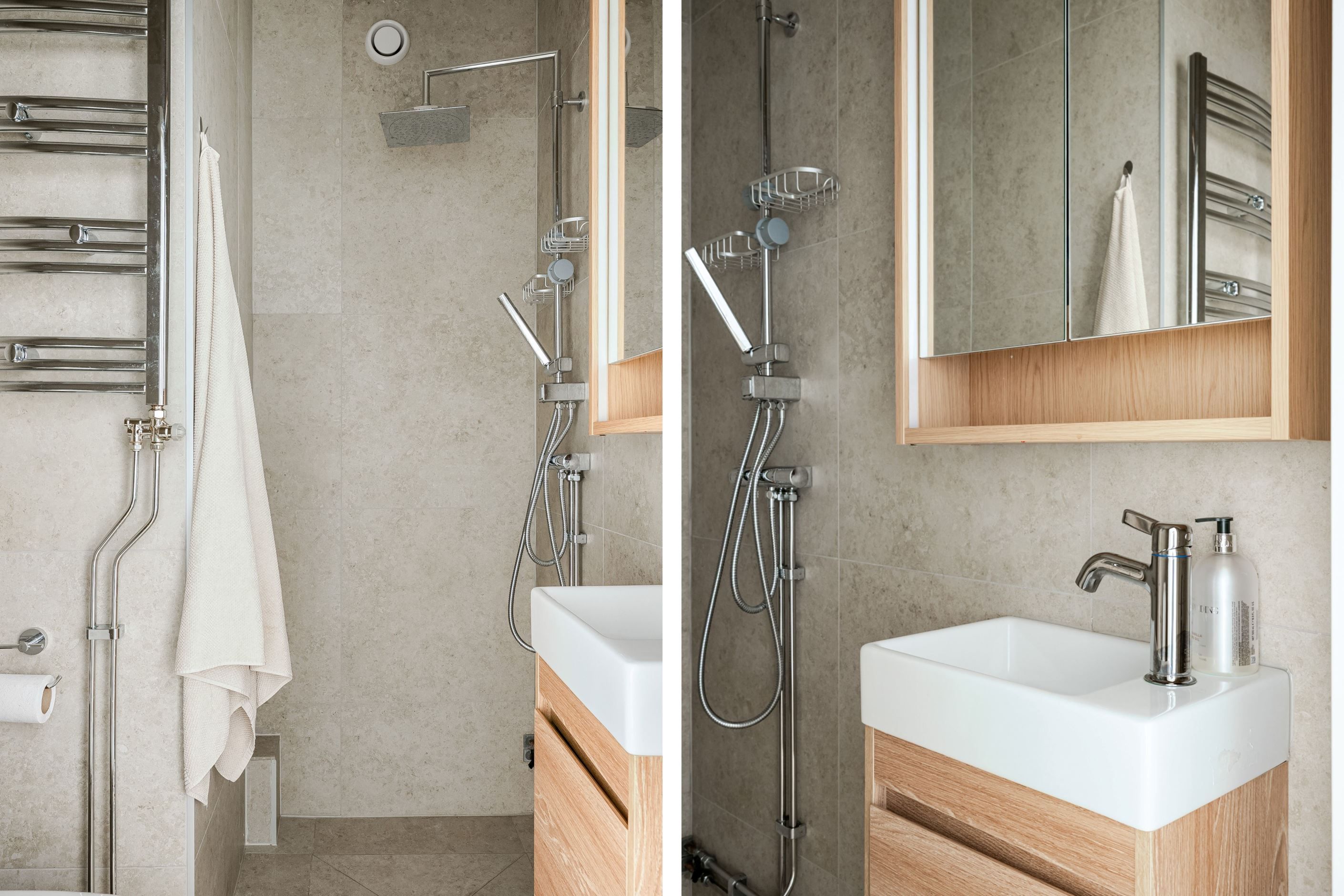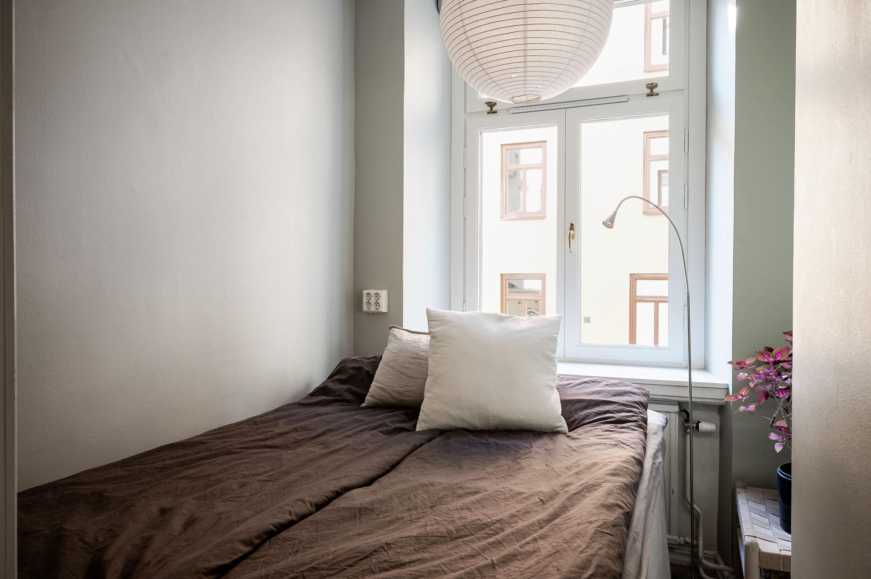 Sovrummet erbjuder en rofylld plats för vila med praktisk garderob. Badrummet är stilfullt inrett med vackert glaskeramiskt kakel och klinker, samt utrustat med kommod och spegelskåp i snyggt träslag – en genomtänkt helhet med modern känsla.