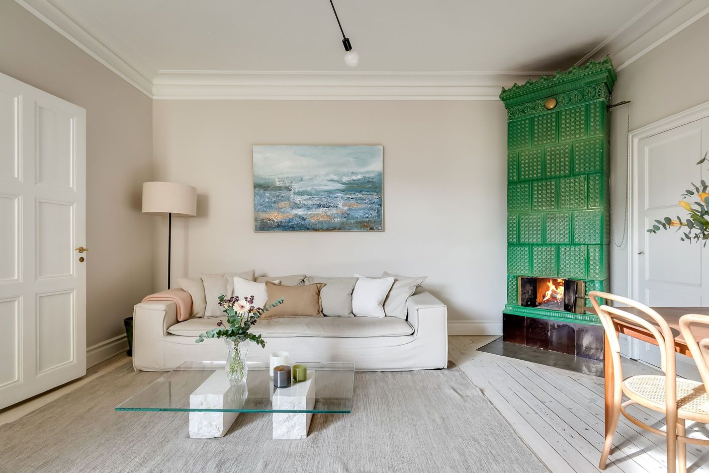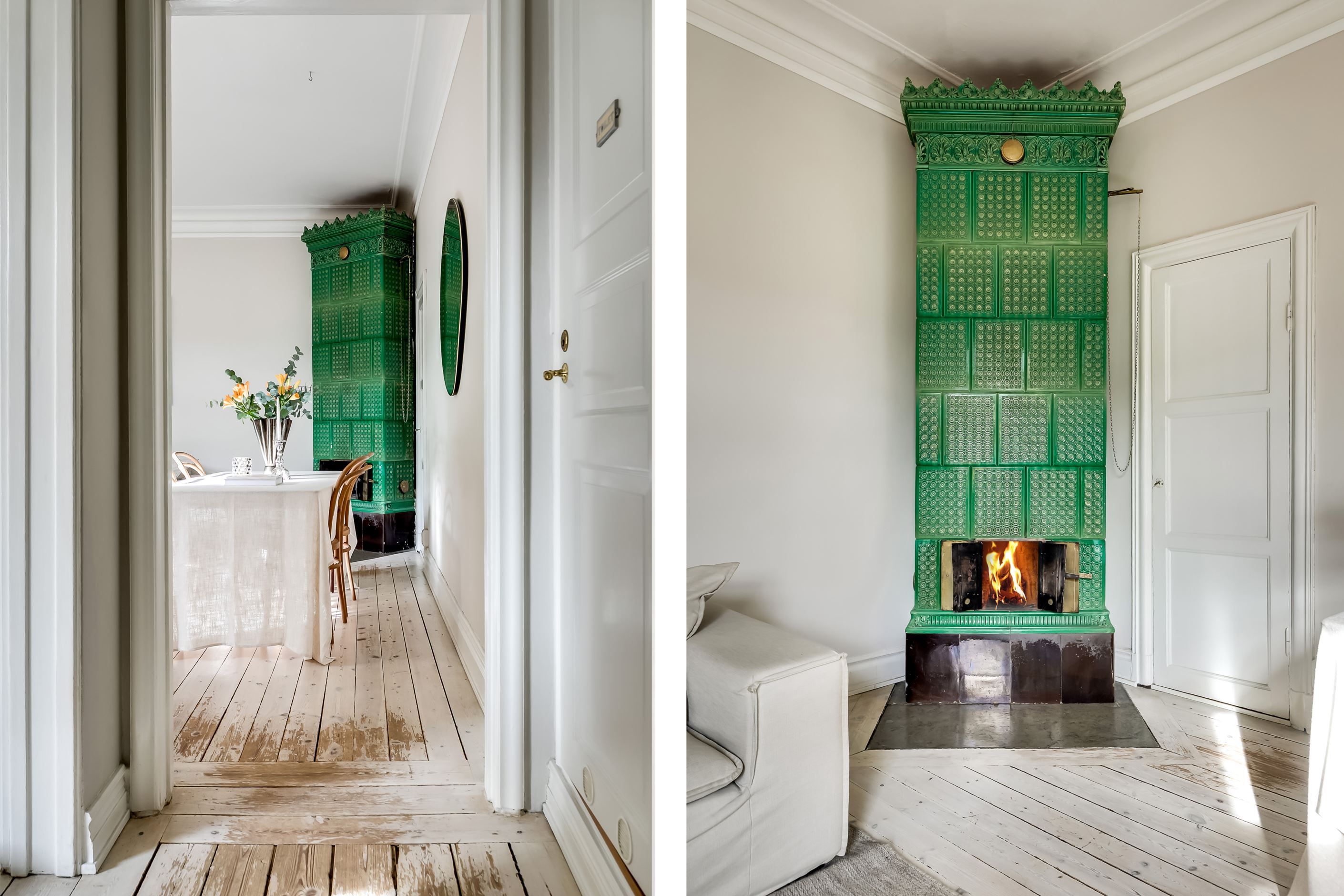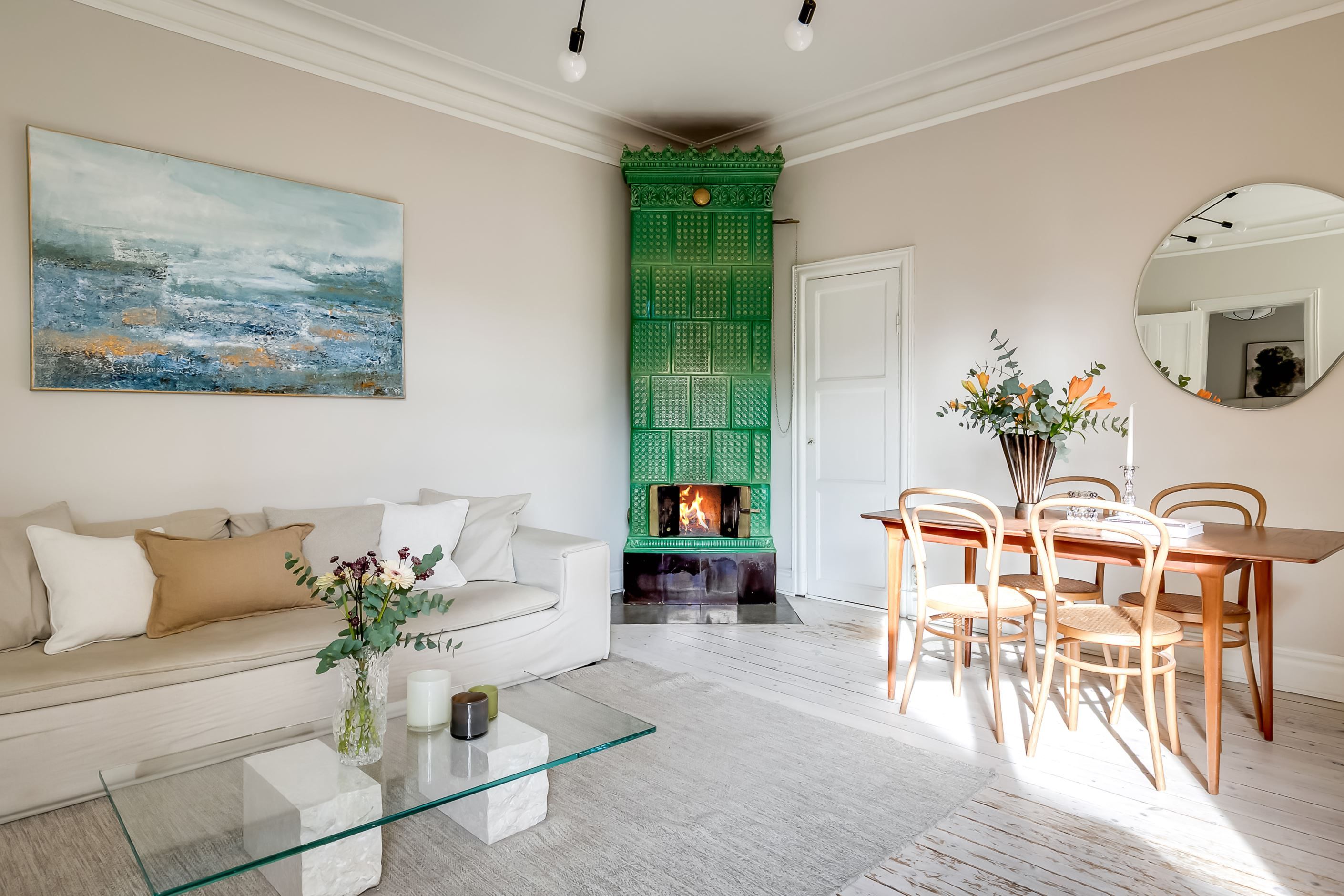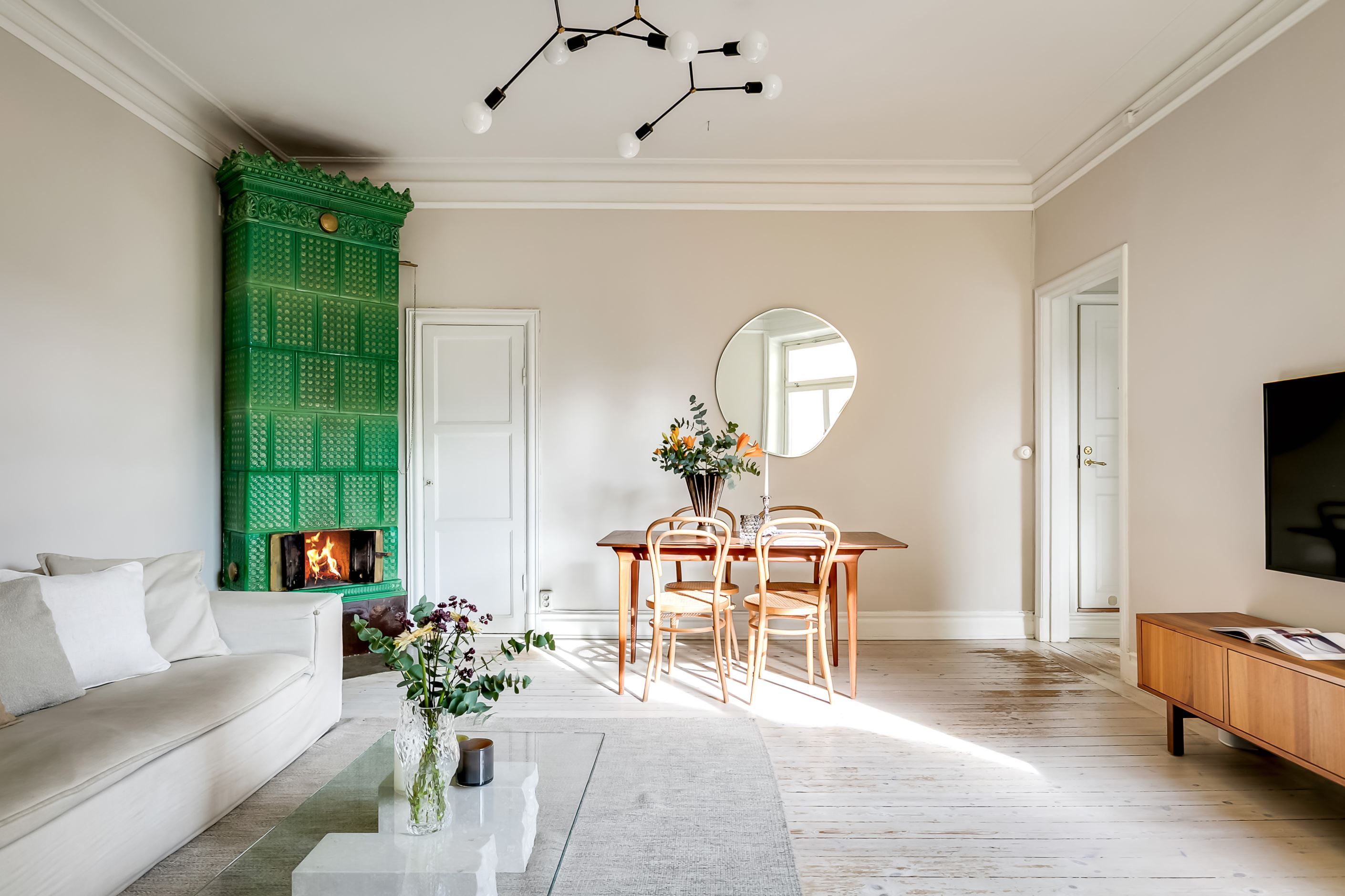 Redan när du kliver in möts du av ljuset som strömmar genom lägenheten. Det höga läget tillsammans med fönster mot den stillsamma innergården skapar en harmonisk och inbjudande atmosfär där stadens brus känns långt borta. Planlösningen är både social och välbalanserad – här finns gott om utrymme att samla vänner kring långa middagar, sjunka ner i soffan framför den fungerande kakelugnen eller bara njuta av den luftiga känslan som de vackra sekelskiftesdetaljerna ger.