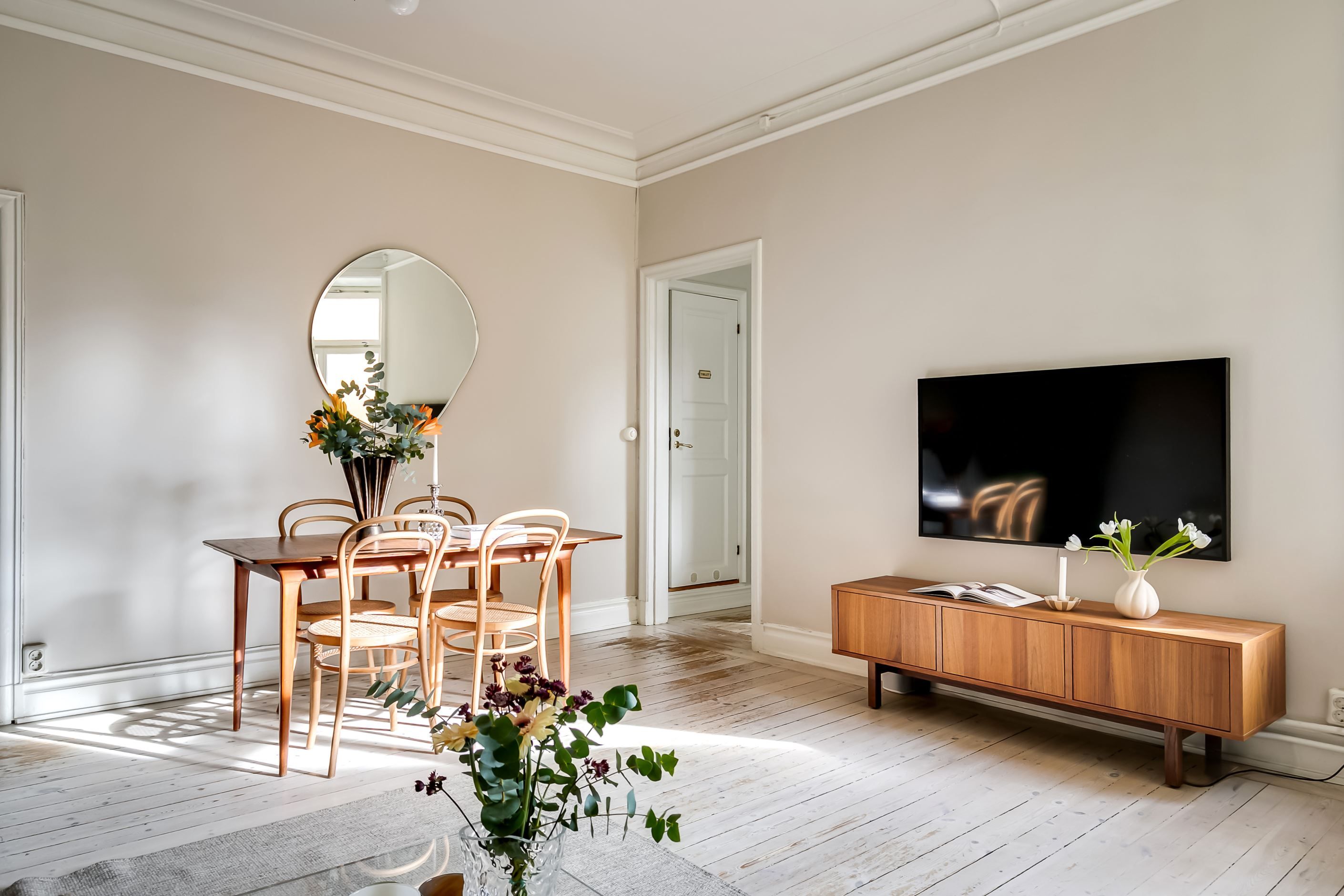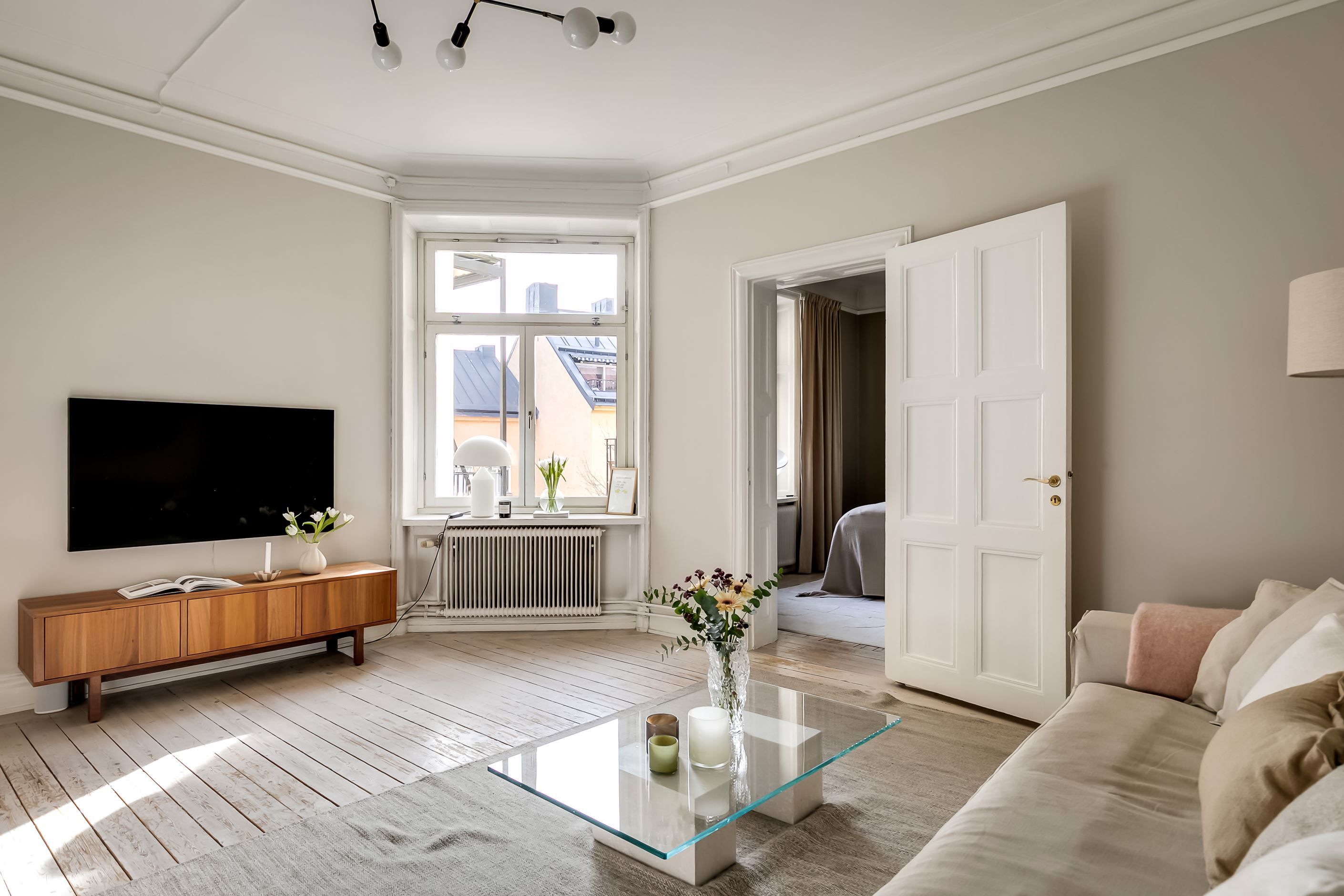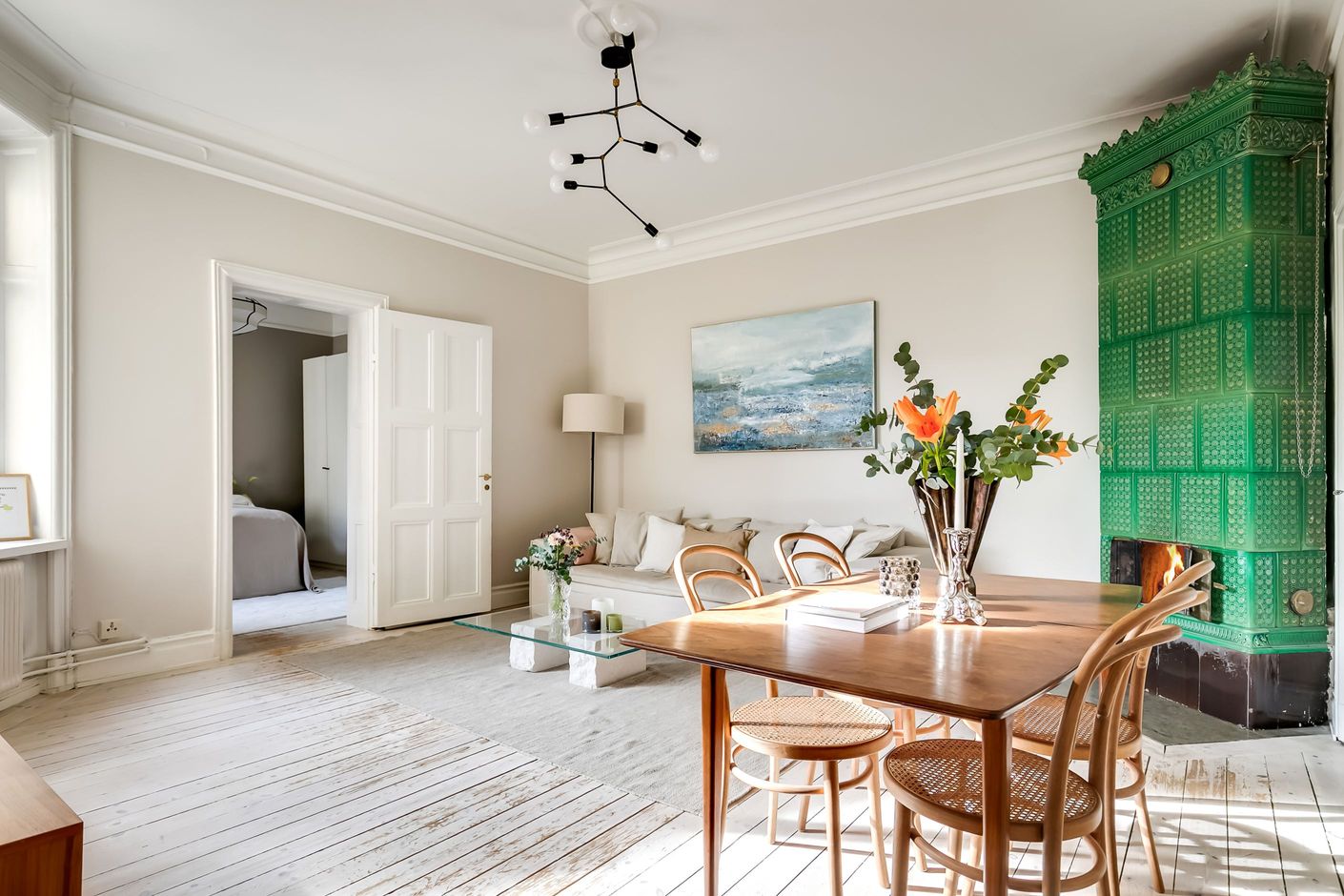 Redan när du kliver in möts du av ljuset som strömmar genom lägenheten. Det höga läget tillsammans med fönster mot den stillsamma innergården skapar en harmonisk och inbjudande atmosfär där stadens brus känns långt borta. Planlösningen är både social och välbalanserad – här finns gott om utrymme att samla vänner kring långa middagar, sjunka ner i soffan framför den fungerande kakelugnen eller bara njuta av den luftiga känslan som de vackra sekelskiftesdetaljerna ger.