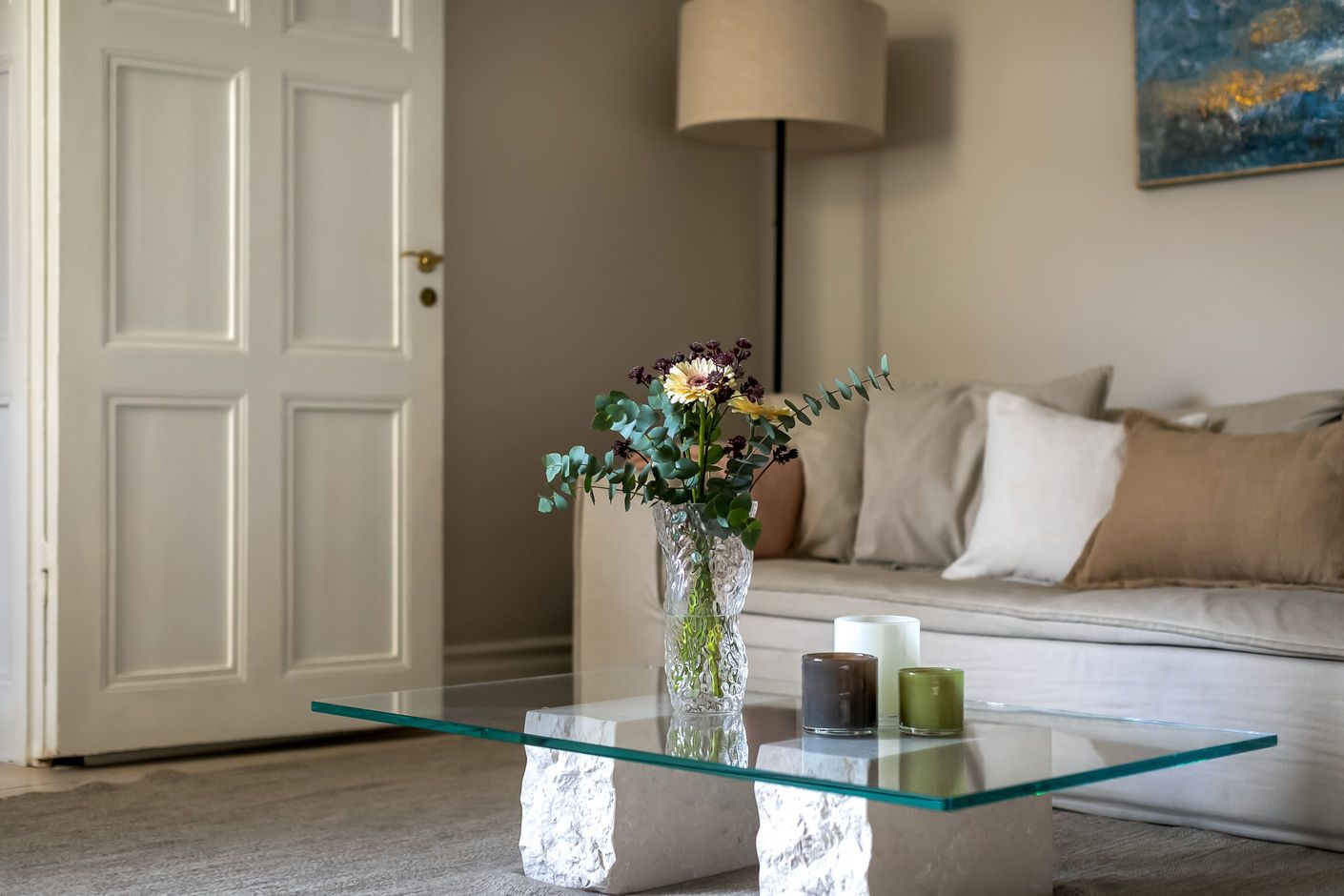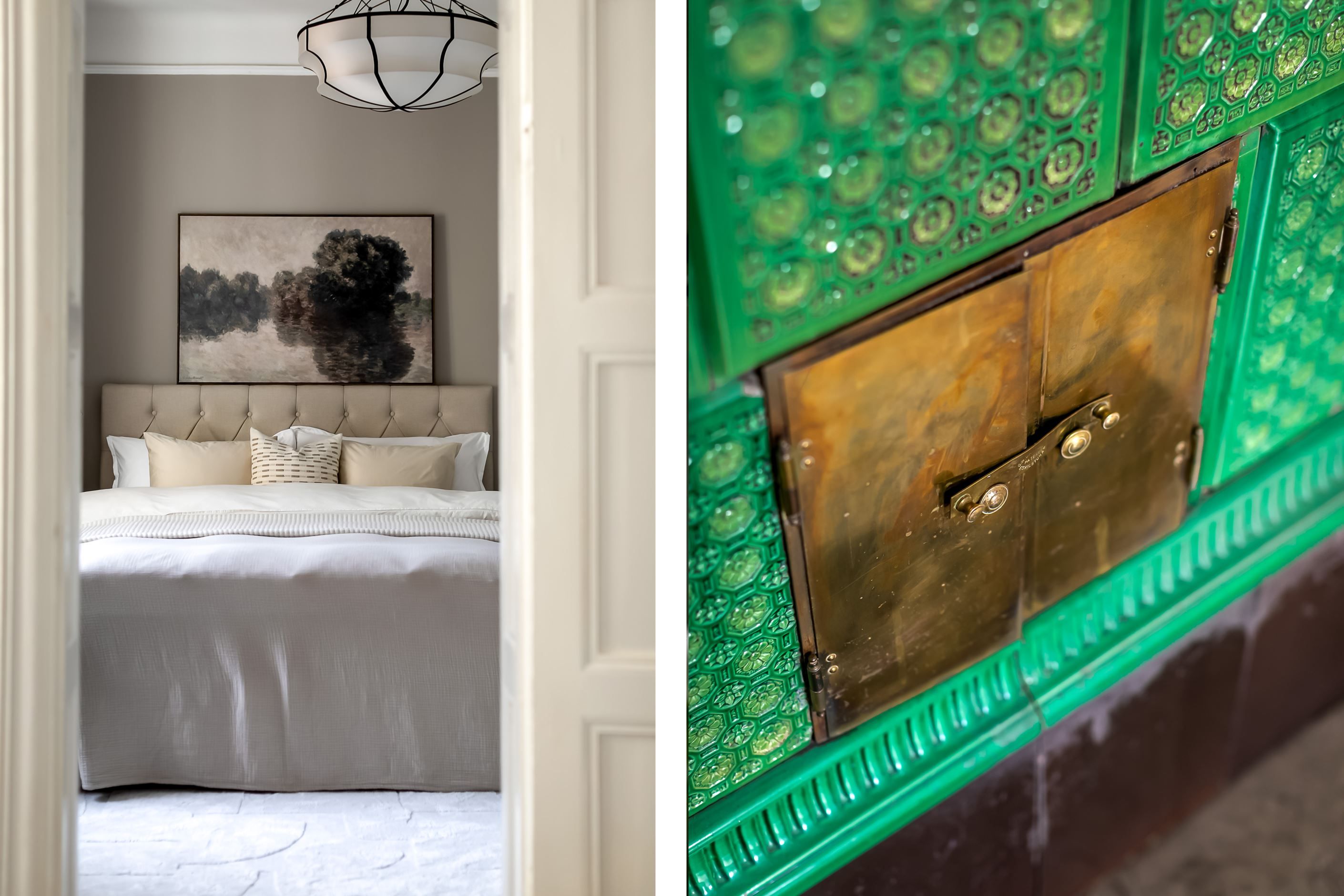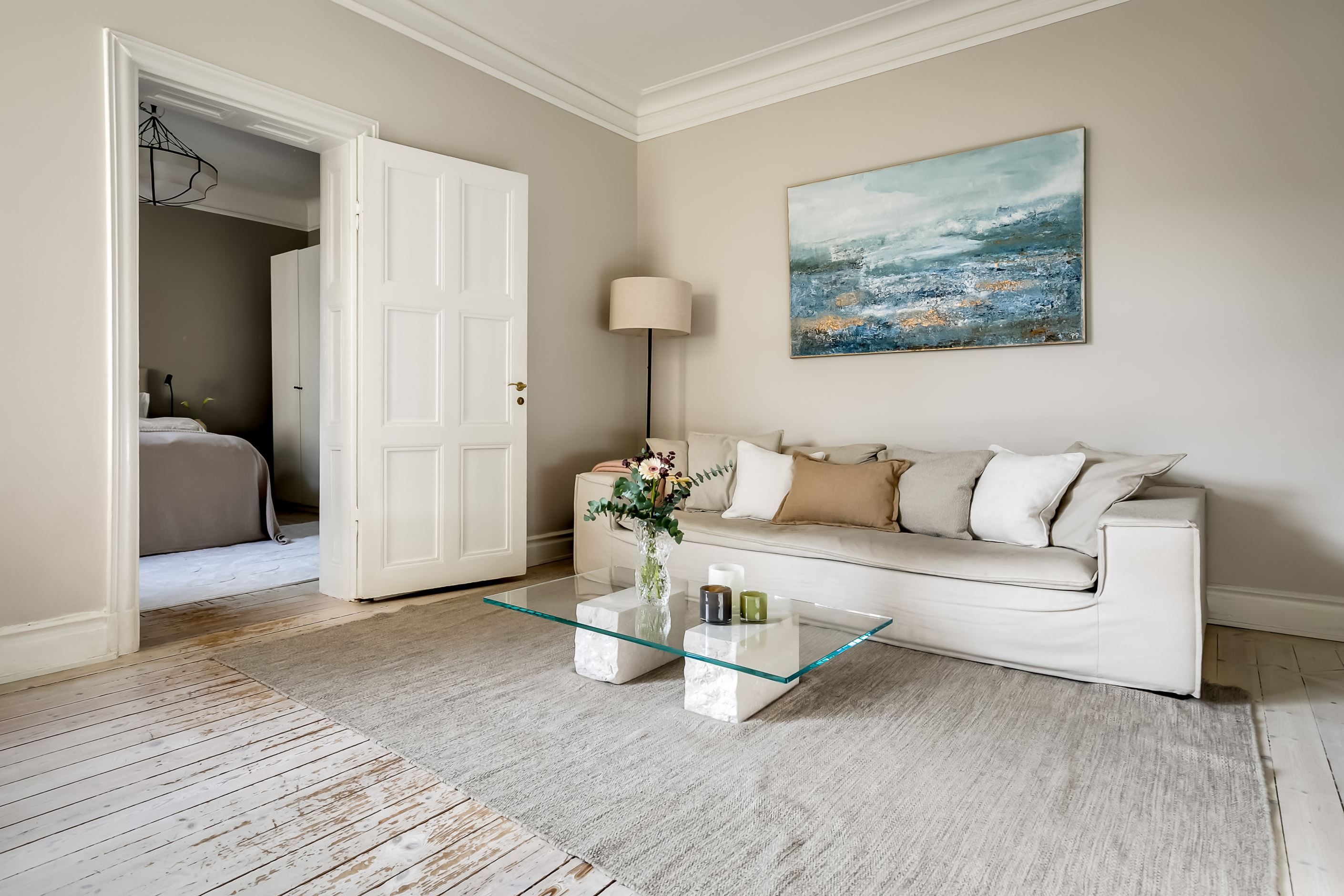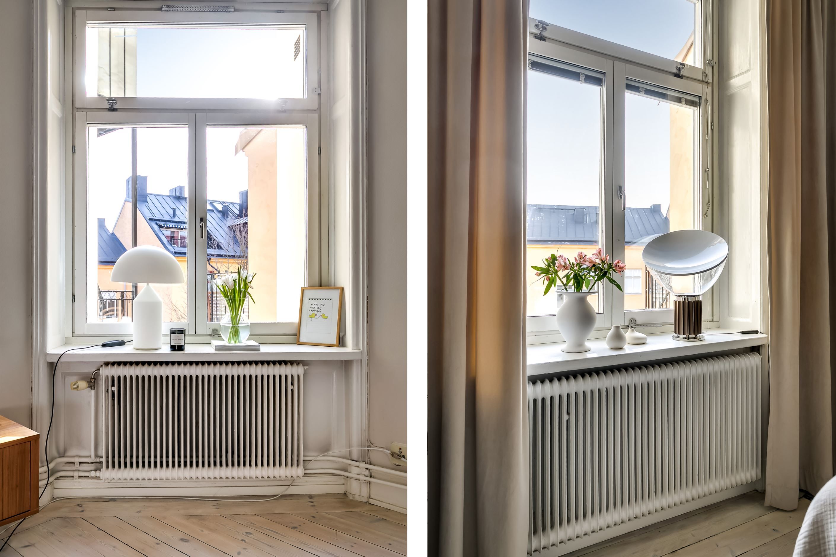 Redan när du kliver in möts du av ljuset som strömmar genom lägenheten. Det höga läget tillsammans med fönster mot den stillsamma innergården skapar en harmonisk och inbjudande atmosfär där stadens brus känns långt borta. Planlösningen är både social och välbalanserad – här finns gott om utrymme att samla vänner kring långa middagar, sjunka ner i soffan framför den fungerande kakelugnen eller bara njuta av den luftiga känslan som de vackra sekelskiftesdetaljerna ger.