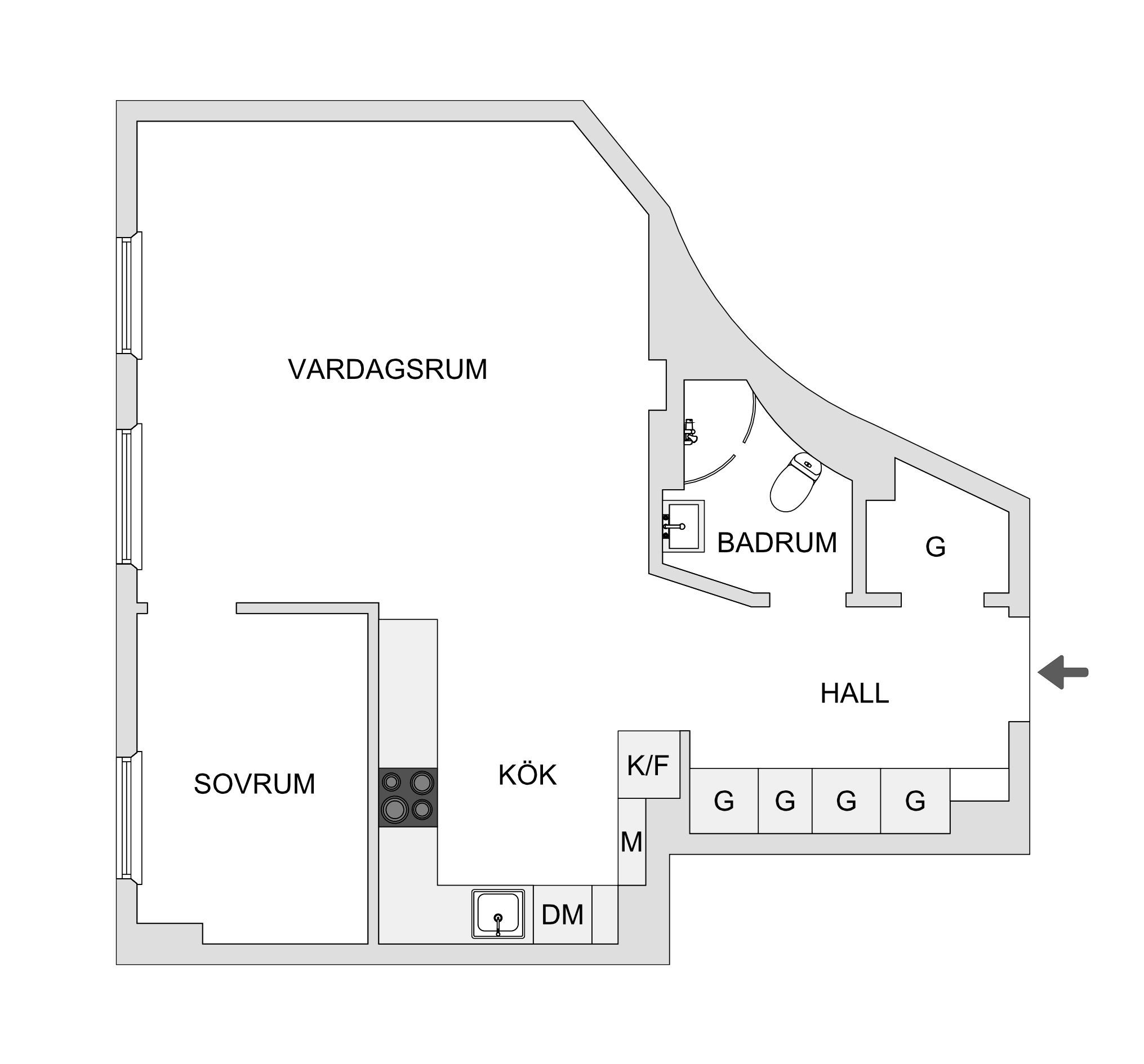 Köket ligger i öppen planlösning mot vardagsrummet och är både funktionellt och stilrent. Här finns gott om arbetsytor och förvaring, vilket gör det lätt att hålla ordning och skapar en trivsam miljö för matlagning och gemensamma stunder. Köket är utrustat med kyl och frys, spis, ugn, fläkt, diskmaskin samt micro. Bostadens sovrum ligger i lugnt gårdsläge och erbjuder plats för dubbelsäng. Hallen erbjuder utmärkta förvaringsmöjligheter i form av flera garderober och praktiska lådor – ett smart utnyttjat utrymme som ger ett välkomnande och prydligt första intryck. Badrummet är stambytt 2017/2018 och smakfullt inrett med wc, handfatskommod, spegelskåp samt dusch med glasade duschdörrar.