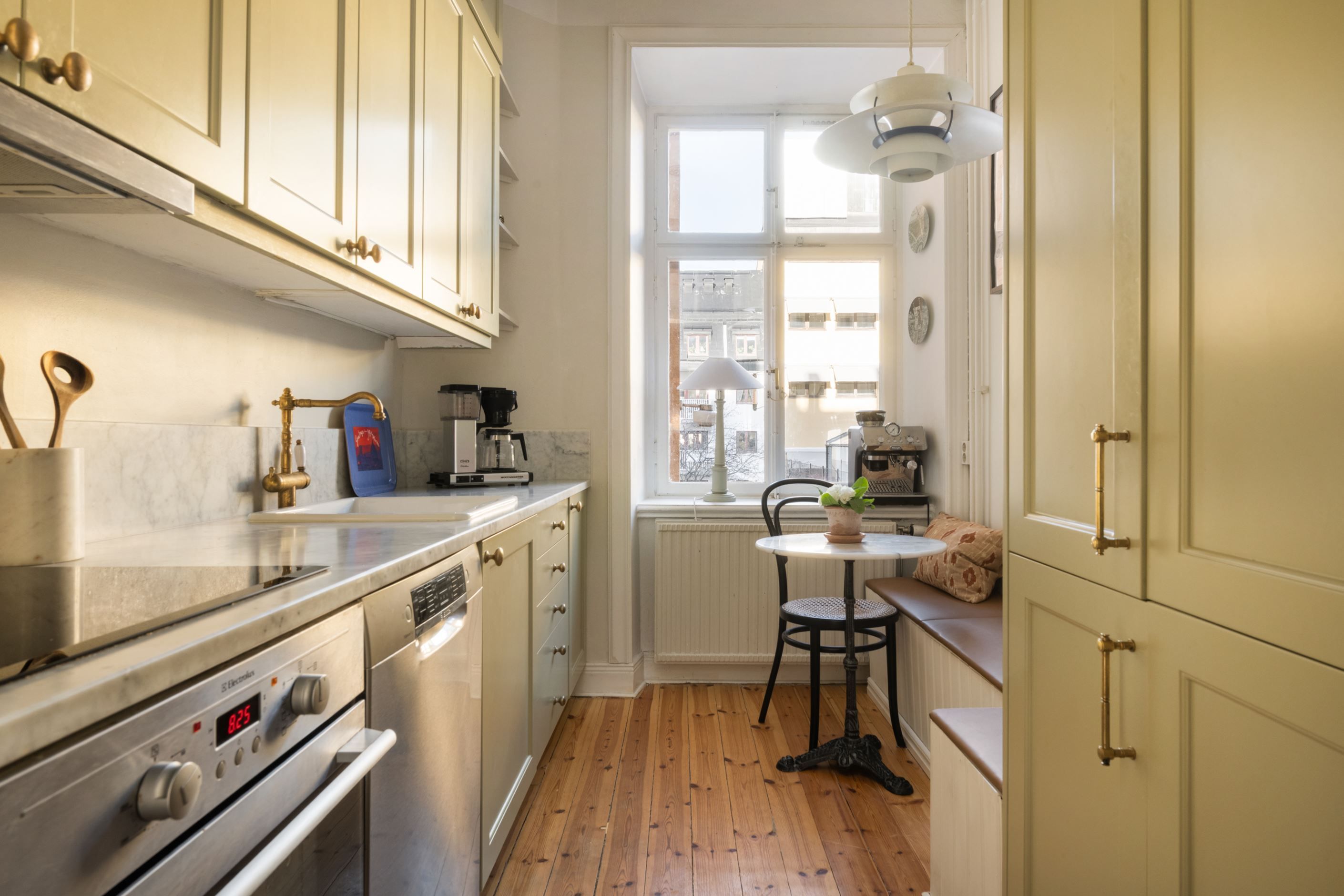 Planlösningen är både genomtänkt och social. Köket är stilrent inredd med bänkskiva i marmor och induktionshäll. Ett välutrustat kök med goda arbetsytor, generös förvaring samt en platsbyggd sittbänk som skapar en naturlig samlingsplats för såväl morgonkaffet som middagar med vänner. Vardagsrummet är ljust och rymligt med plats för såväl soffa, tv-möbel och matbord. Högt placerade fönster mot gatan som ger ett fint ljusinsläpp. Sovrummet ligger lugnt beläget mot innergården och erbjuder gott om plats för dubbelsäng, skrivbordshörna samt en platsbyggd garderobsvägg som ger utmärkta förvaringsmöjligheter.