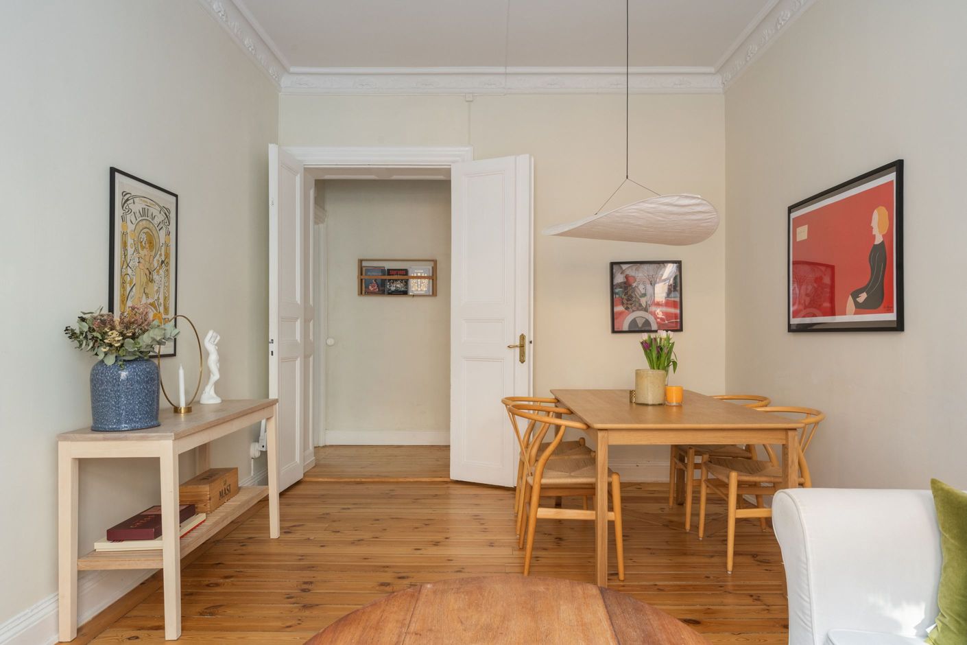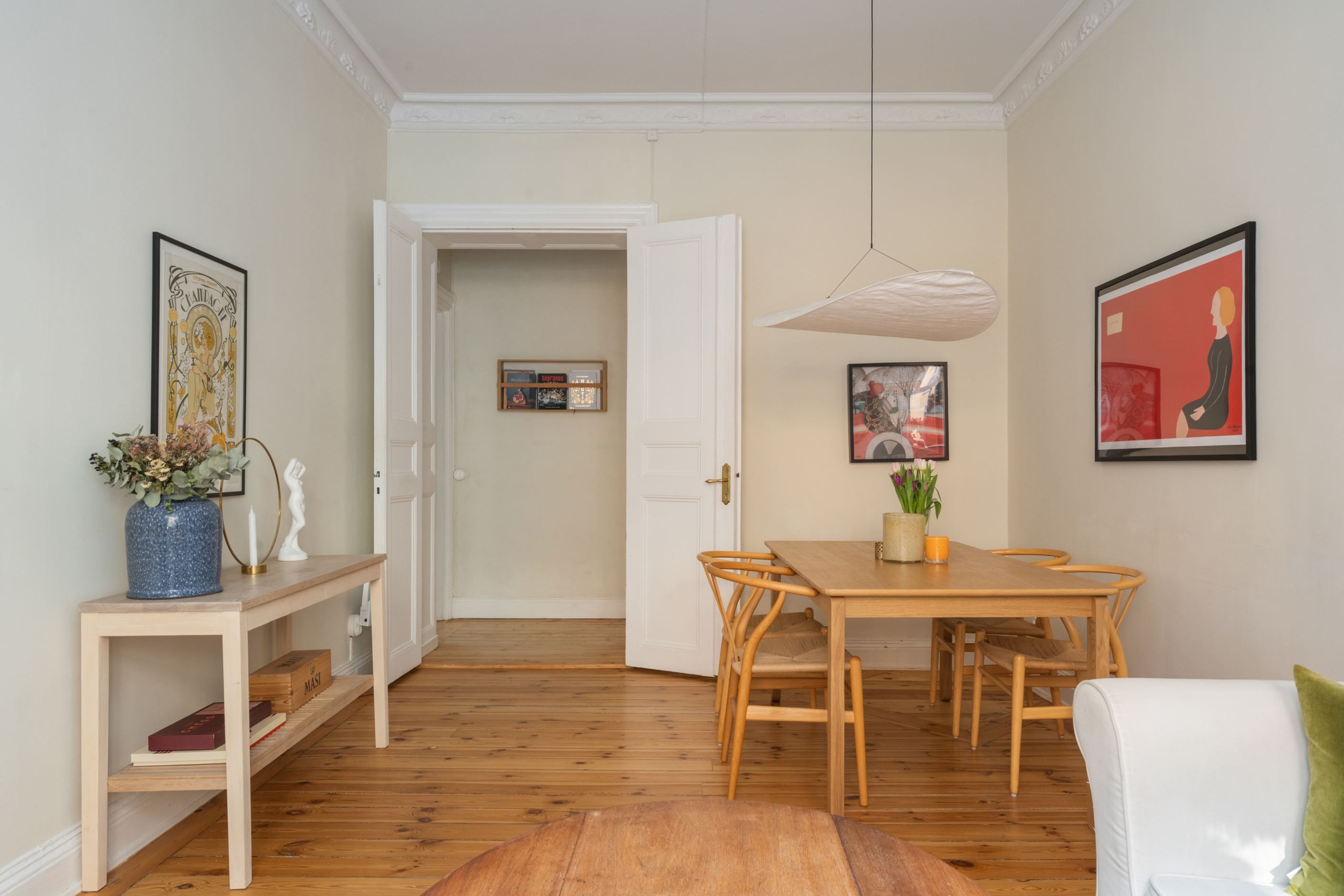 Här möts tidstypisk karaktär och modern funktion i ett hem där varje detalj samspelar. Bostaden präglas av vackra originaldetaljer såsom furugolv, stuckatur, spegeldörrar och tidstypiska fönster som tillsammans skapar en varm och inbjudande atmosfär. De eleganta pardörrarna öppnar upp mot vardagsrummet och förstärker den luftiga känslan samtidigt som de ger bostaden en klassisk sekelskifteskaraktär.