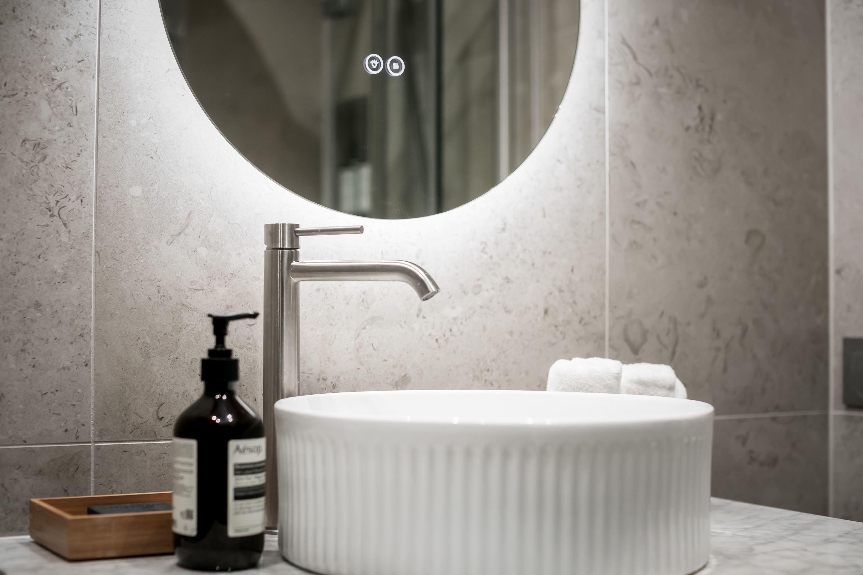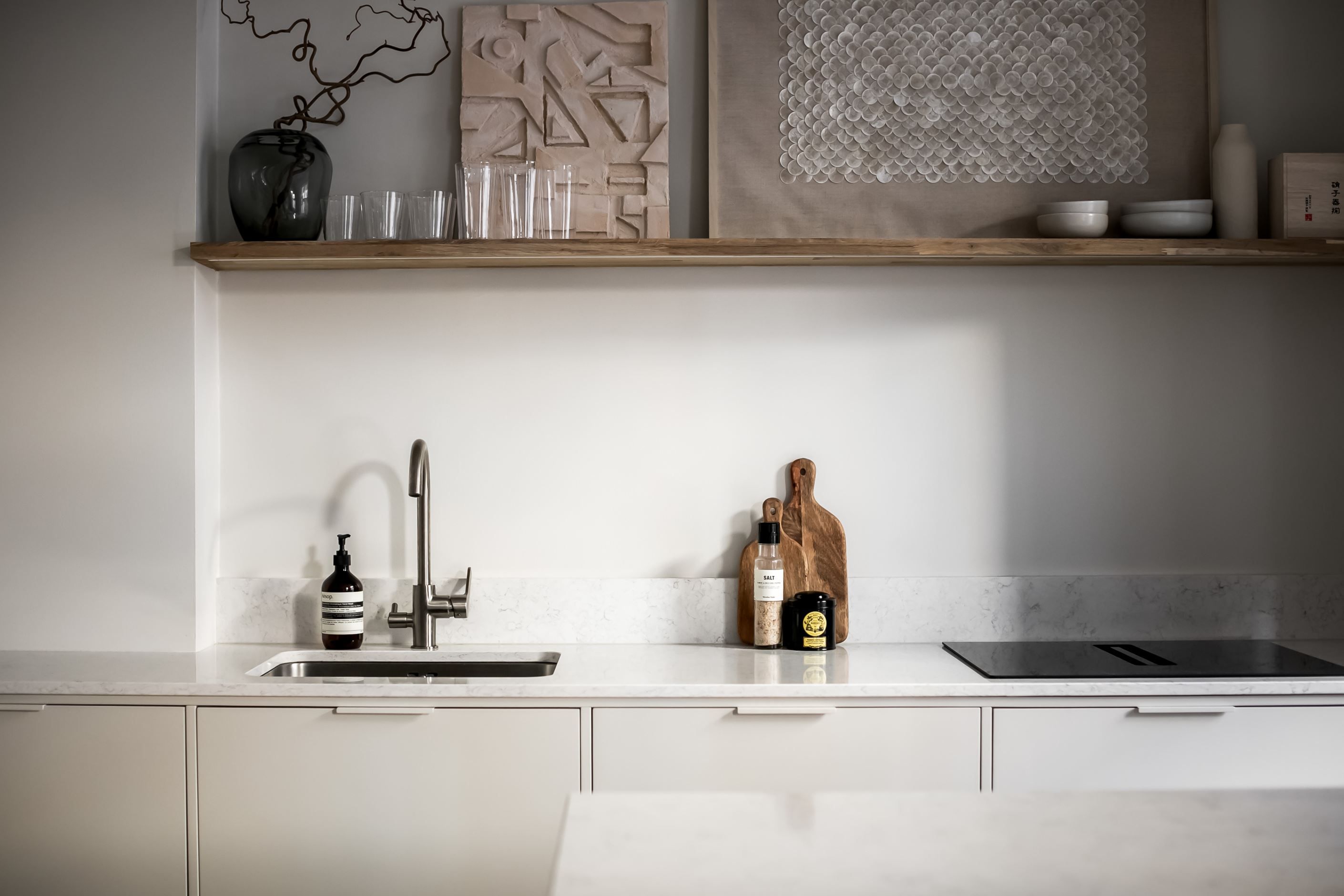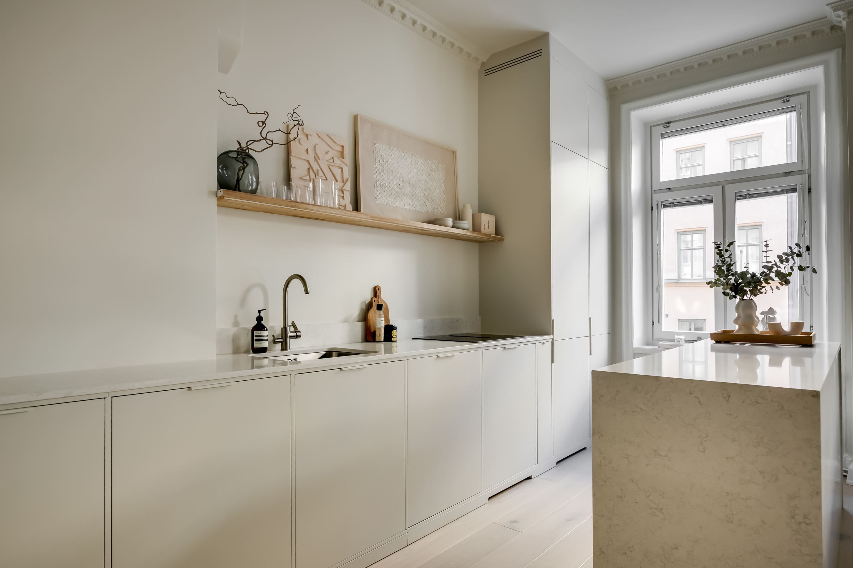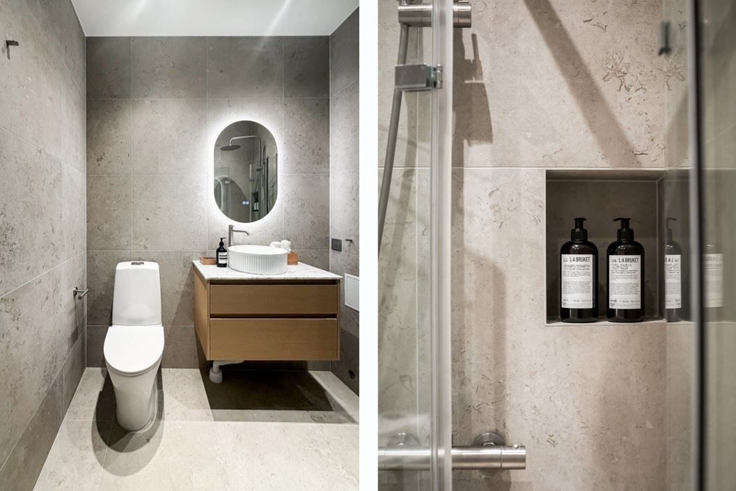 Varje yta i bostaden är smakfullt planerad och renoverad med omsorg. Köket är en perfekt balans mellan estetik och funktion, med ljusbeige-grå luckor, kompositskiva och en stilren, stenklädd köksö med elegant waterfall-design som sömlöst smälter in i hemmets helhet. Badrummet andas sofistikerad lyx med stora mattgrå klinkerplattor vars dämpade, naturliga nyanser ger en känsla av äkthet och tidlös elegans. Integrerad kommod och dold rördragning förstärker det minimalistiska och stilrena intrycket.
