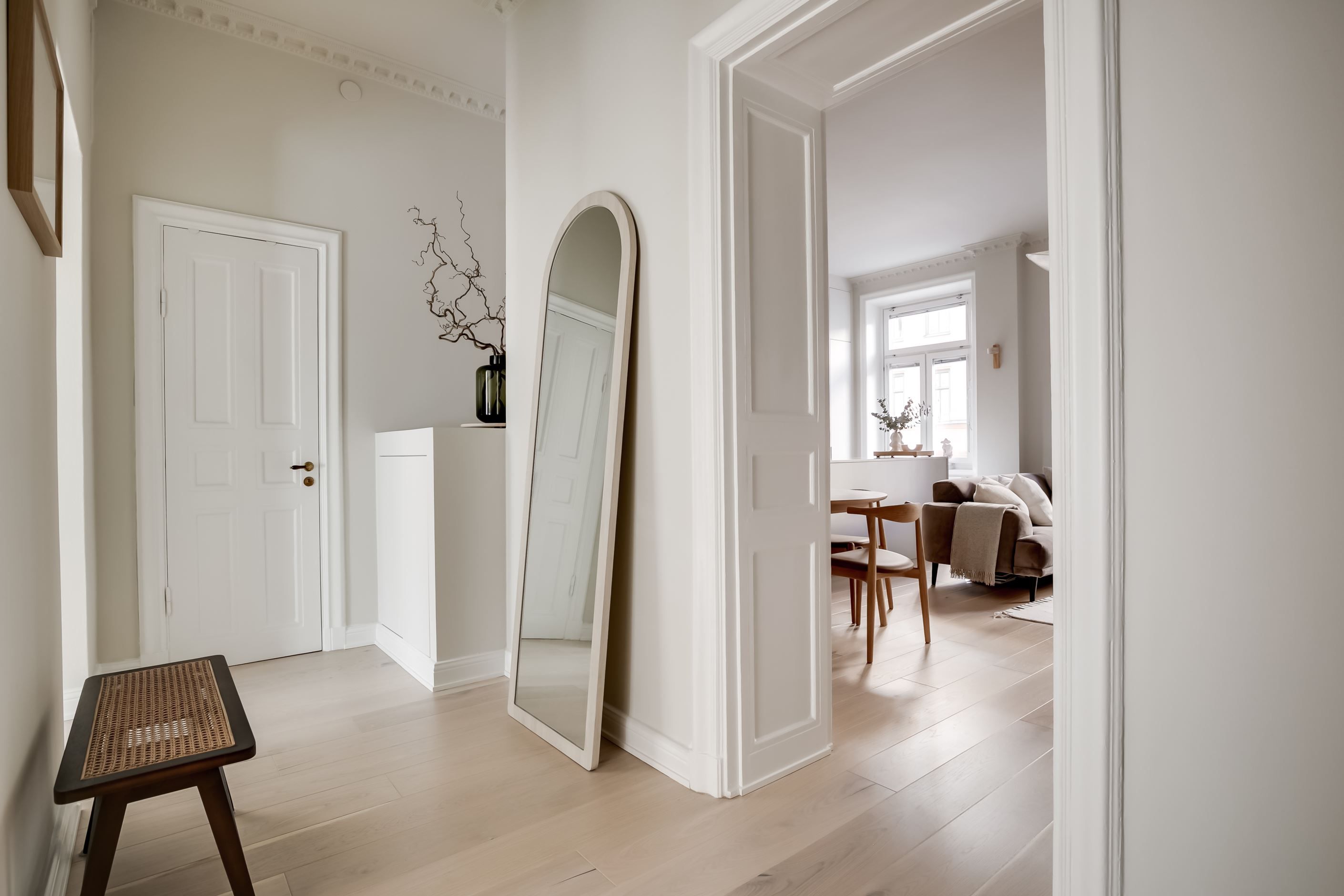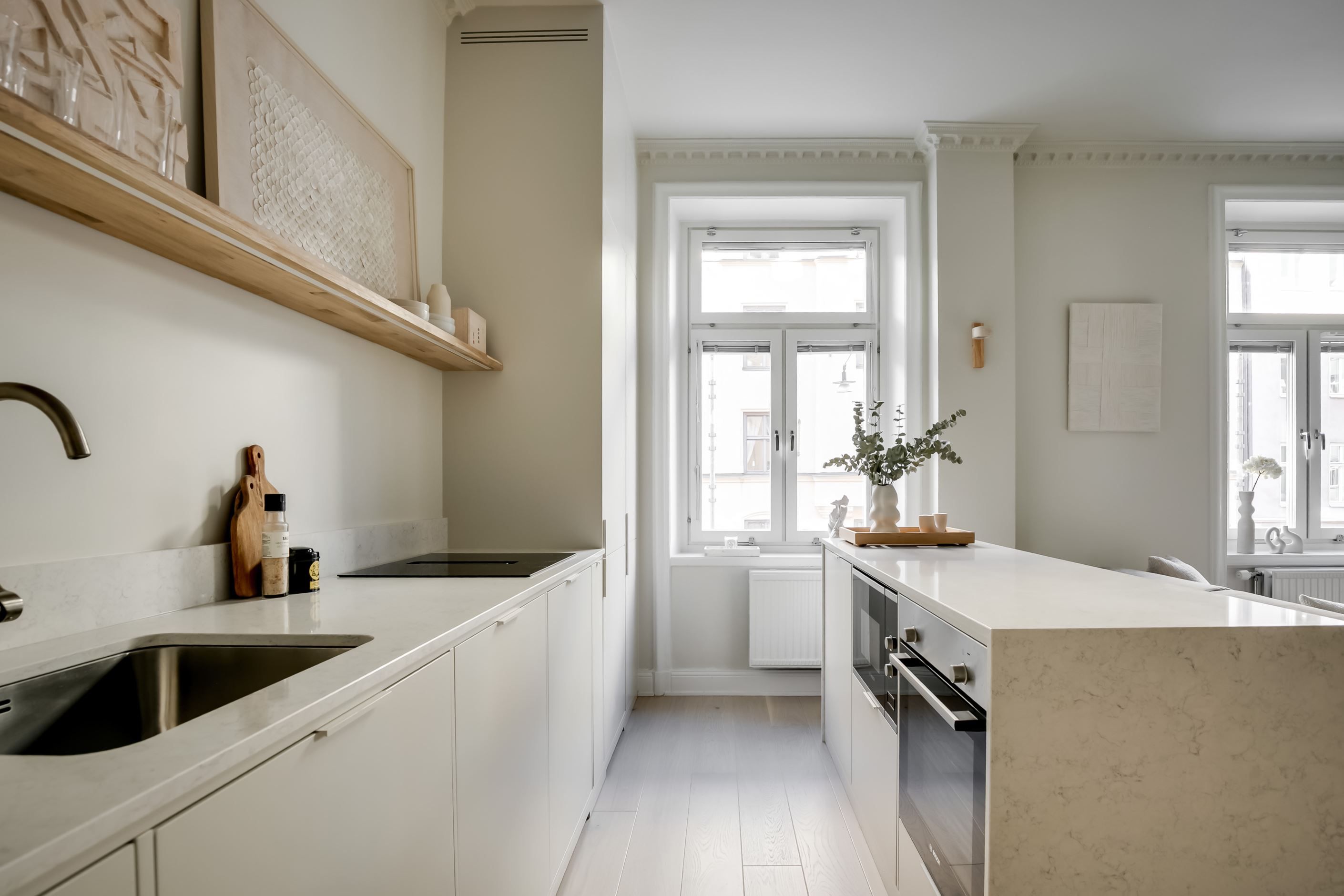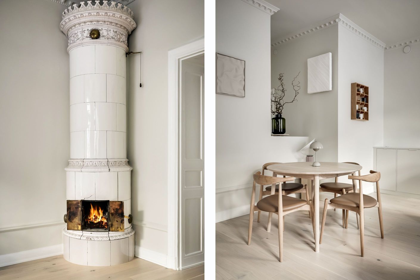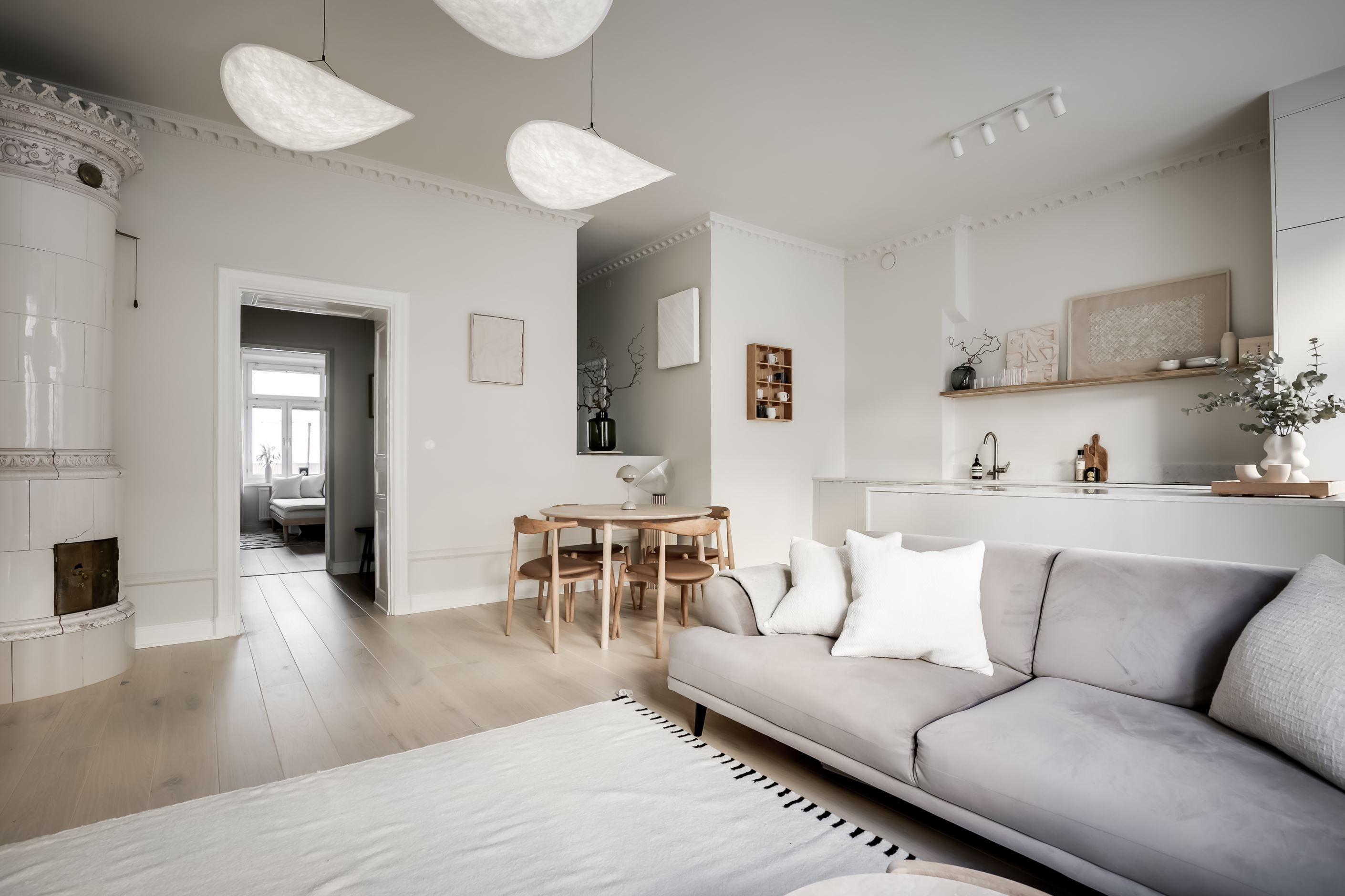 Inredningen är smakfullt renoverad med inspiration från den populära Japandi-stilen, en harmonisk kombination av japansk minimalism och naturliga material med nordisk design och hemtrevnad. Samtidigt är bostadens själ bevarad. Den fungerande kakelugnen sprider värme och atmosfär, stuckaturer och takrosett lyfter takhöjden ytterligare, de höga golvsocklarna ger karaktär och fönstren släpper in ett generöst ljusinsläpp som sprider sig genom rummen. Den omsorgsfulla renoveringen gör att varje detalj, gammal som ny, känns självklar och lyfter fram bostadens unika karaktär.