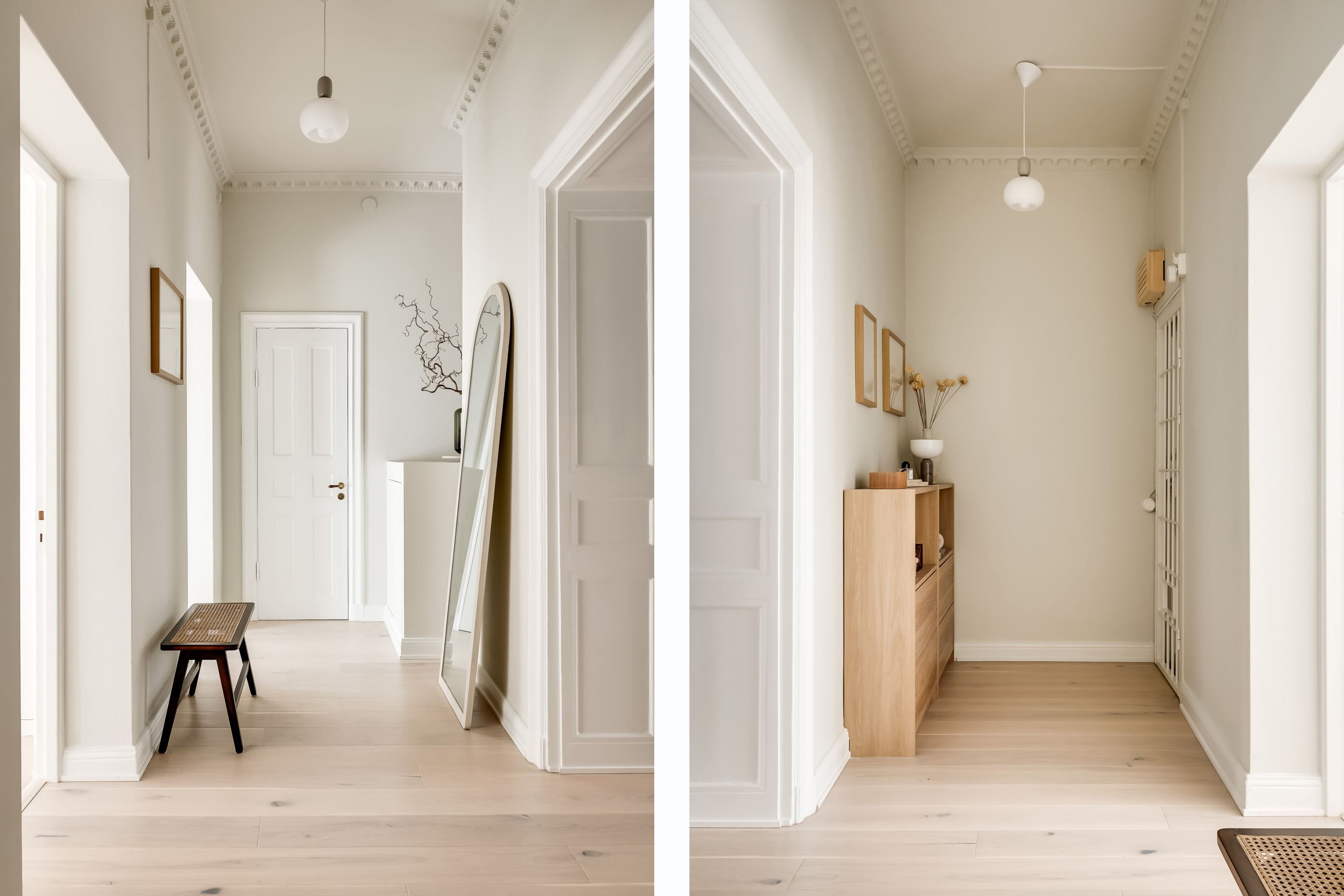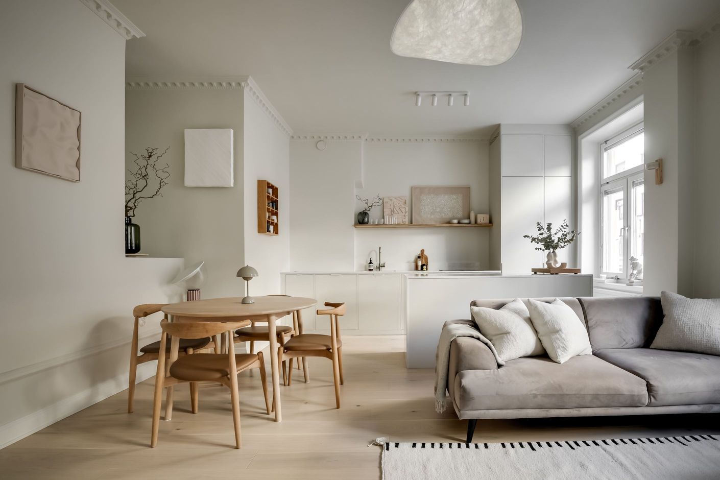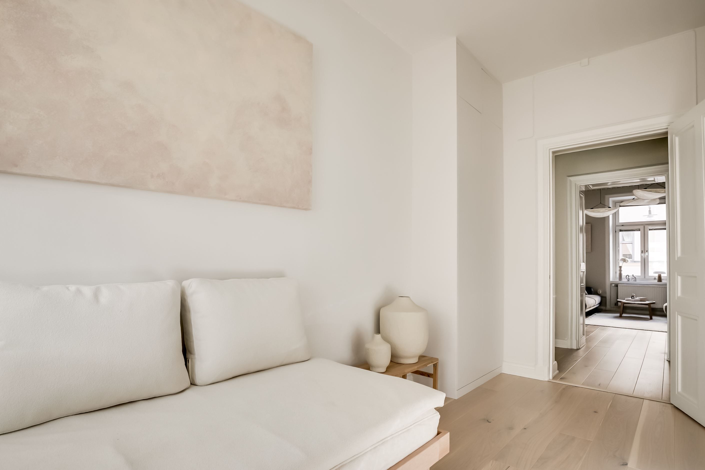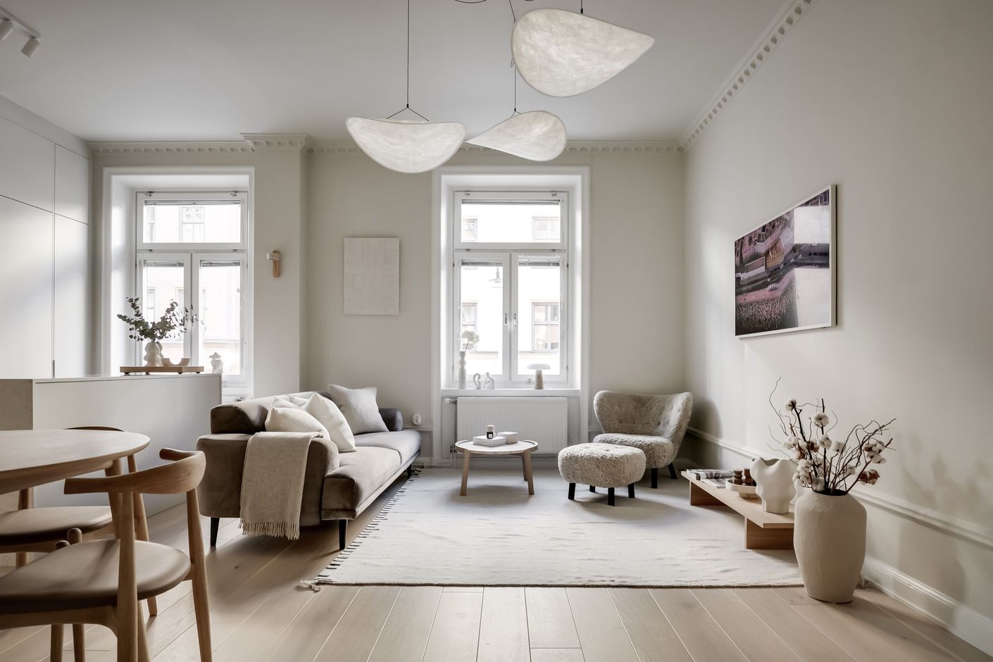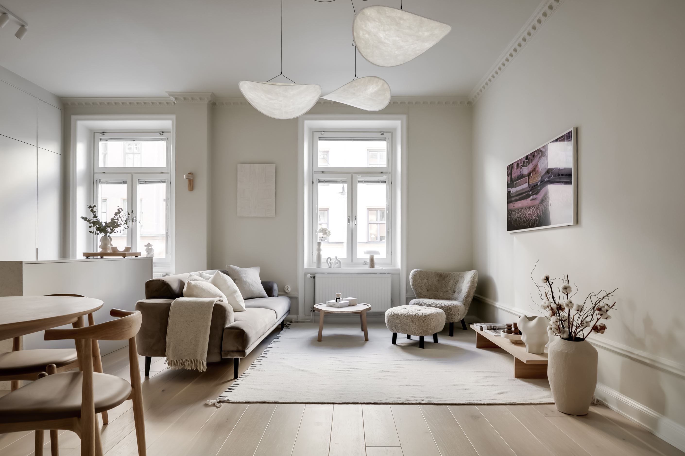 Inredningen är smakfullt renoverad med inspiration från den populära Japandi-stilen, en harmonisk kombination av japansk minimalism och naturliga material med nordisk design och hemtrevnad. Samtidigt är bostadens själ bevarad. Den fungerande kakelugnen sprider värme och atmosfär, stuckaturer och takrosett lyfter takhöjden ytterligare, de höga golvsocklarna ger karaktär och fönstren släpper in ett generöst ljusinsläpp som sprider sig genom rummen. Den omsorgsfulla renoveringen gör att varje detalj, gammal som ny, känns självklar och lyfter fram bostadens unika karaktär.