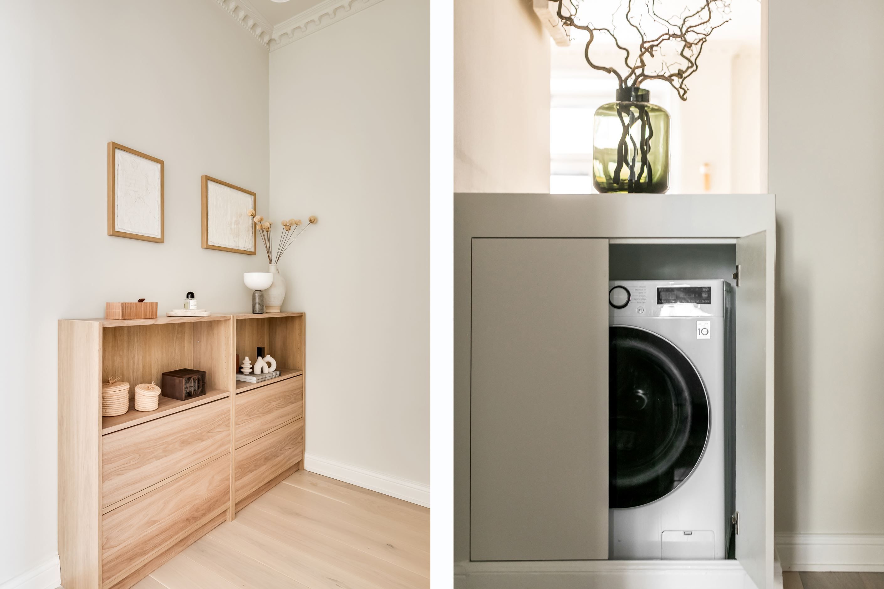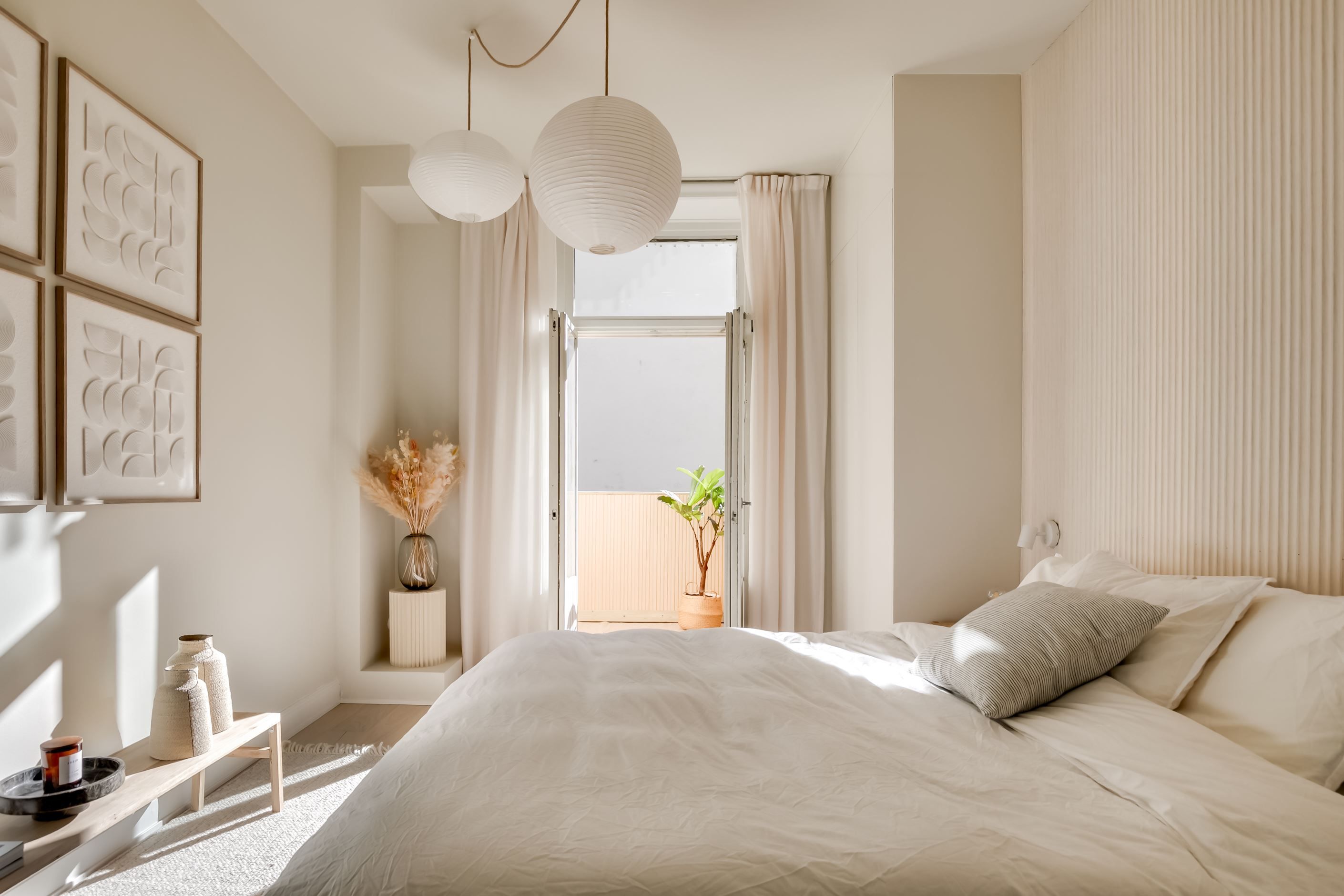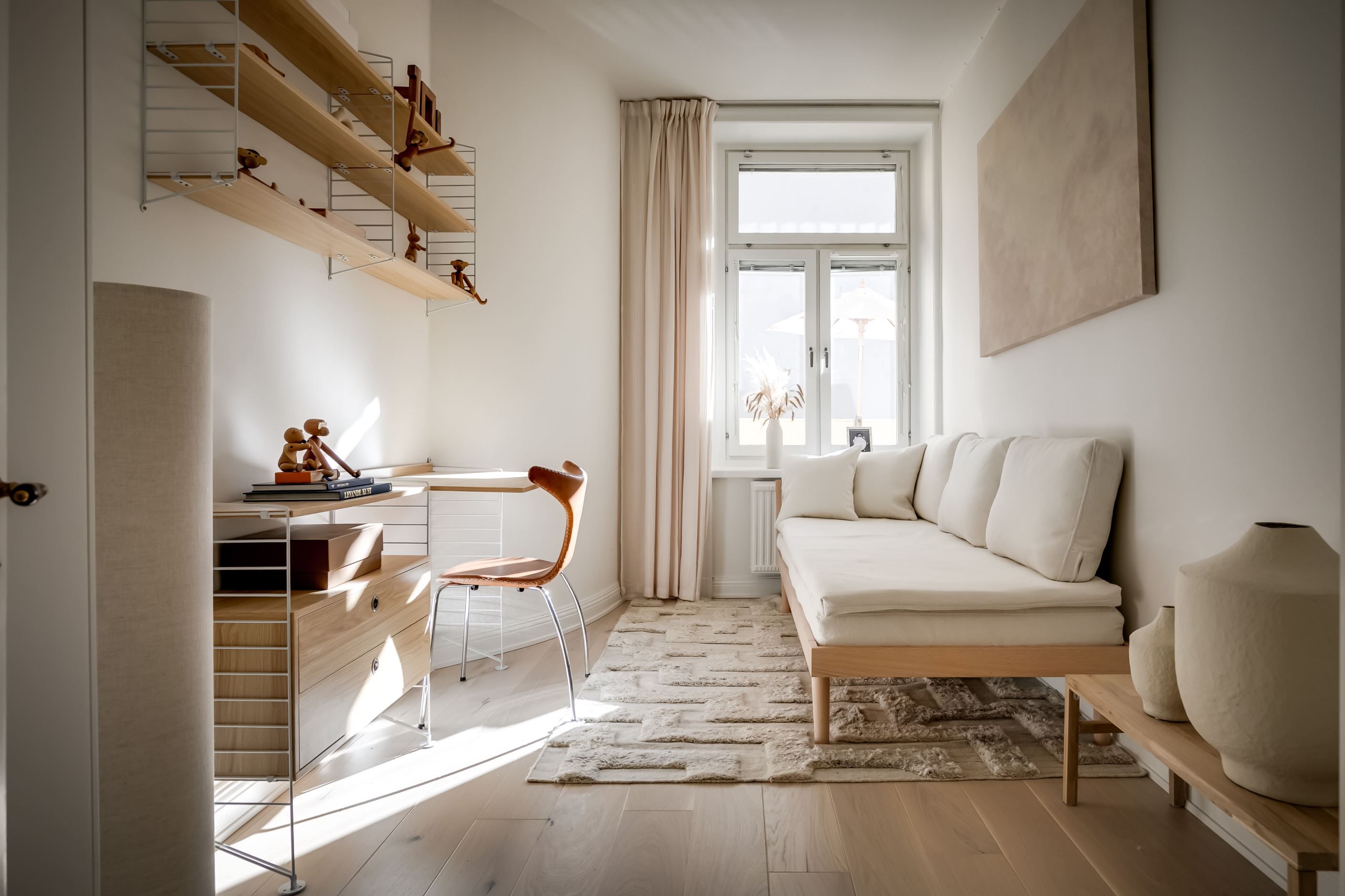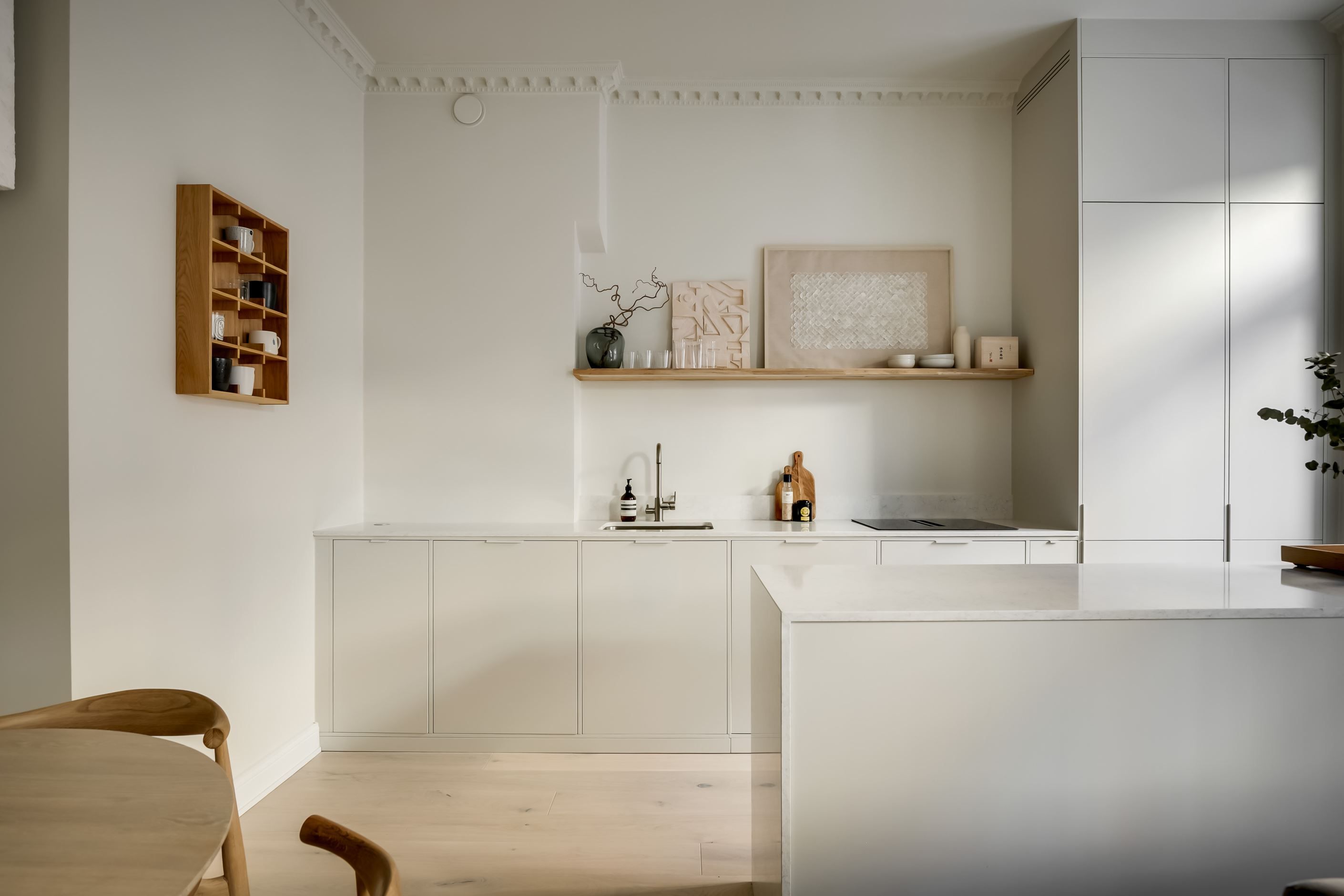 Inredningen är smakfullt renoverad med inspiration från den populära Japandi-stilen, en harmonisk kombination av japansk minimalism och naturliga material med nordisk design och hemtrevnad. Samtidigt är bostadens själ bevarad. Den fungerande kakelugnen sprider värme och atmosfär, stuckaturer och takrosett lyfter takhöjden ytterligare, de höga golvsocklarna ger karaktär och fönstren släpper in ett generöst ljusinsläpp som sprider sig genom rummen. Den omsorgsfulla renoveringen gör att varje detalj, gammal som ny, känns självklar och lyfter fram bostadens unika karaktär.