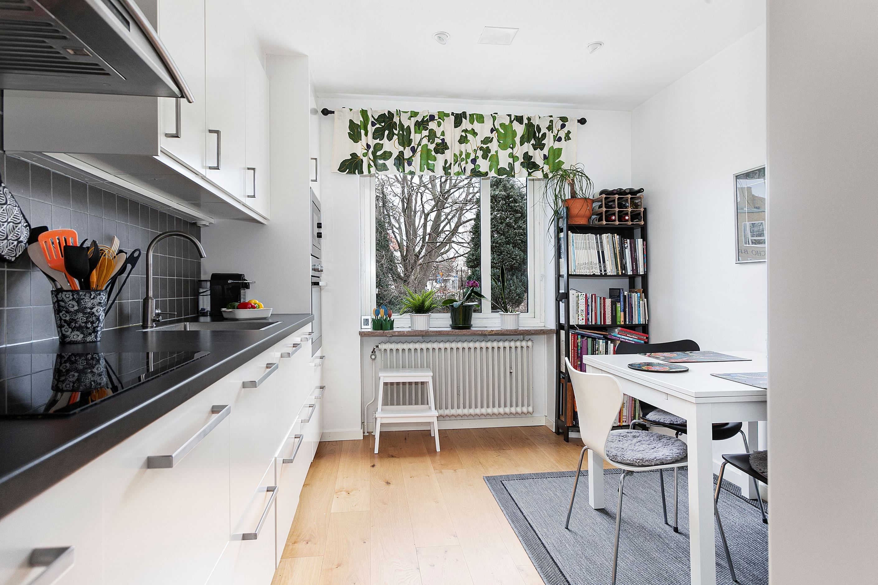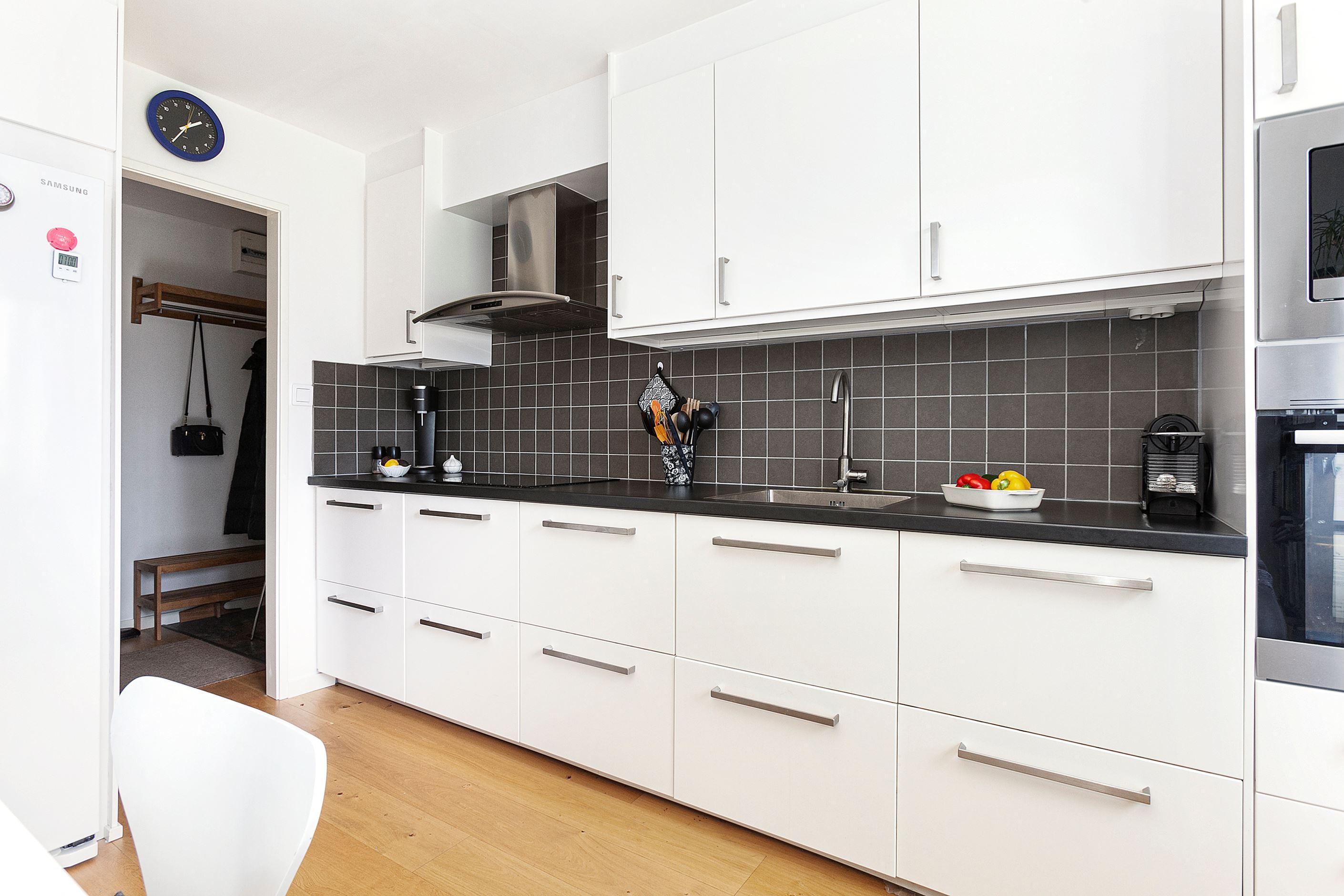 Köket är modernt och välutrustat med plats för en matplats, perfekt för trevliga middagar och sociala stunder. Här finns allt du behöver.