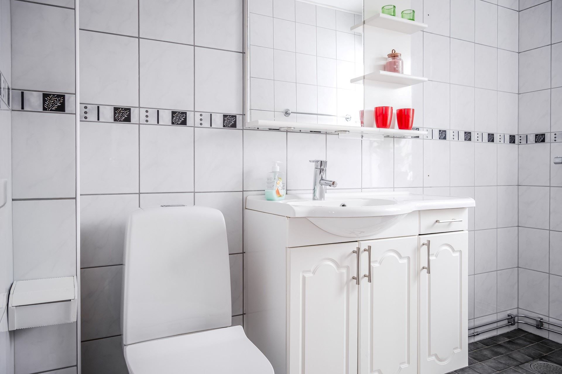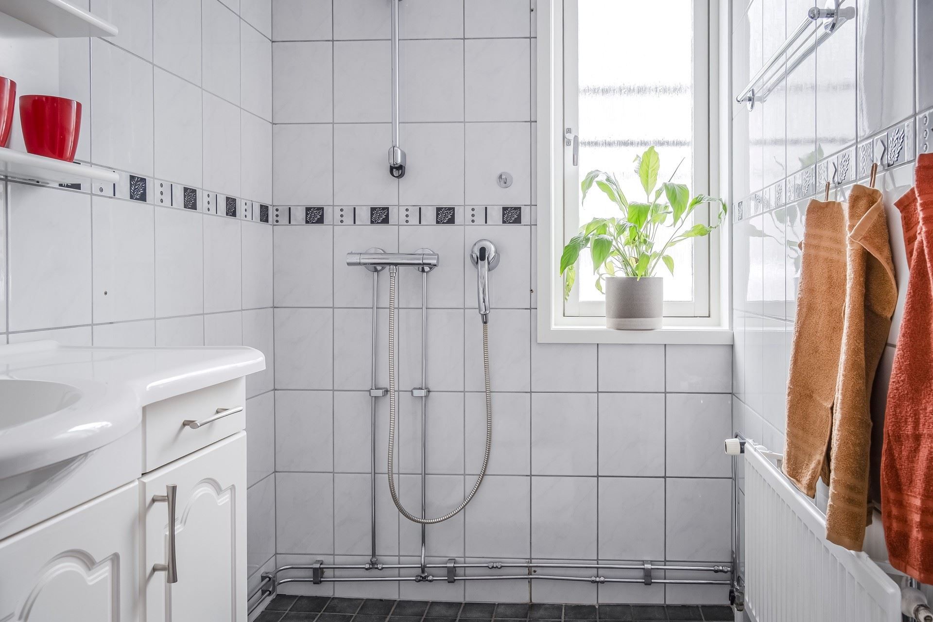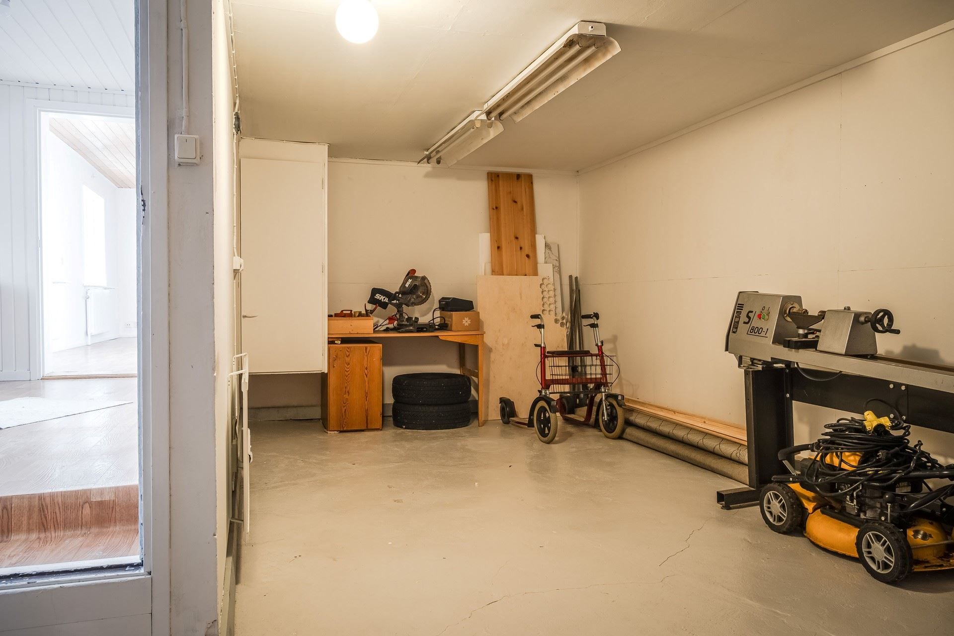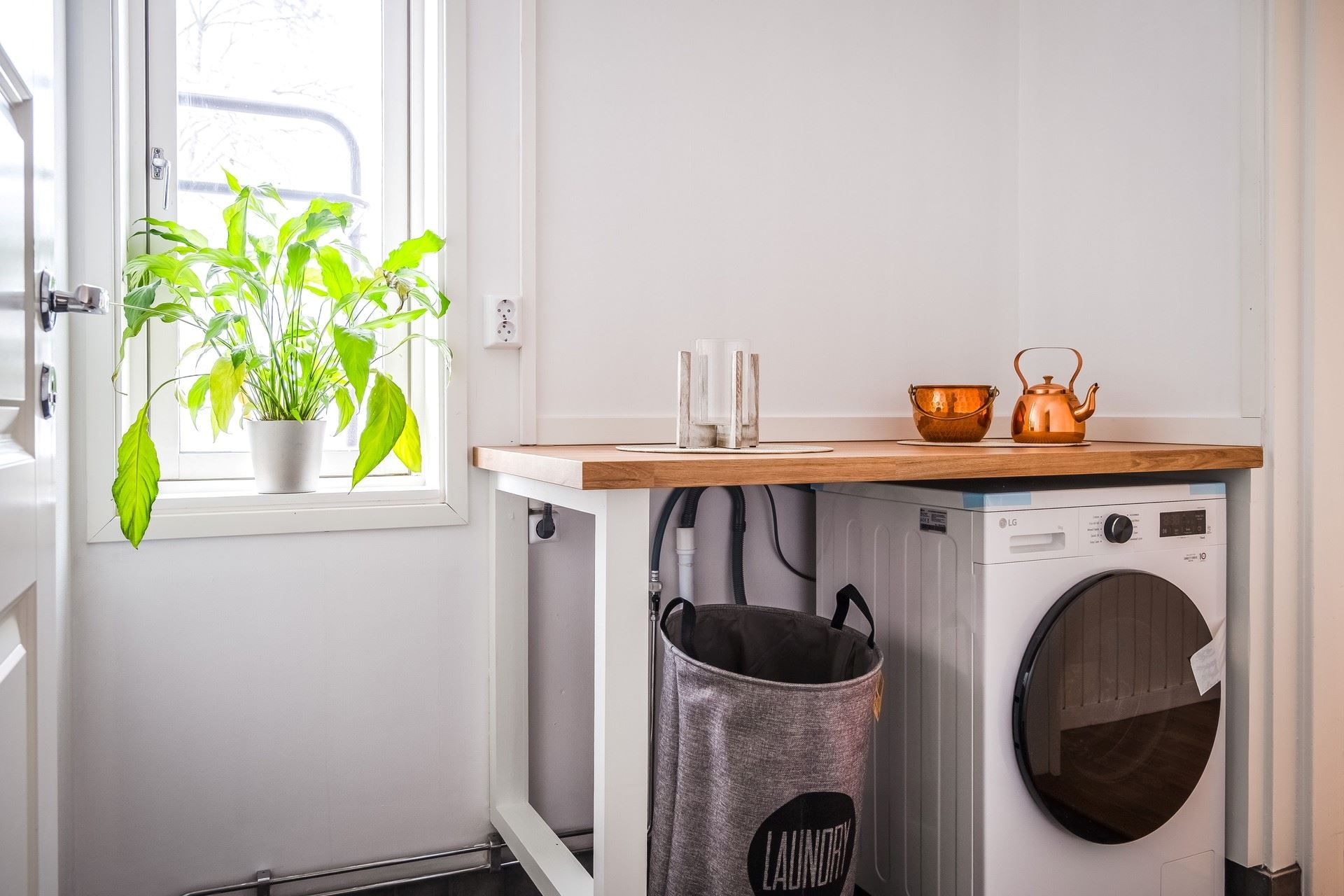 Från hallen når man tvättstugan som också är ett genomgångsrum som leder till ekonomidelen. Tvättstugan har en ny tvättmaskin, vitmålade väggar och ett klinkergolv.