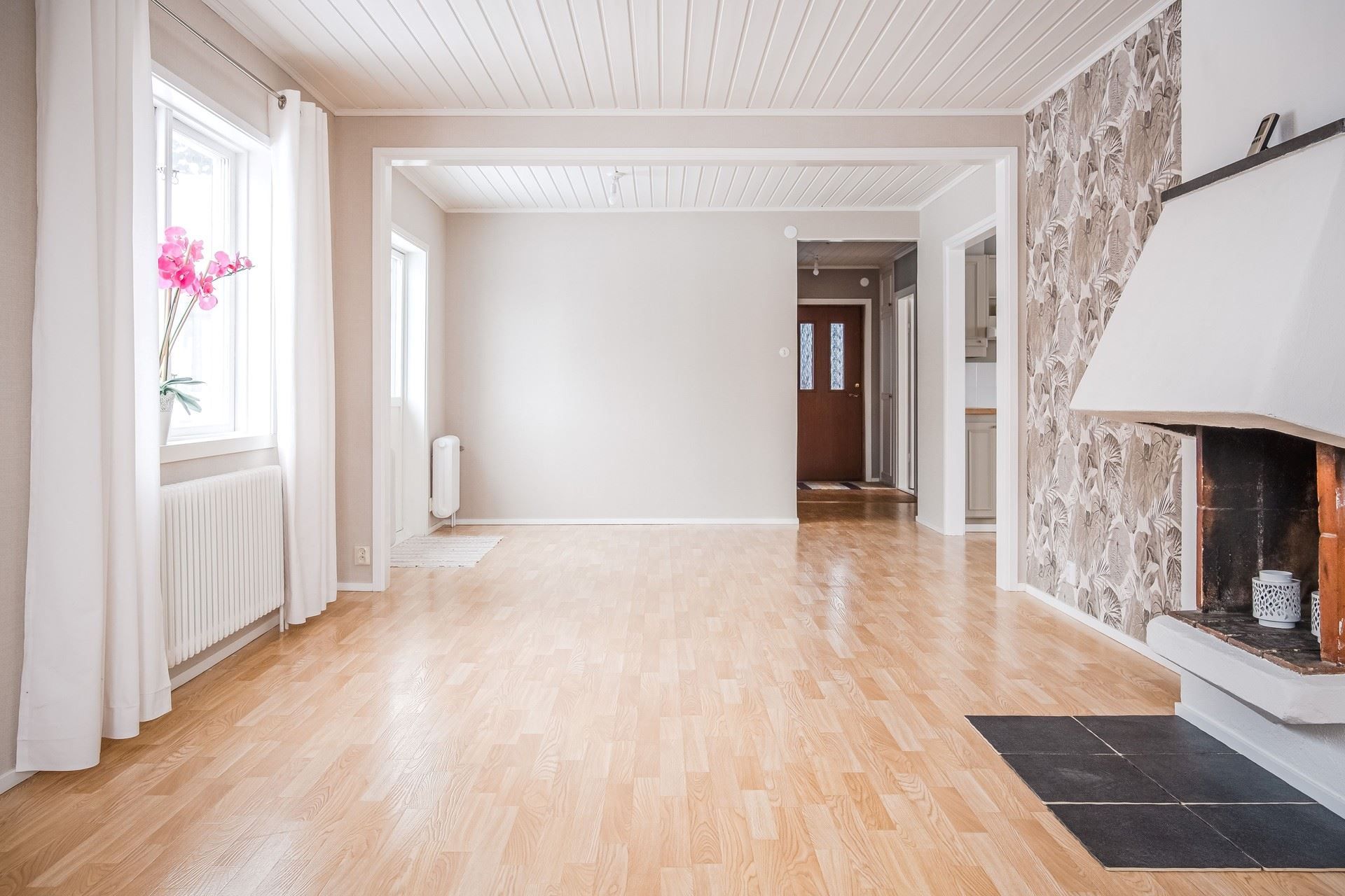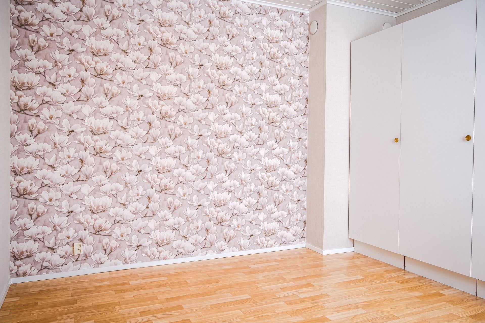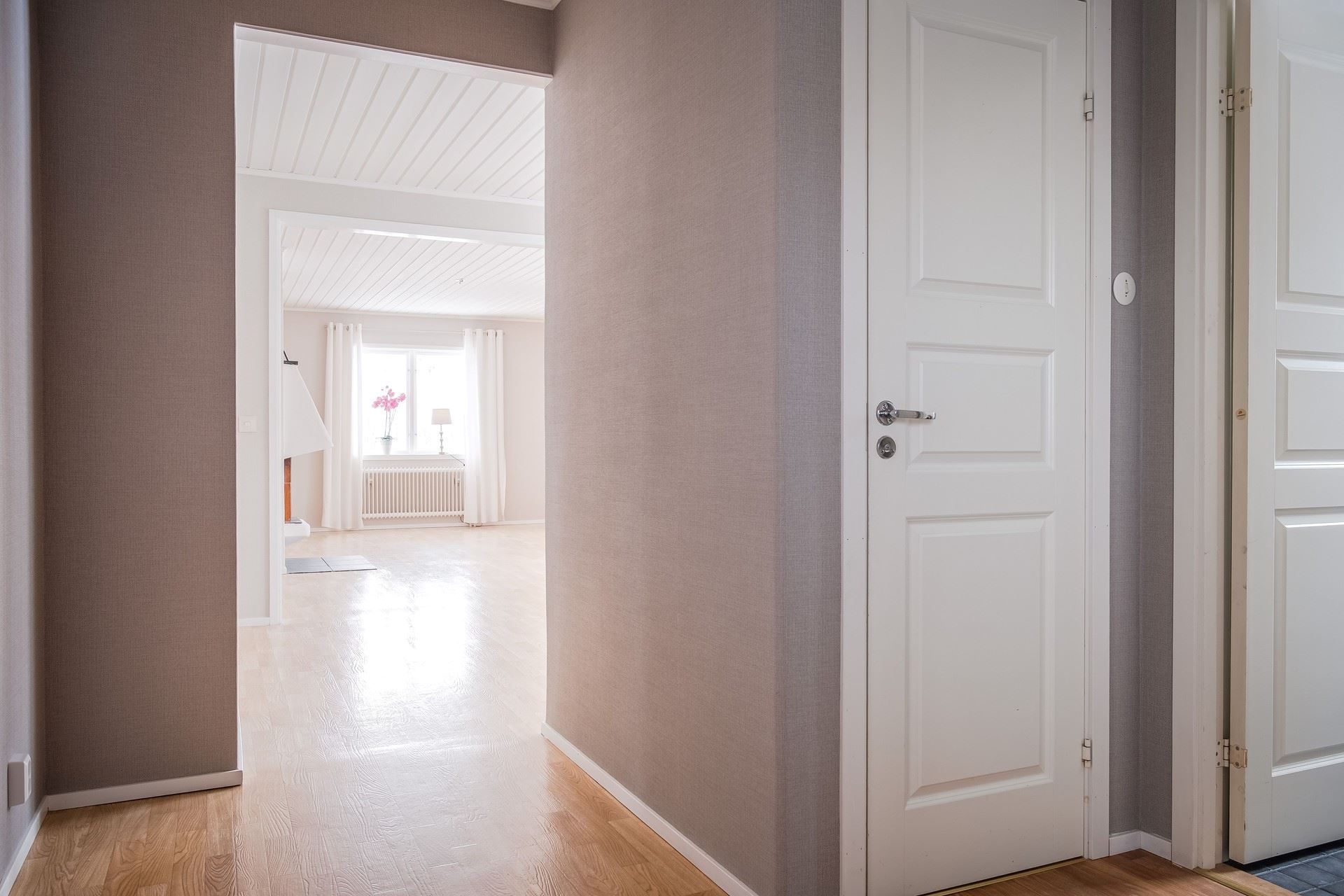 I hallen möts man direkt av ljust tapetserade väggar och en vy in i det stora vardagsrummen. Intill hallen ligger också ett sovrum och badrummet.