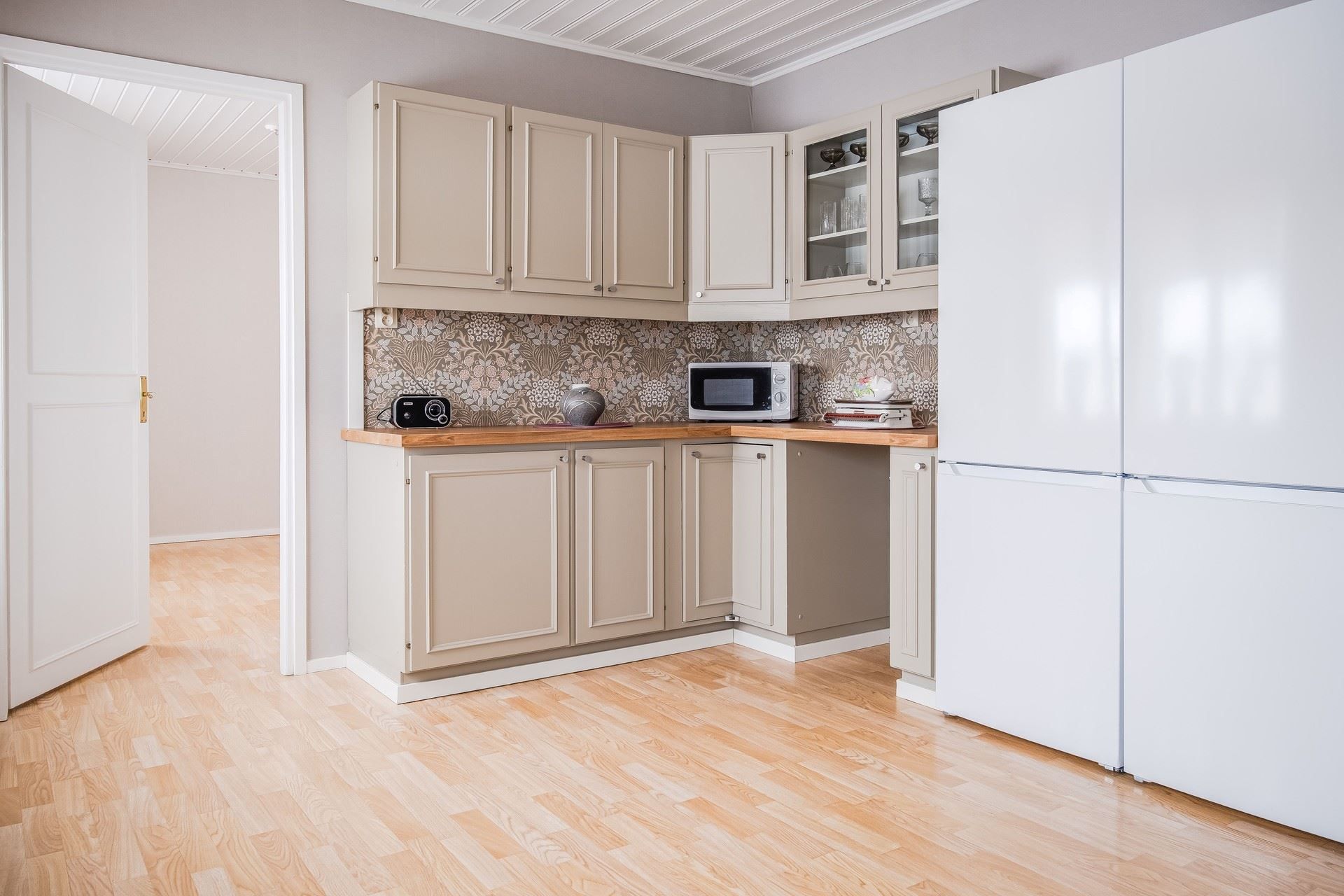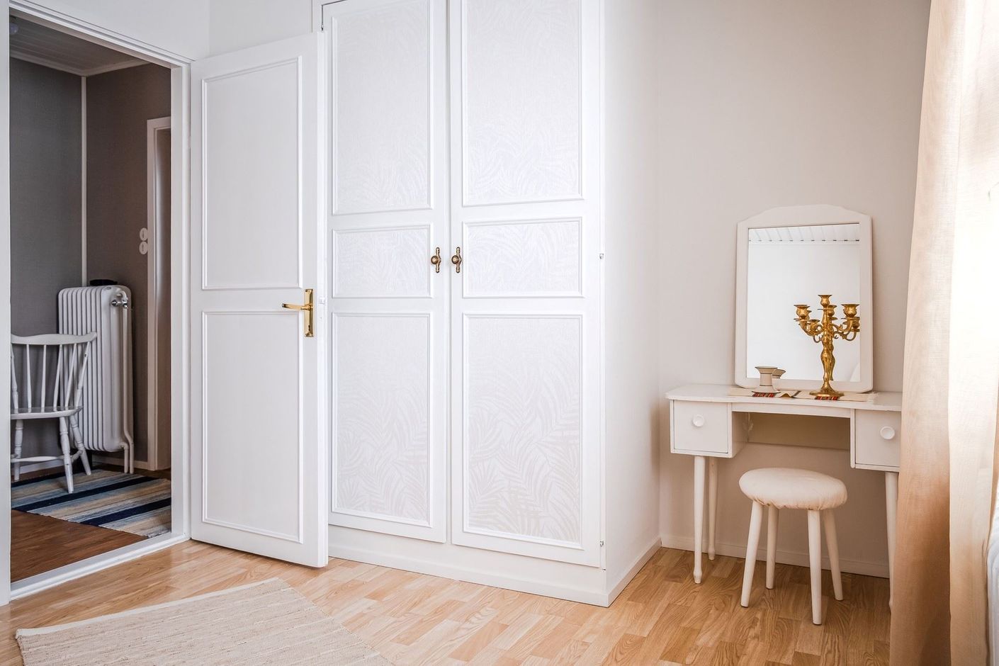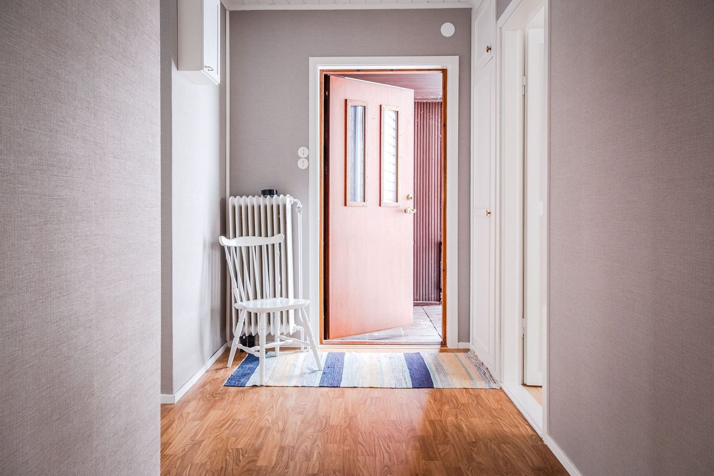 I hallen möts man direkt av ljust tapetserade väggar och en vy in i det stora vardagsrummen. Intill hallen ligger också ett sovrum och badrummet.