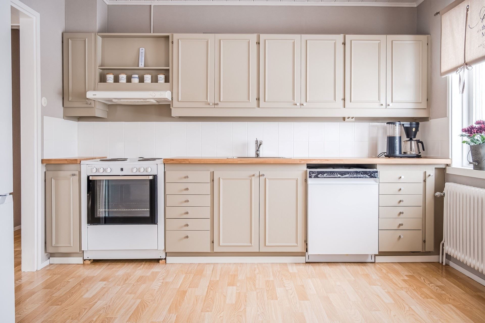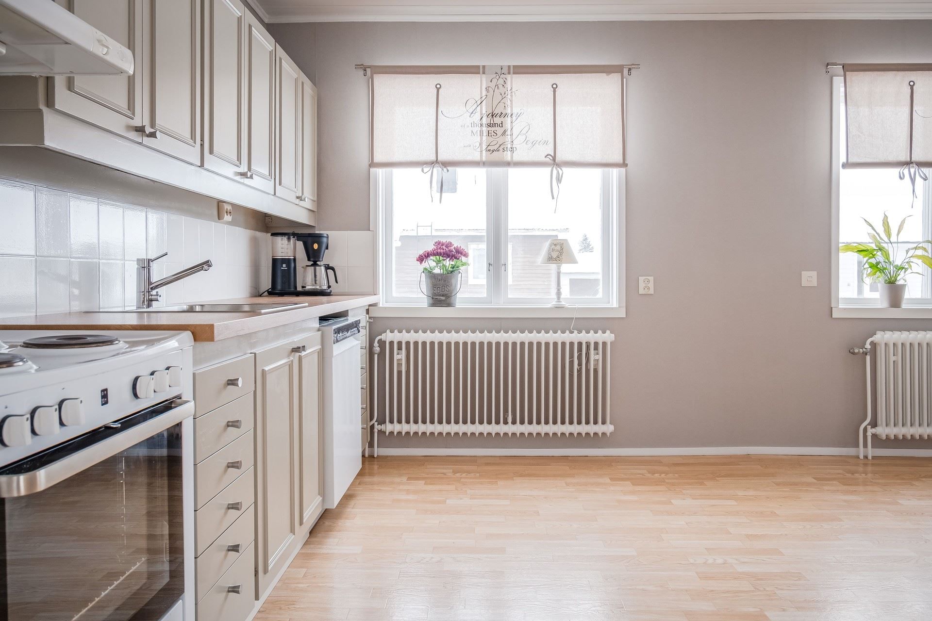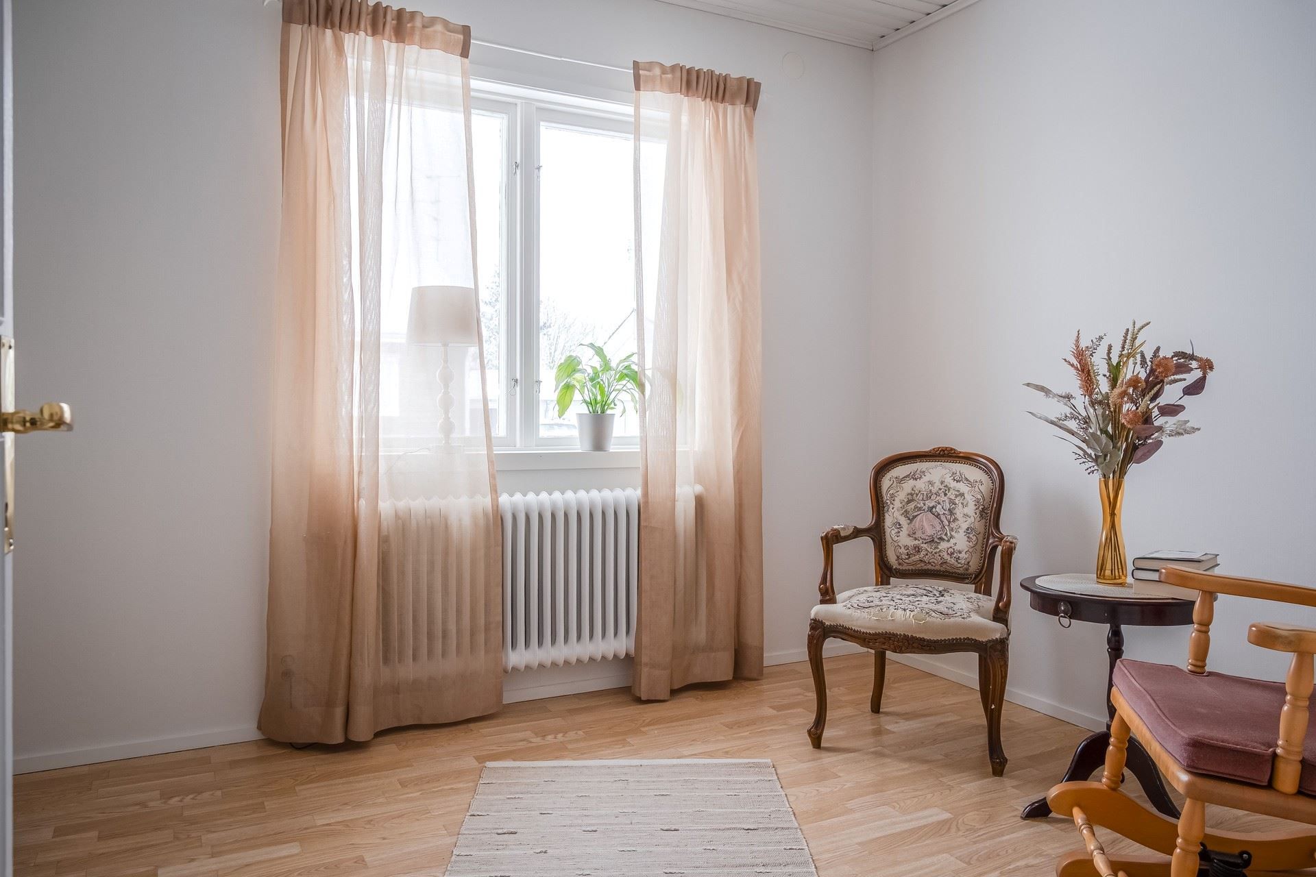 Vardagsrummet har ett fint ljusinsläpp, fönster i två väderstreck och dubbla dörrar ut till altan och bakgård med fint solläge. Precis intill finner man köket. Köket har fått nya och uppfräschade ytskikt. Väggarna är nytapetserade, skåpsluckorna har blivit målade, köket har fått nya bänkskivor och mestadels nya vitvaror. Från köket når man ett sovrum med tapetserade väggar och tre garderober.