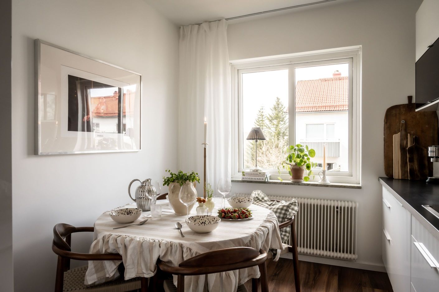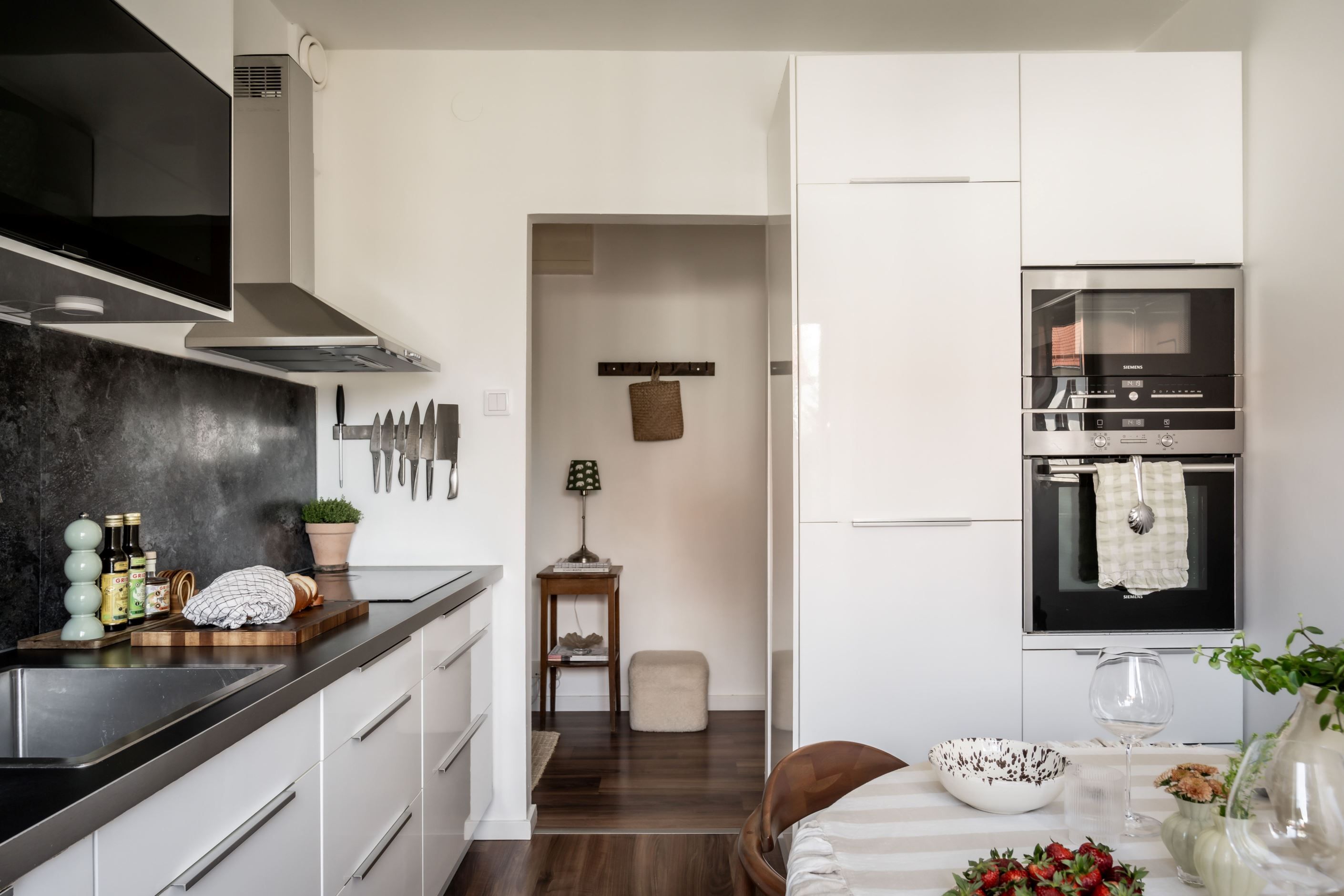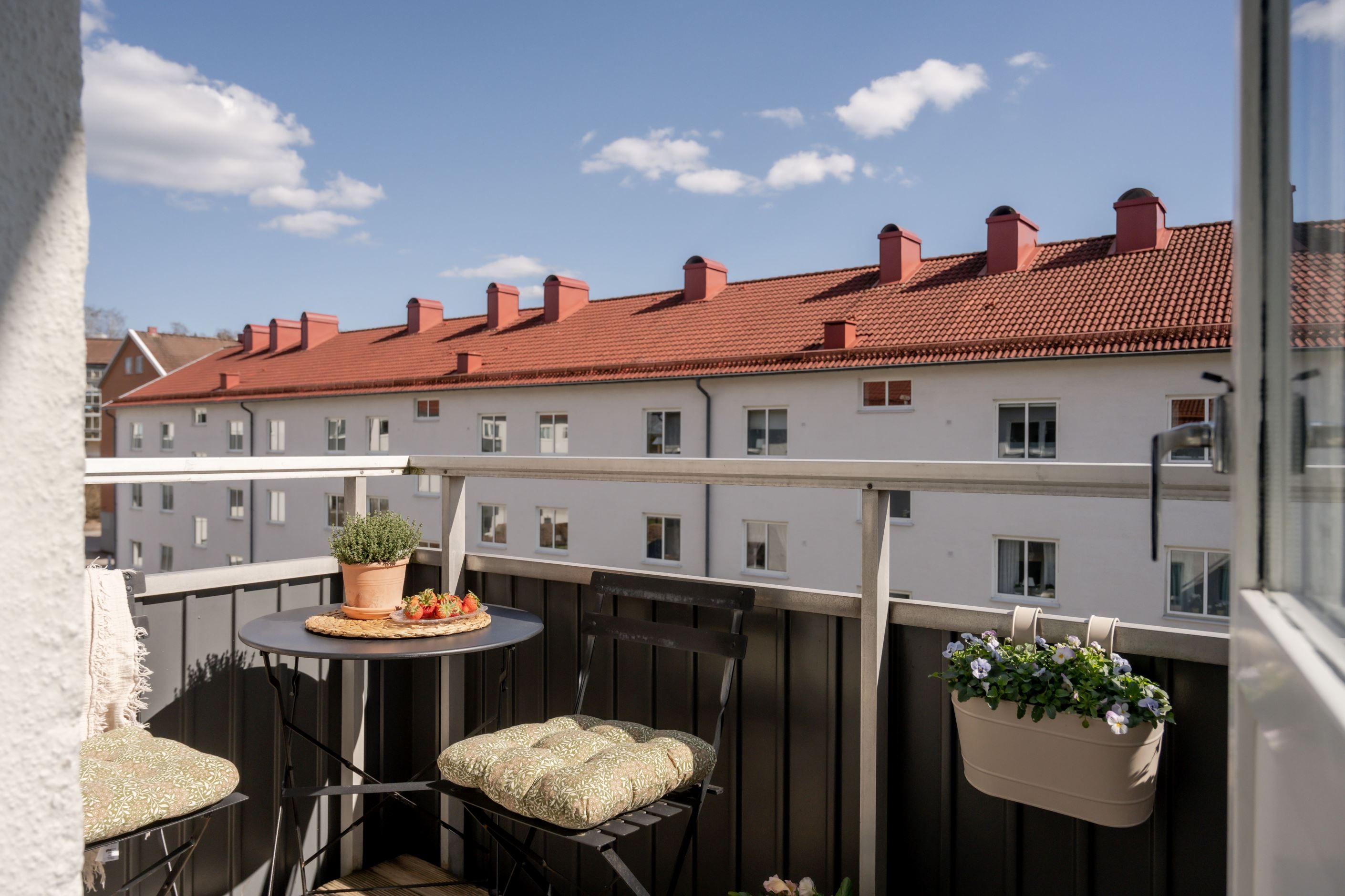 Köket är smakfullt med vita luckor och skåp tillsammans med en mörk bänkskiva. Här ryms en matplats vid fönstret och vitvarorna är snyggt integrerade. Vardagsrummet är luftigt med gott om plats för både soffgrupp och matsalsdel, och härifrån nås en balkong i soligt läge.