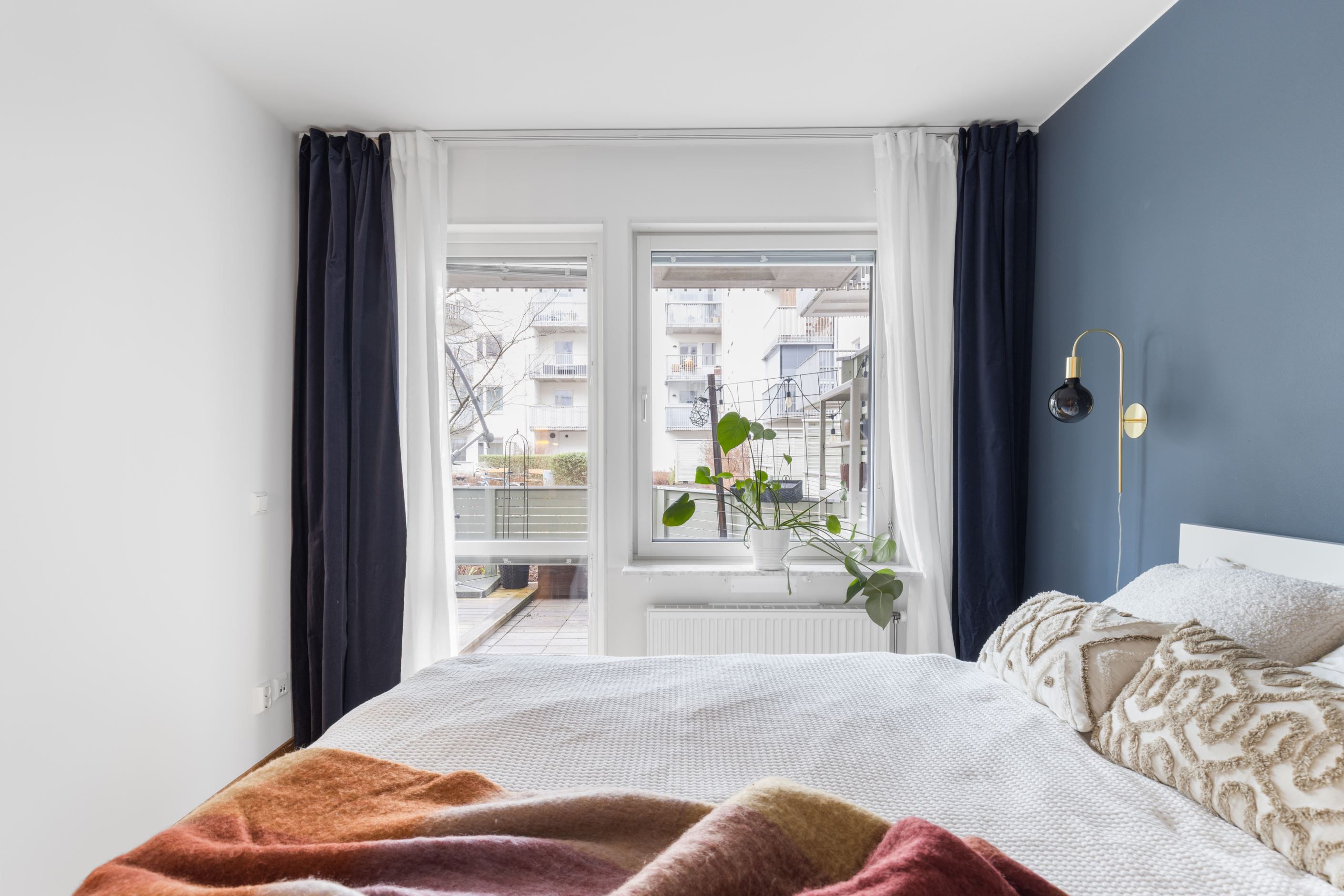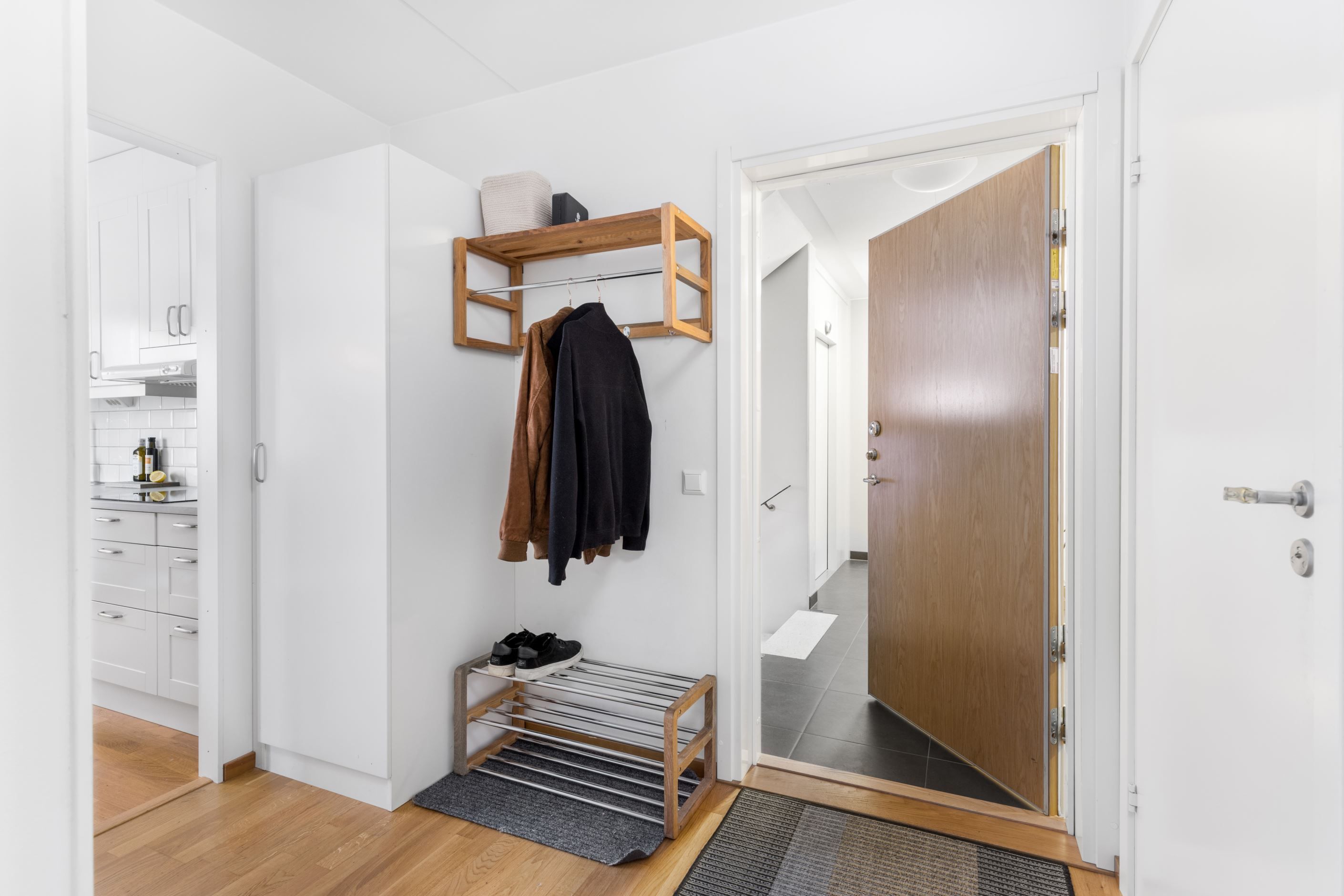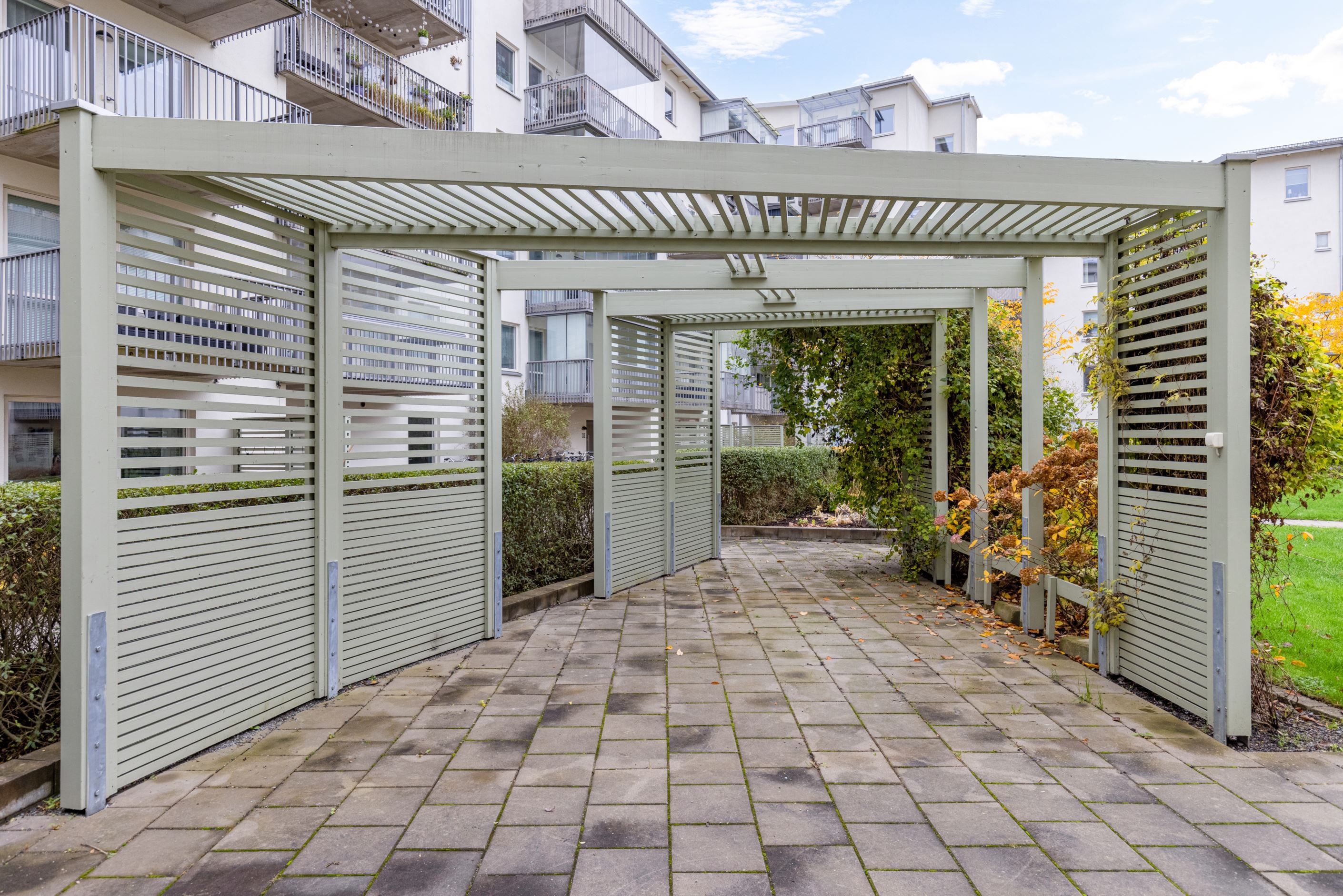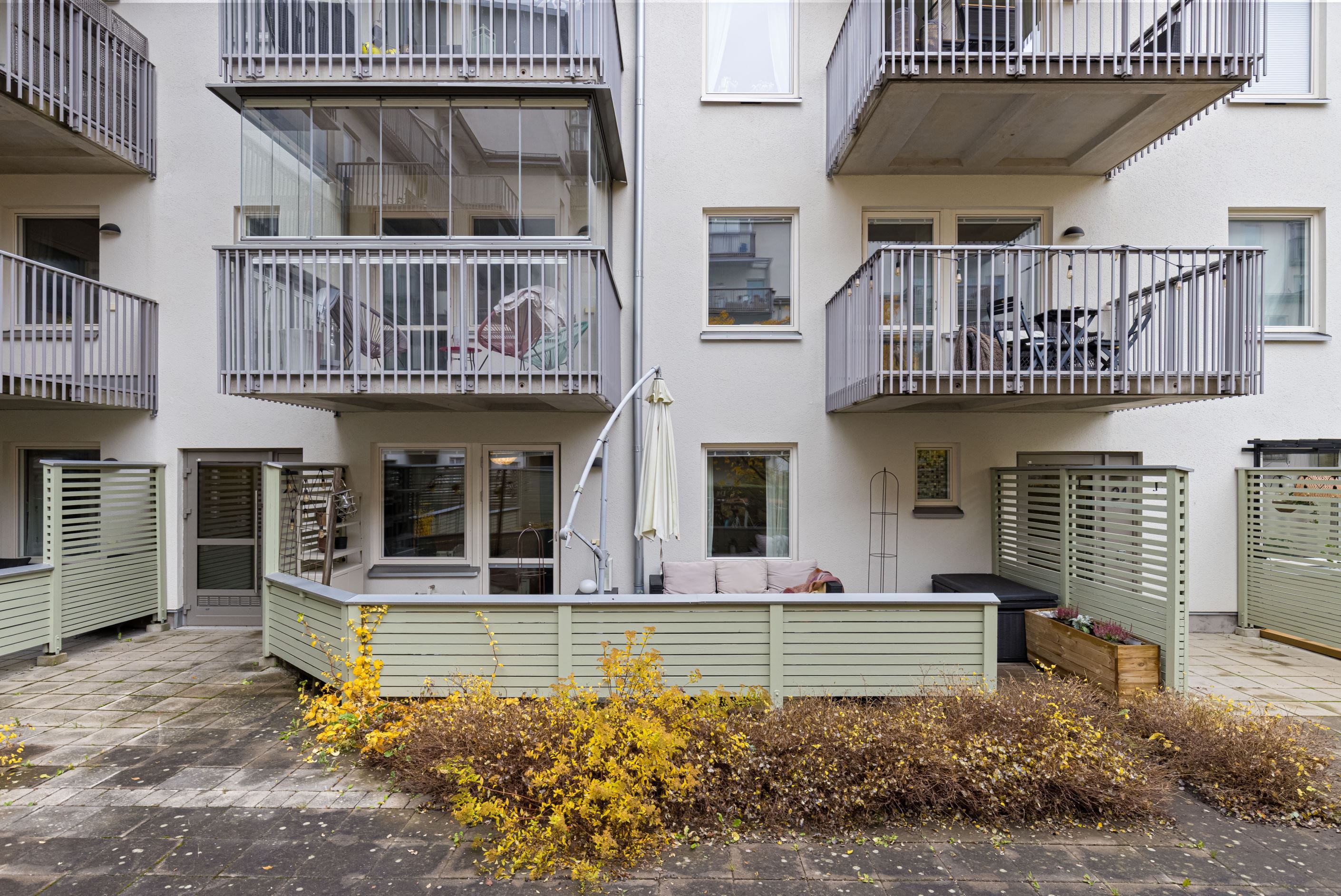 Hallen erbjuder praktiskt avhängning och gott om förvaring i form av garderob samt klädkammare. Köket är modernt och funktionellt med bra arbetsytor och plats för både vardag och middagsgäster. Vardagsrummet är ljust och rymligt med stora fönsterpartier. Intill ligger det större sovrummet med utgång till bostadens höjdpunkt - den egna uteplatsen med lugn och grön inramning, perfekt för grillkvällar, avkoppling och mysiga stunder i solen.
