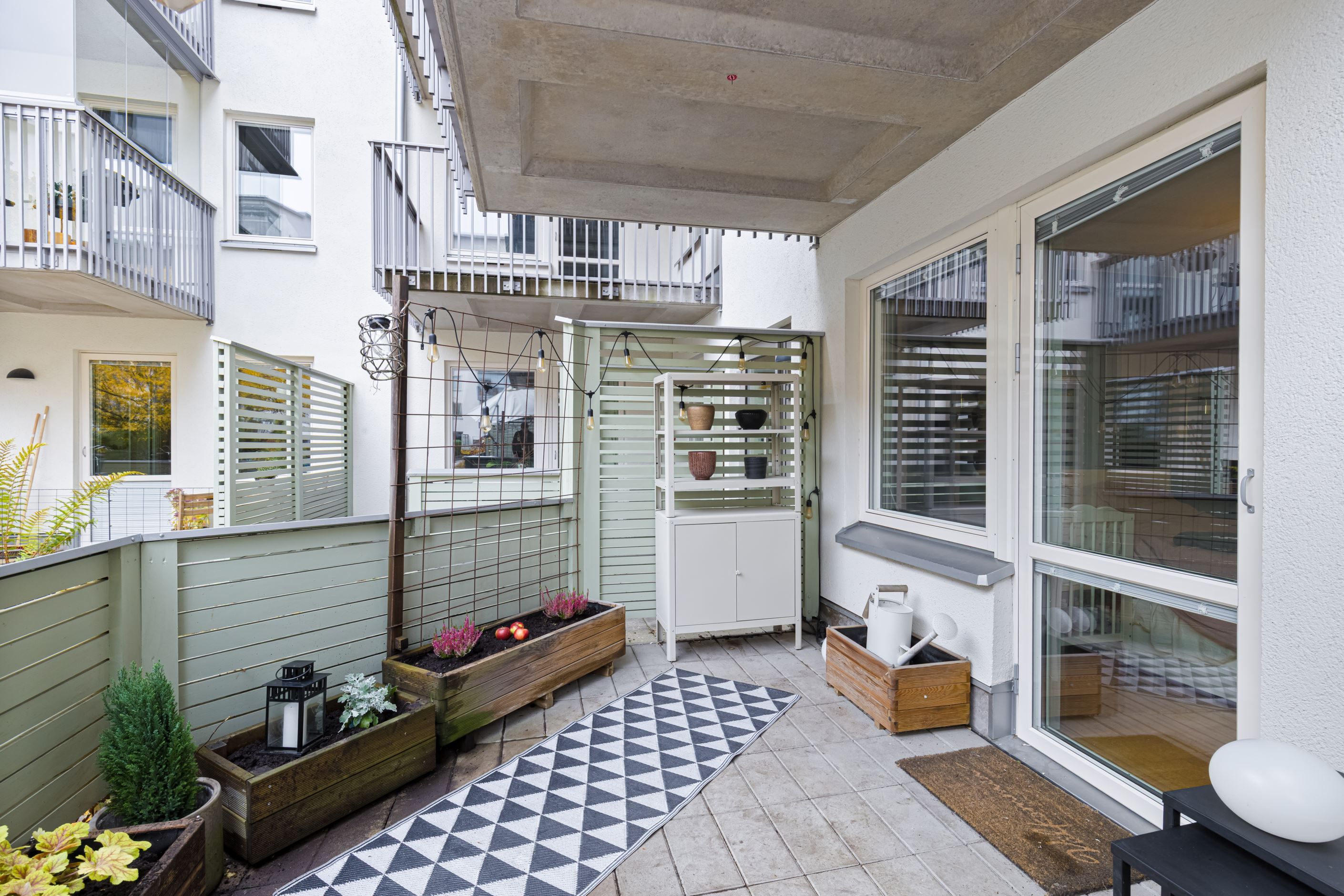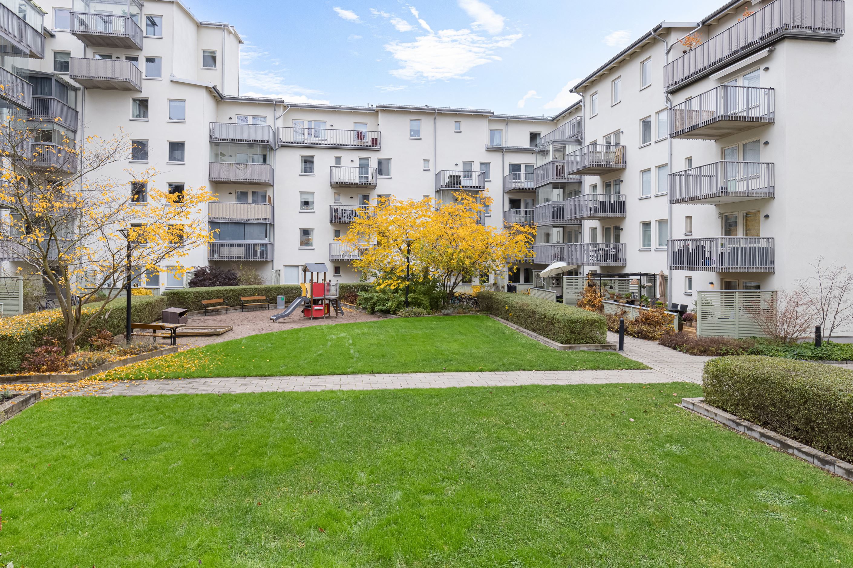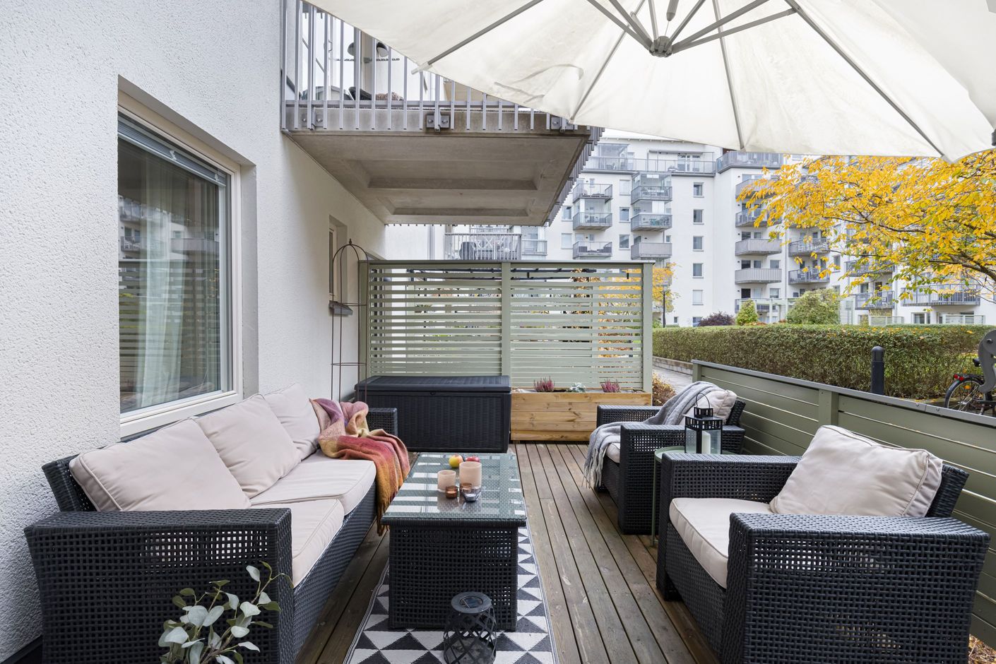 Hallen erbjuder praktiskt avhängning och gott om förvaring i form av garderob samt klädkammare. Köket är modernt och funktionellt med bra arbetsytor och plats för både vardag och middagsgäster. Vardagsrummet är ljust och rymligt med stora fönsterpartier. Intill ligger det större sovrummet med utgång till bostadens höjdpunkt - den egna uteplatsen med lugn och grön inramning, perfekt för grillkvällar, avkoppling och mysiga stunder i solen.