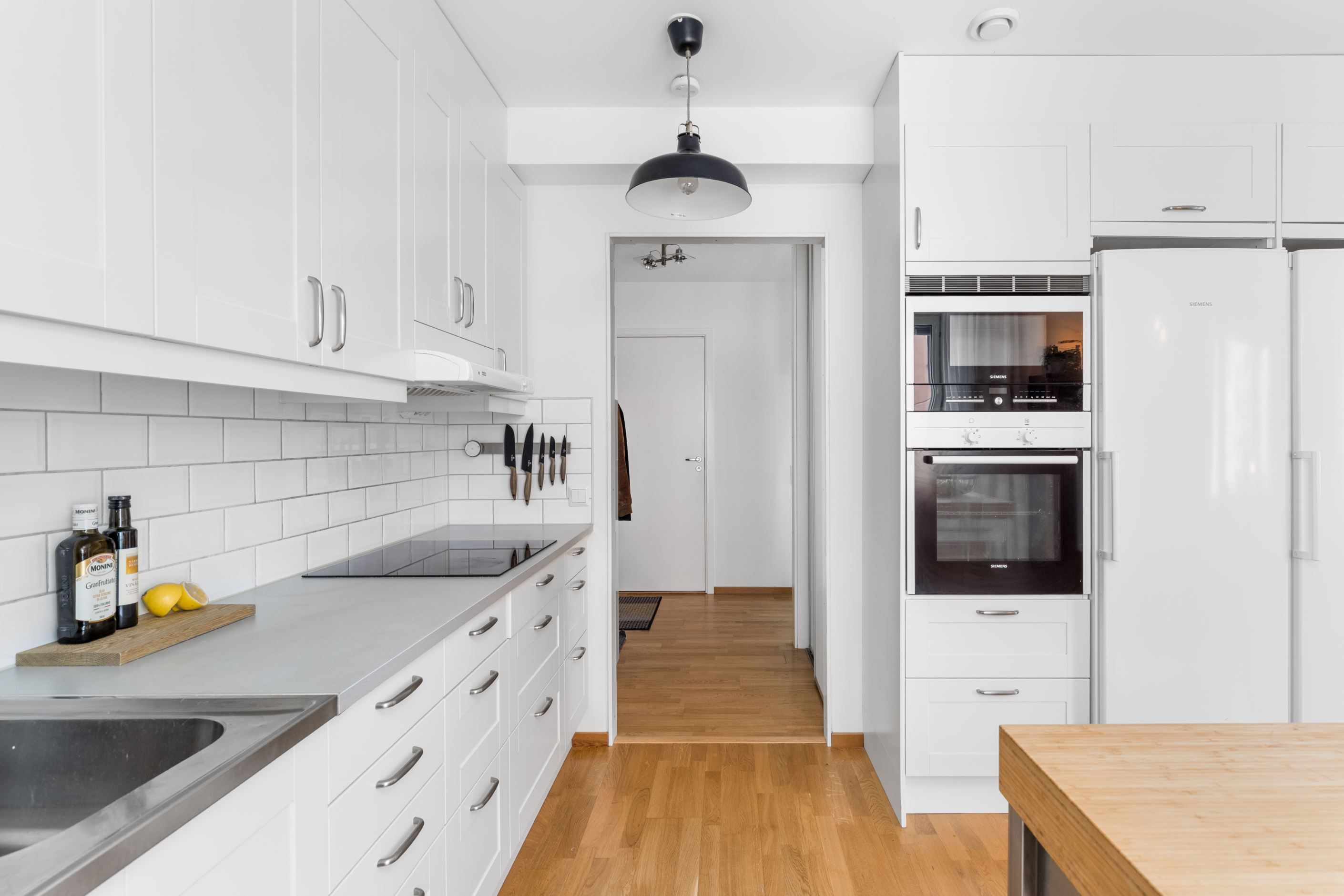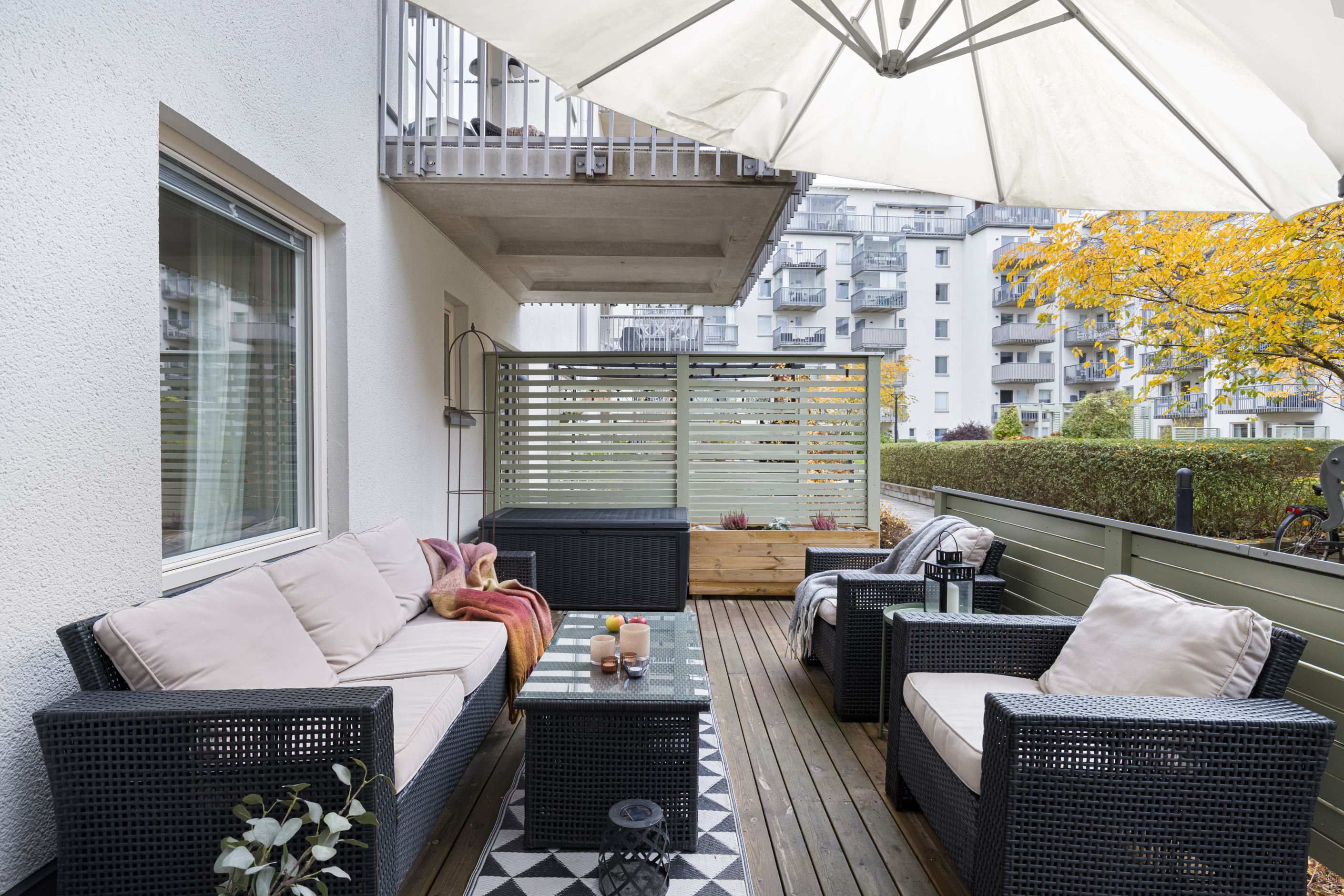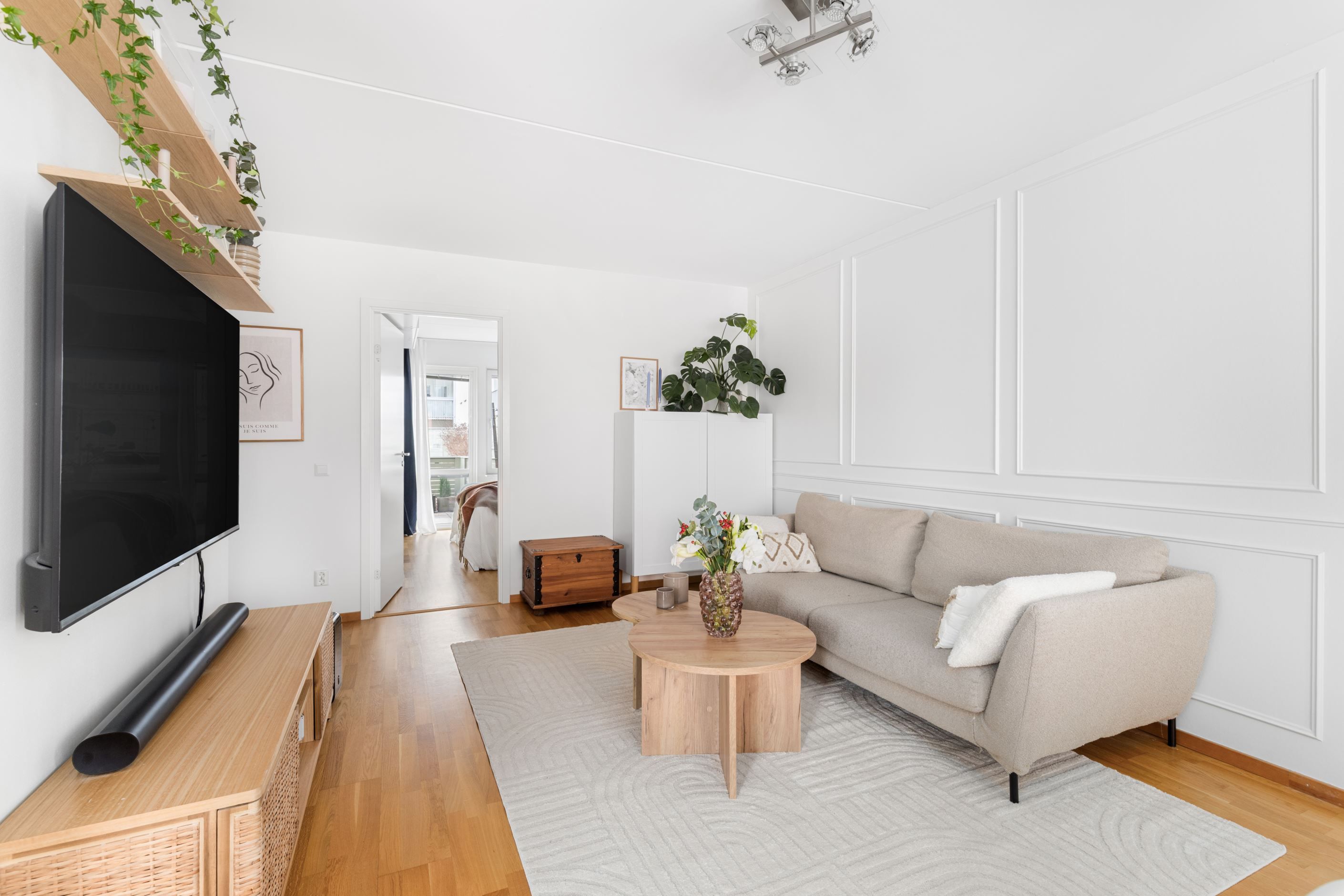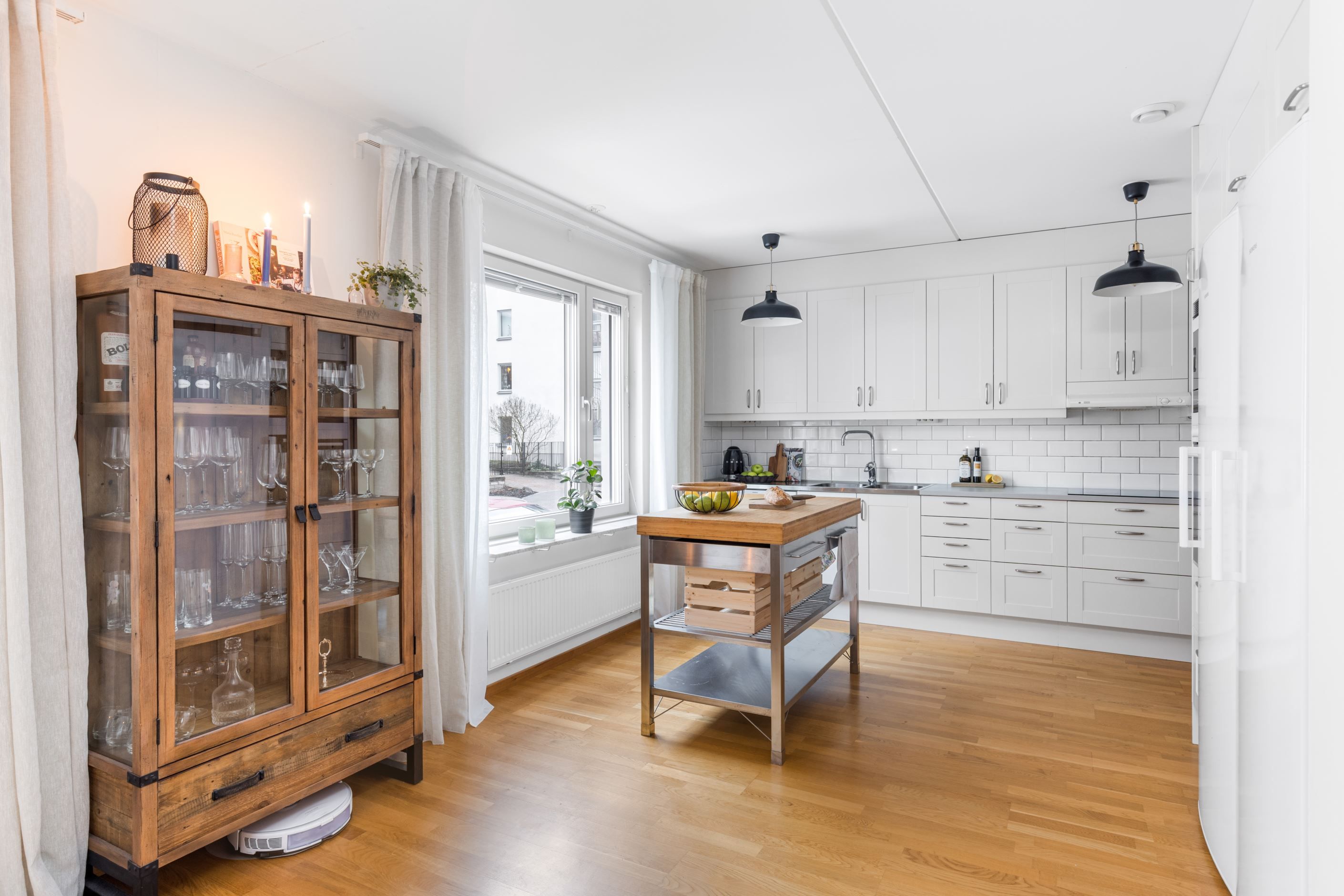 Hallen erbjuder praktiskt avhängning och gott om förvaring i form av garderob samt klädkammare. Köket är modernt och funktionellt med bra arbetsytor och plats för både vardag och middagsgäster. Vardagsrummet är ljust och rymligt med stora fönsterpartier. Intill ligger det större sovrummet med utgång till bostadens höjdpunkt - den egna uteplatsen med lugn och grön inramning, perfekt för grillkvällar, avkoppling och mysiga stunder i solen.