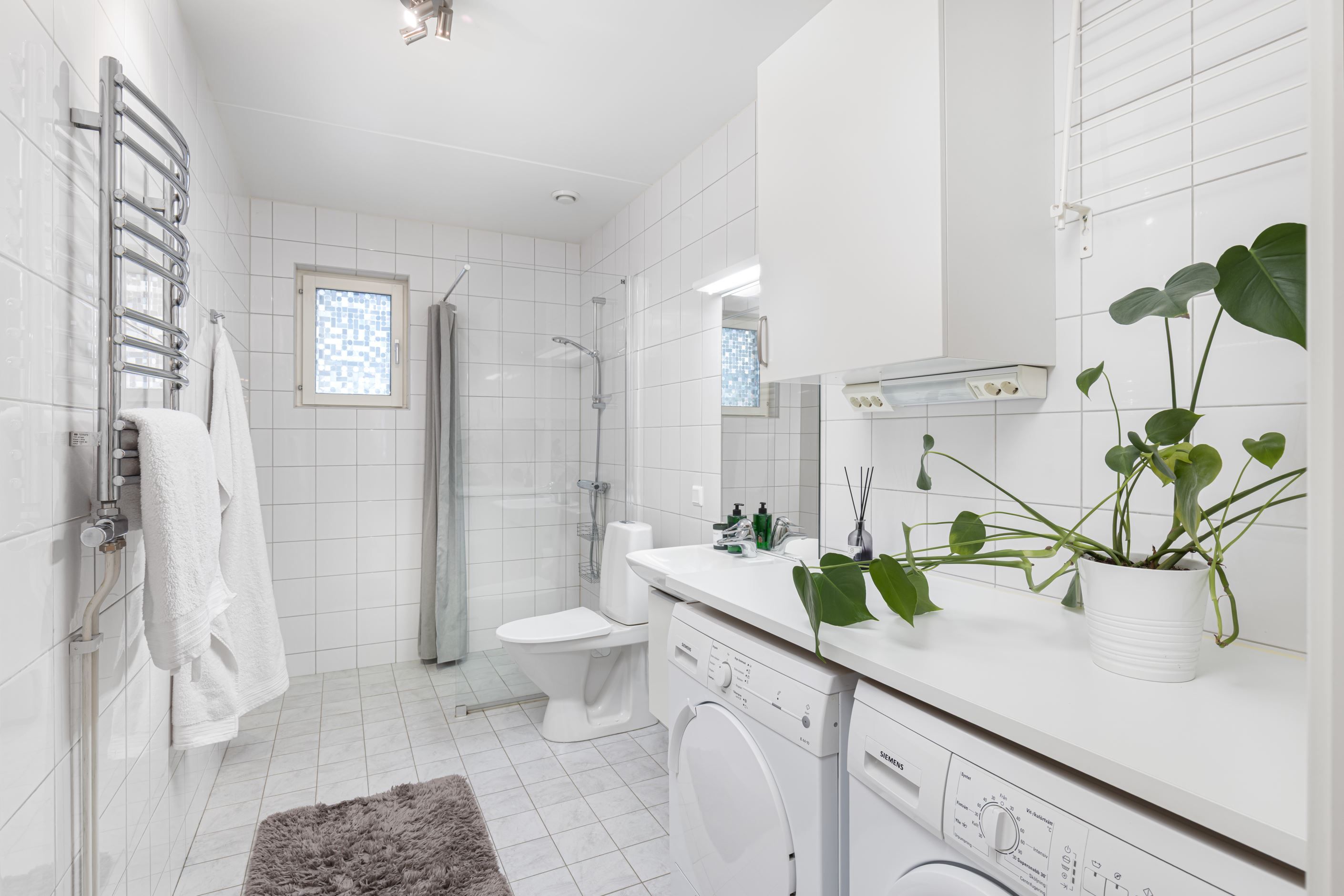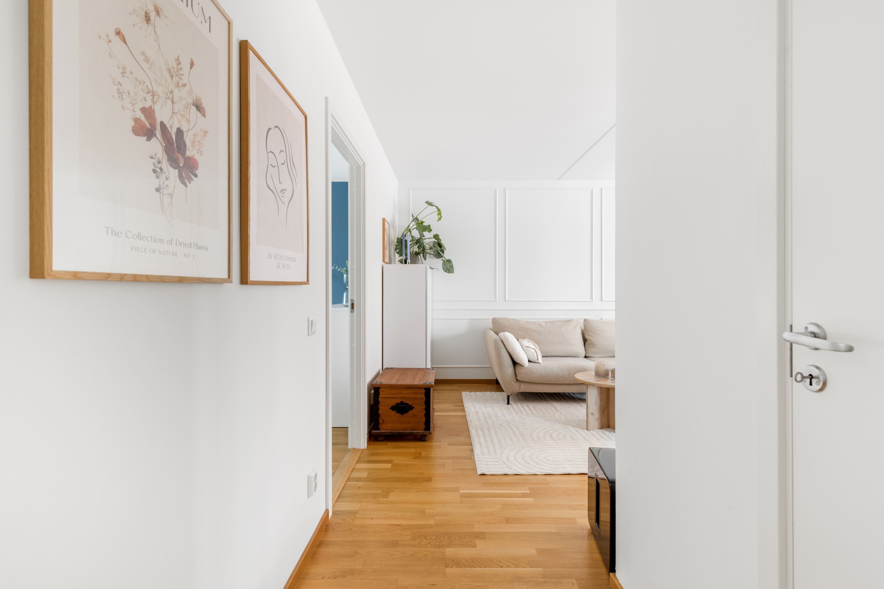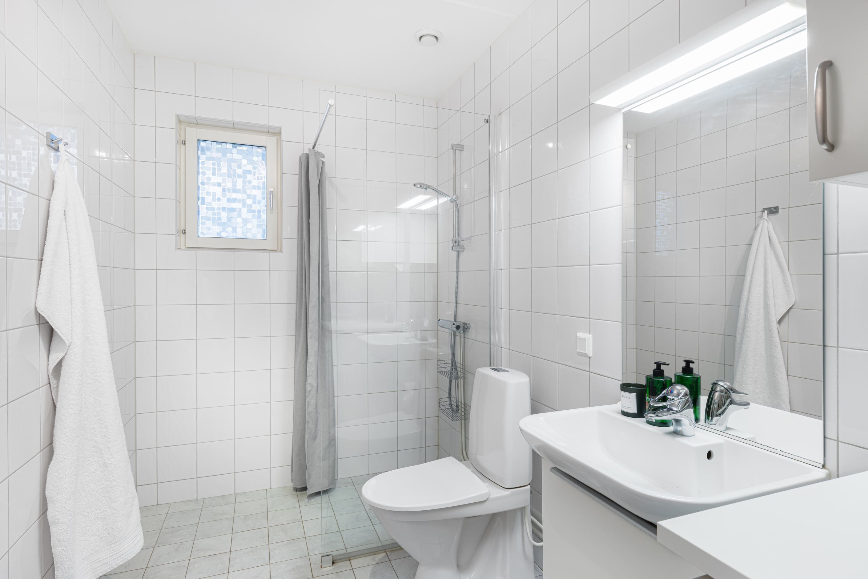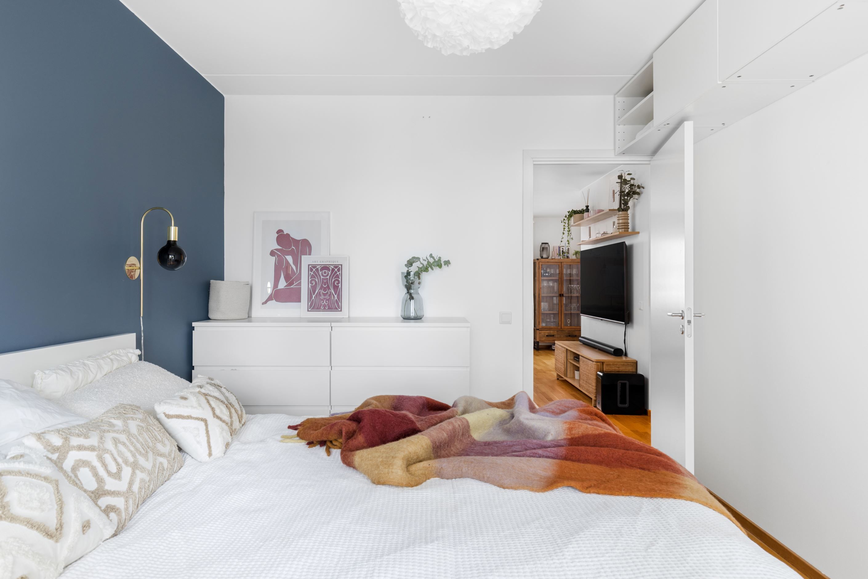 Från hallen når du bostadens andra sovrum samt det moderna badrummet, utrustat med både tvättmaskin och torktumlare.
