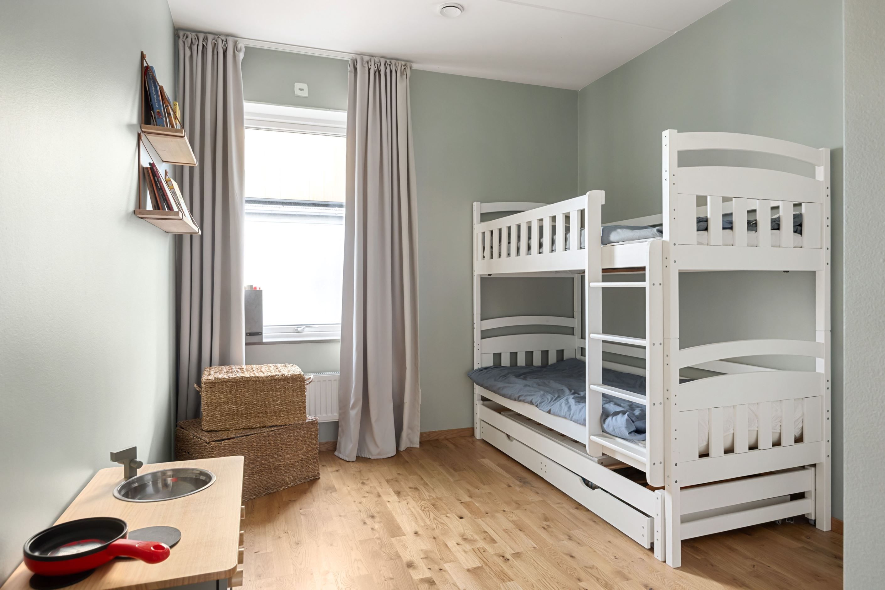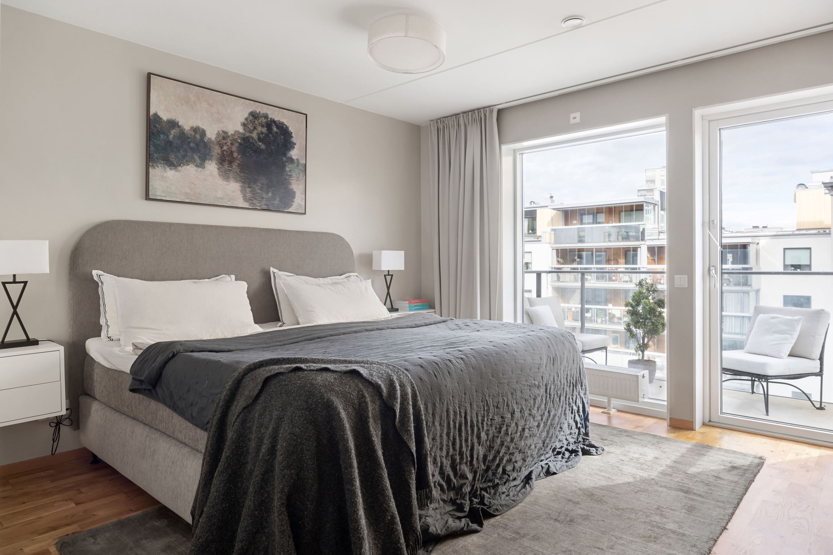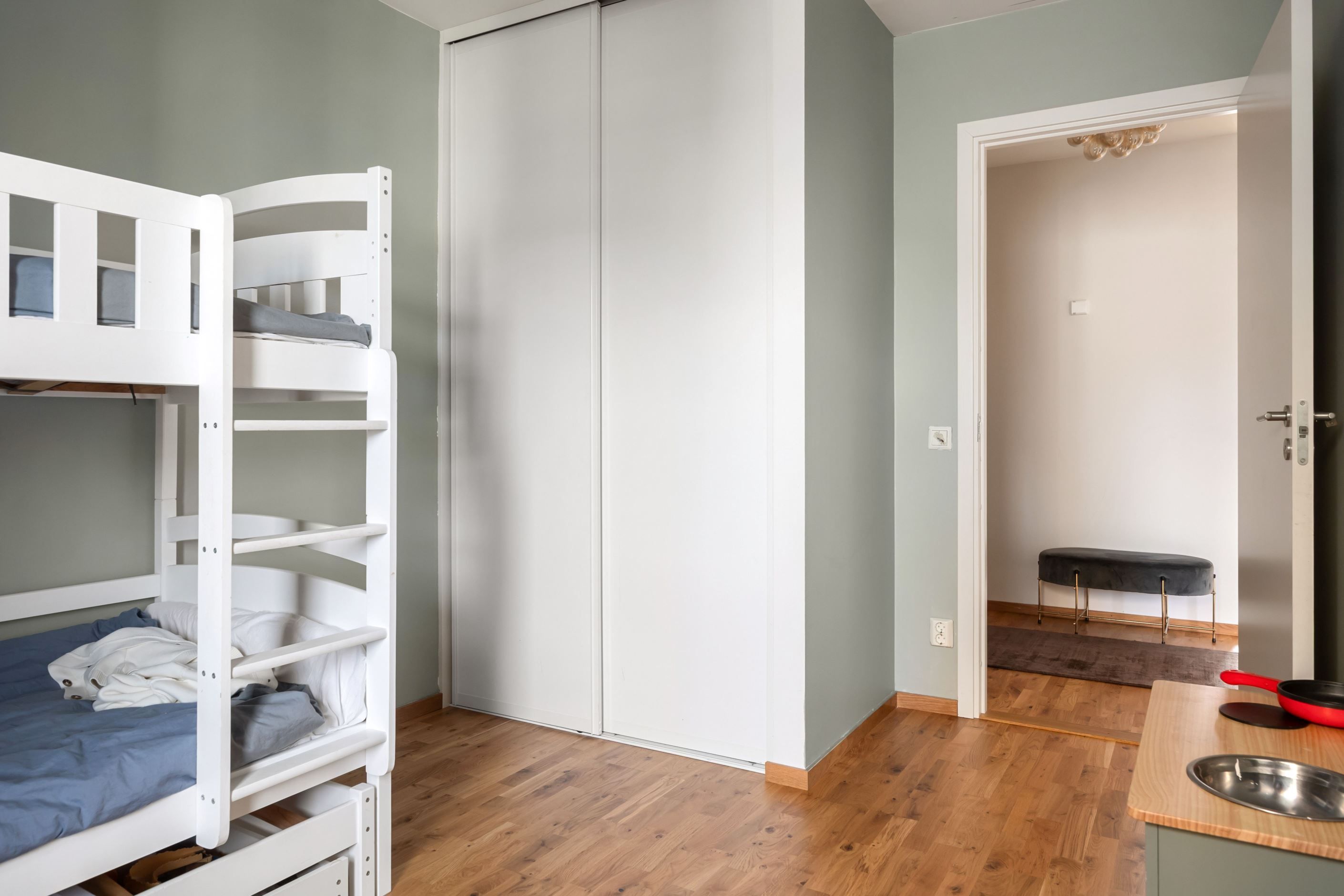 Bostaden erbjuder två sovrum i bra storlek. Det större sovrummet rymmer enkelt en dubbelsäng och har utgång till den andra balkongen, vilket skapar en lugn och avskild känsla. Det mindre sovrummet passar utmärkt som barnrum, gästrum eller hemmakontor. Förvaringen i bostaden är mycket god tack vare flera garderober samt en praktisk klädkammare som ger extra utrymme och bidrar till ett välorganiserat hem.