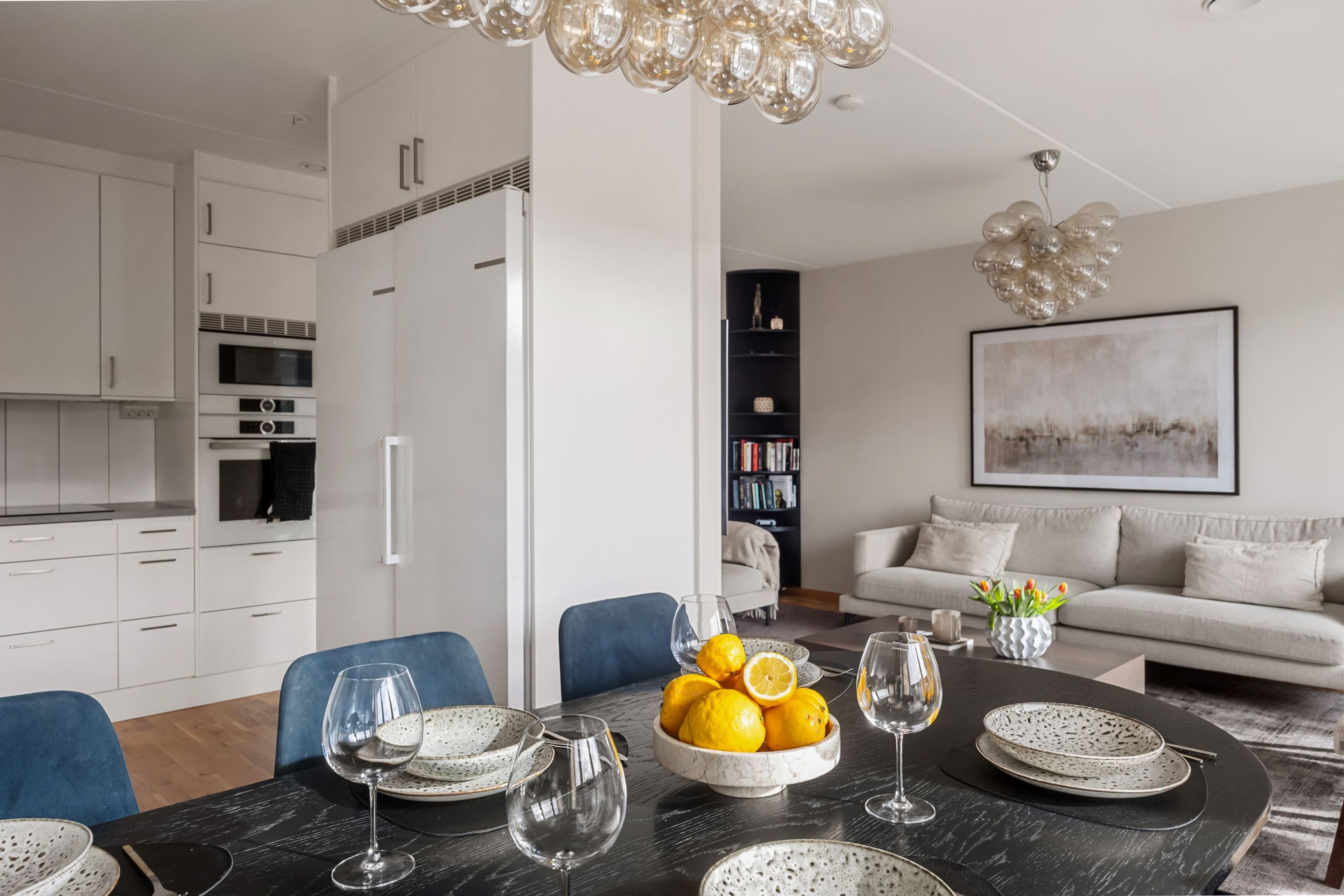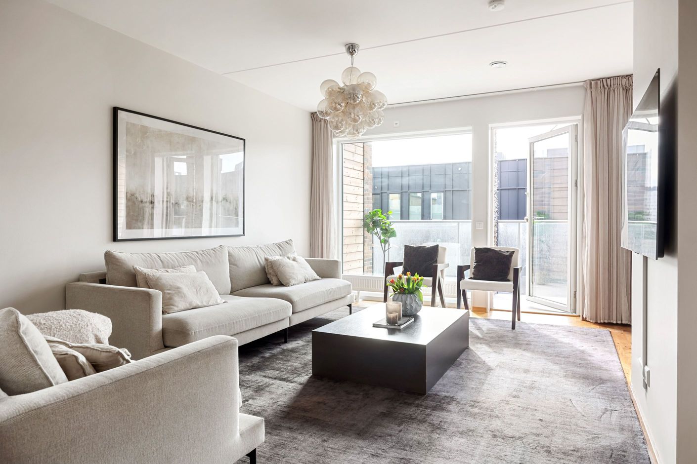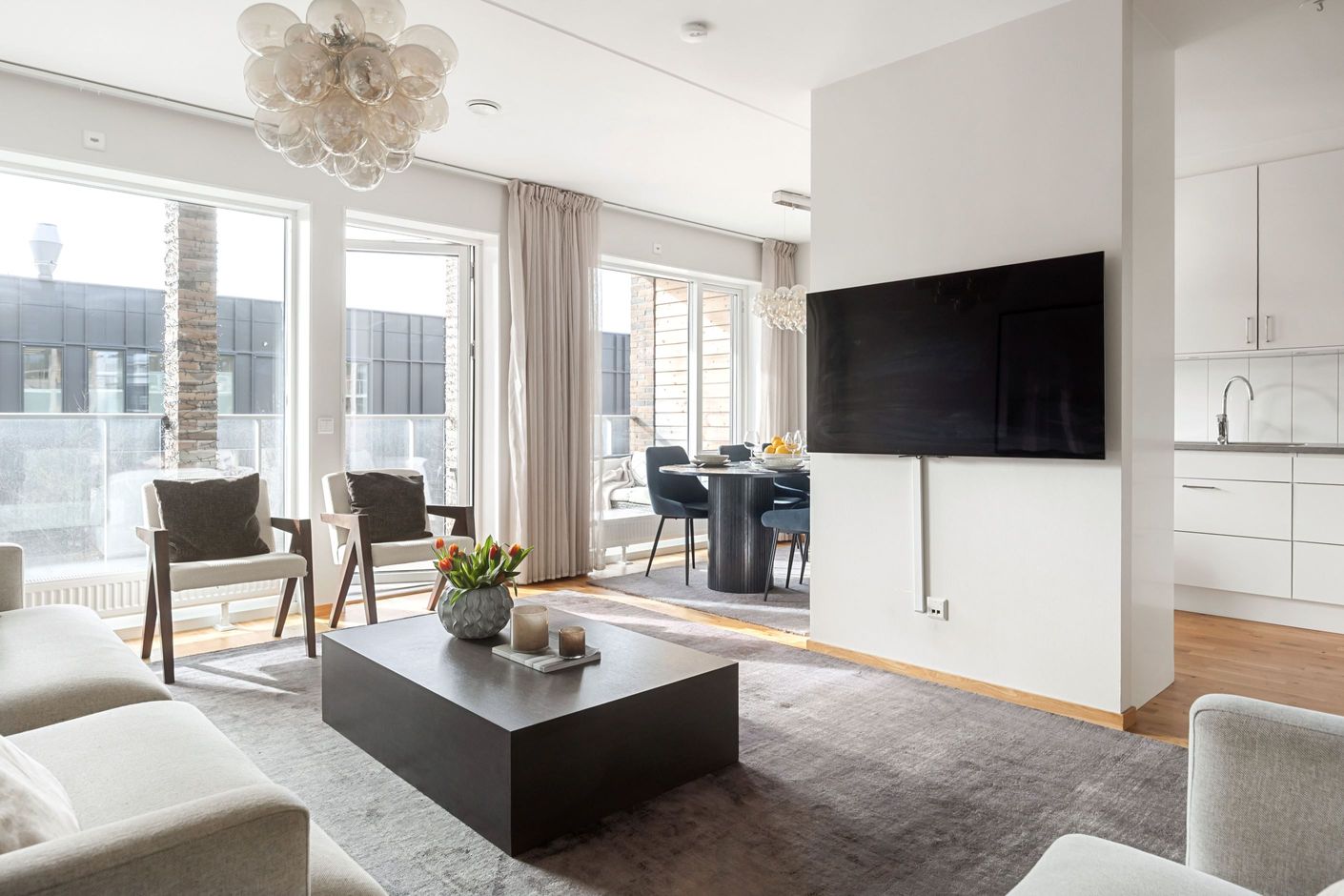 Vidare in öppnar bostaden upp sig mot det rymliga vardagsrummet som tillsammans med matplatsen skapar en inbjudande och social yta. Stora fönsterpartier ger ett fantastiskt ljusinsläpp och härifrån nås en av bostadens balkonger – perfekt för morgonkaffet eller en lugn stund i solen.