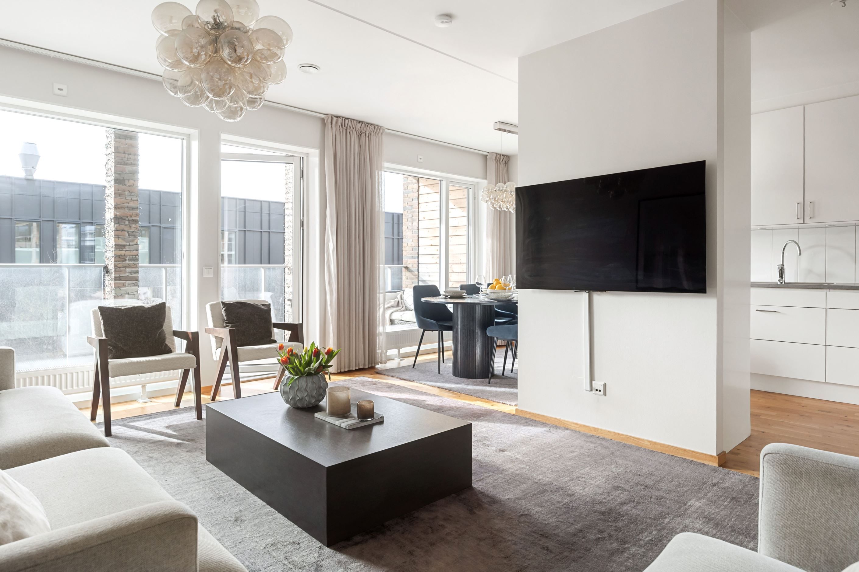 Bostaden präglas av ett fint ljusinsläpp från stora fönsterpartier och en modern, enhetlig interiör med fina ytskikt och genomgående parkettgolv. Planlösningen är både social och funktionell, där kök och vardagsrum samspelar på ett naturligt sätt och skapar en inbjudande miljö för såväl vardag som umgänge.