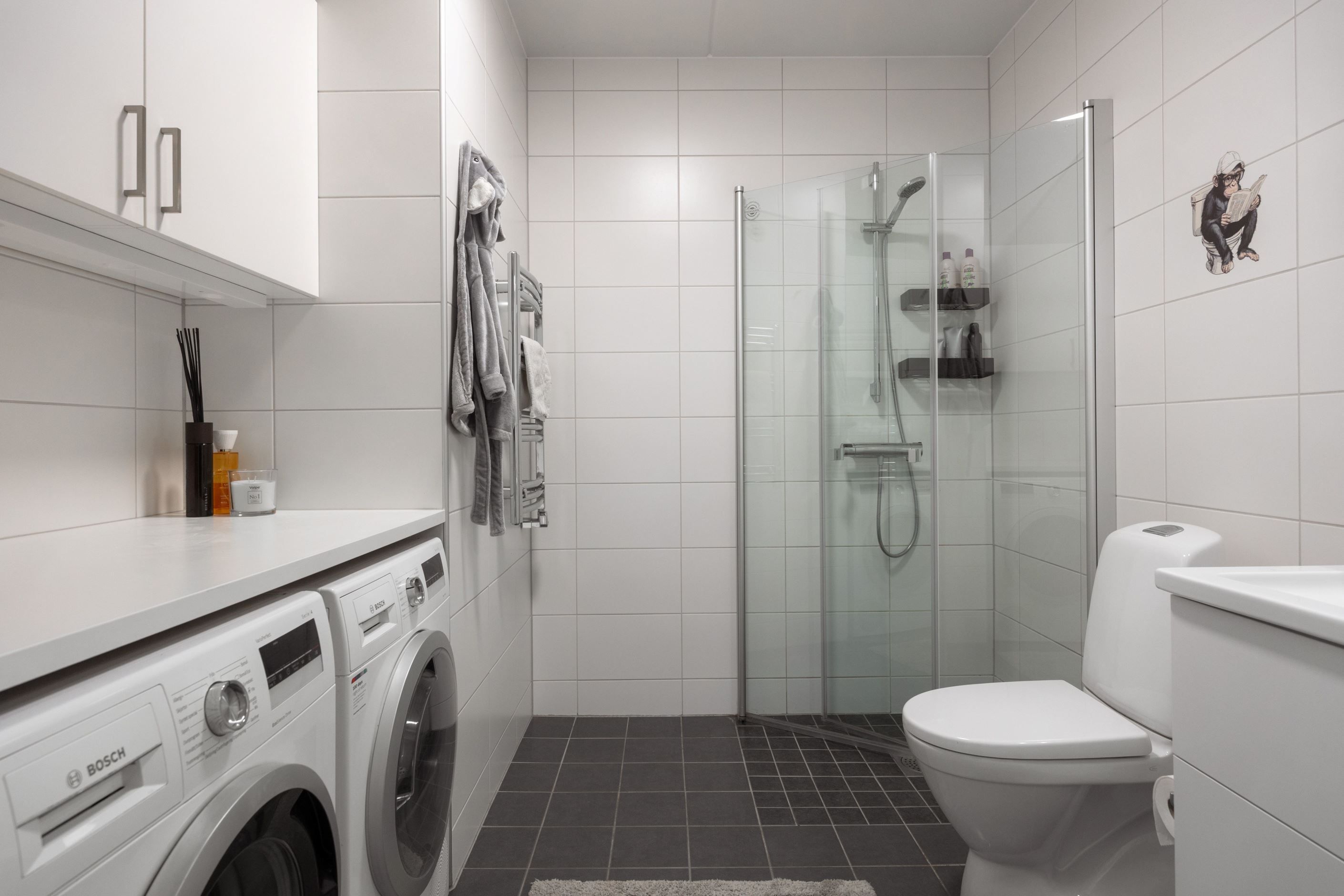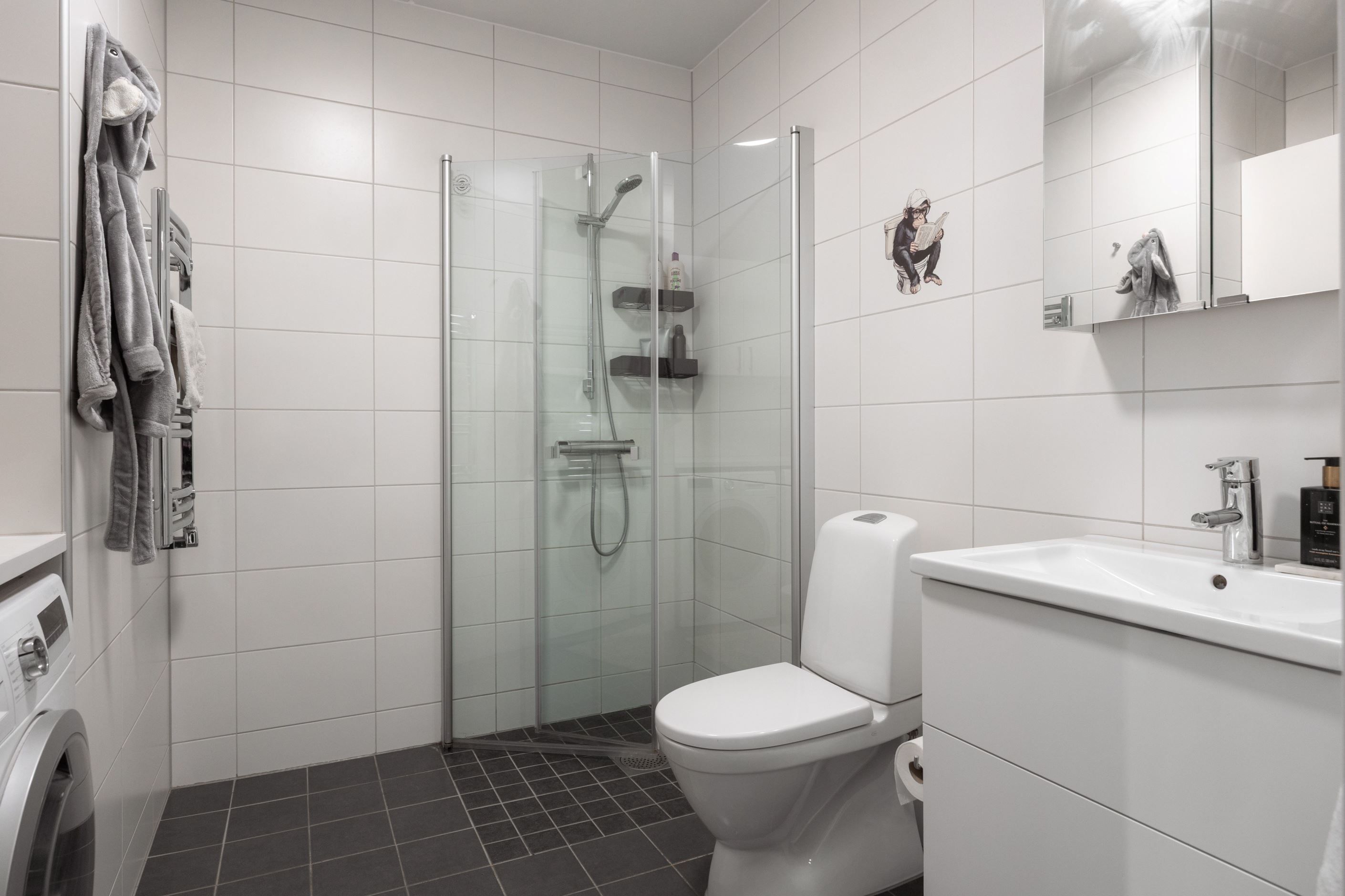 Det helkaklade badrummet är både fräscht och funktionellt, utrustat med dusch, WC samt egen tvättdel med tvättmaskin och torktumlare – en bekvämlighet som förenklar vardagen.