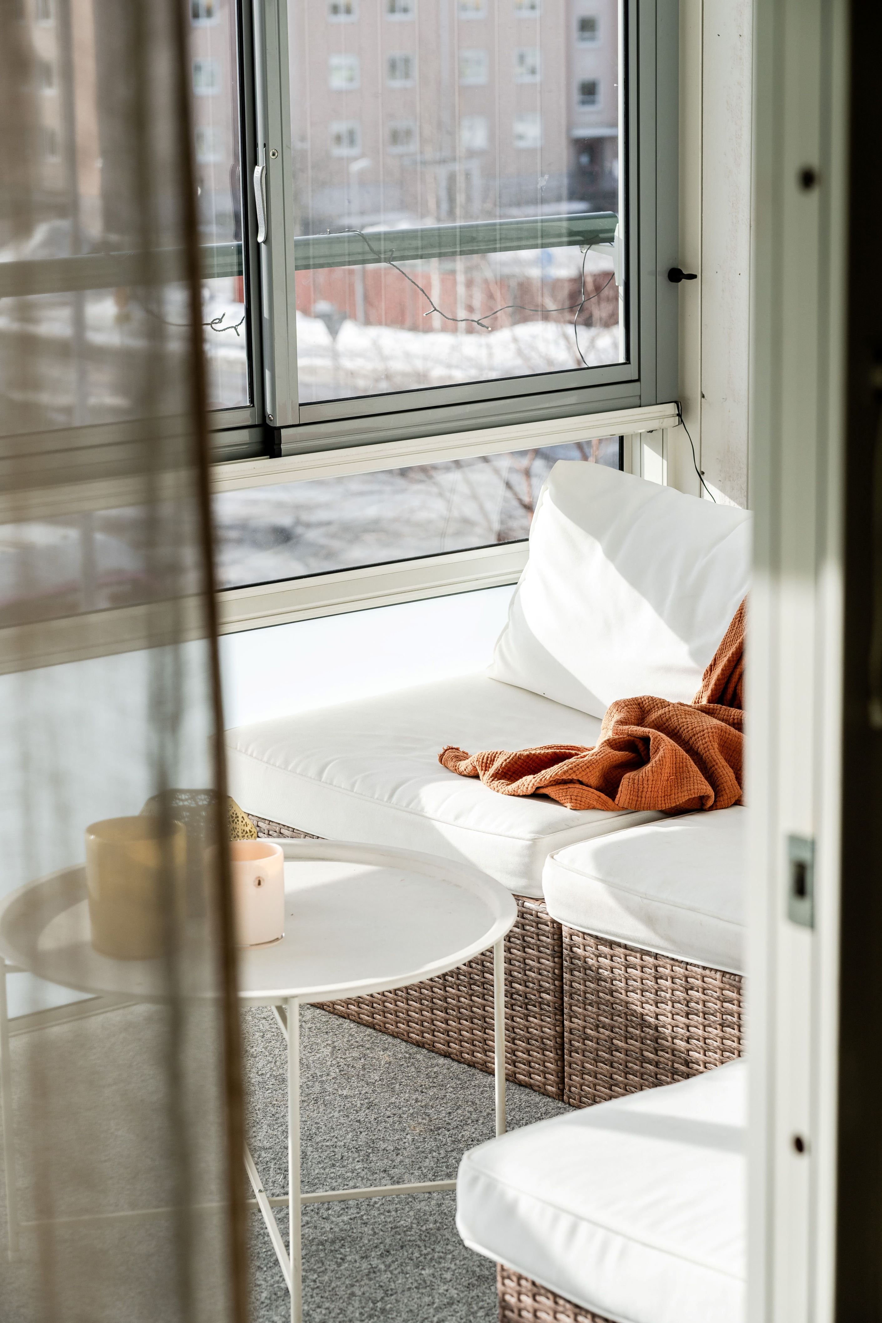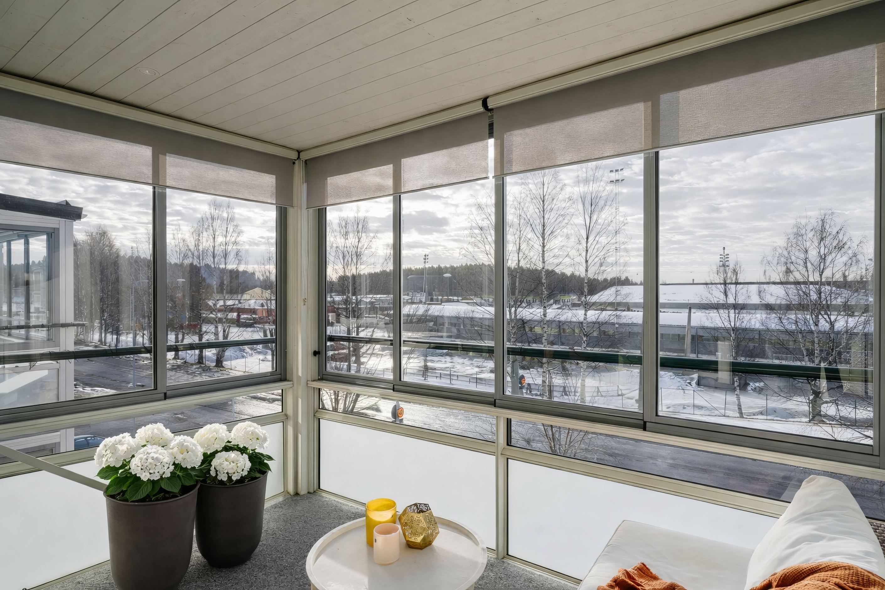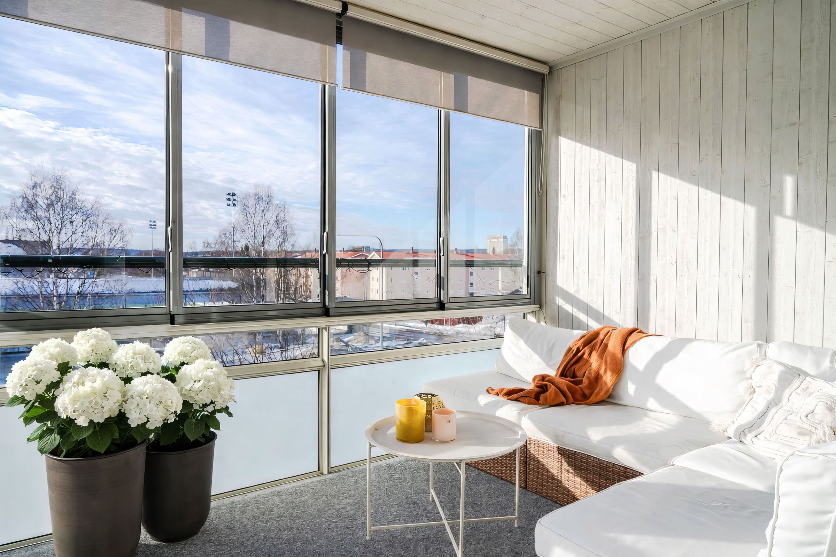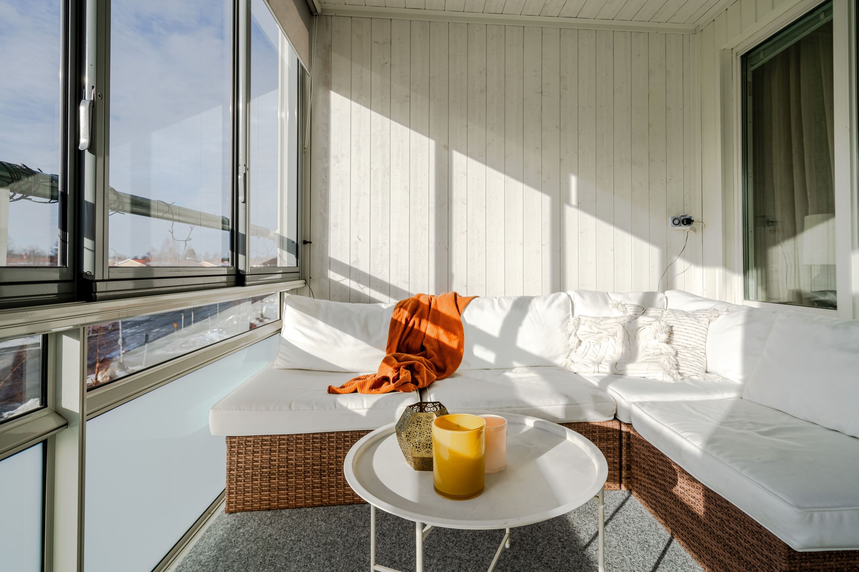 Från vardagsrummet nås den stora inglasade balkongen i söder, där du kan njuta av solen större delen av dagen och av ett fritt läge utan insyn. Det här blir ett extra rum som förlänger utesäsongen långt in på hösten.