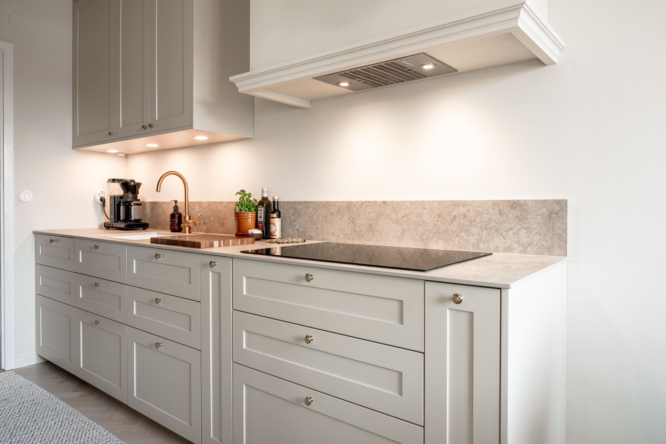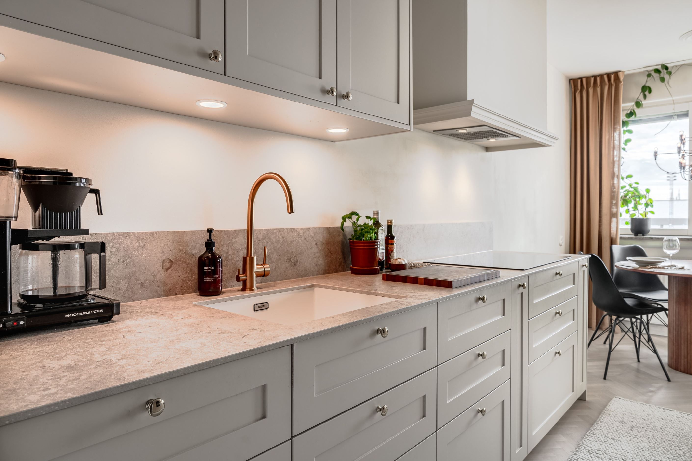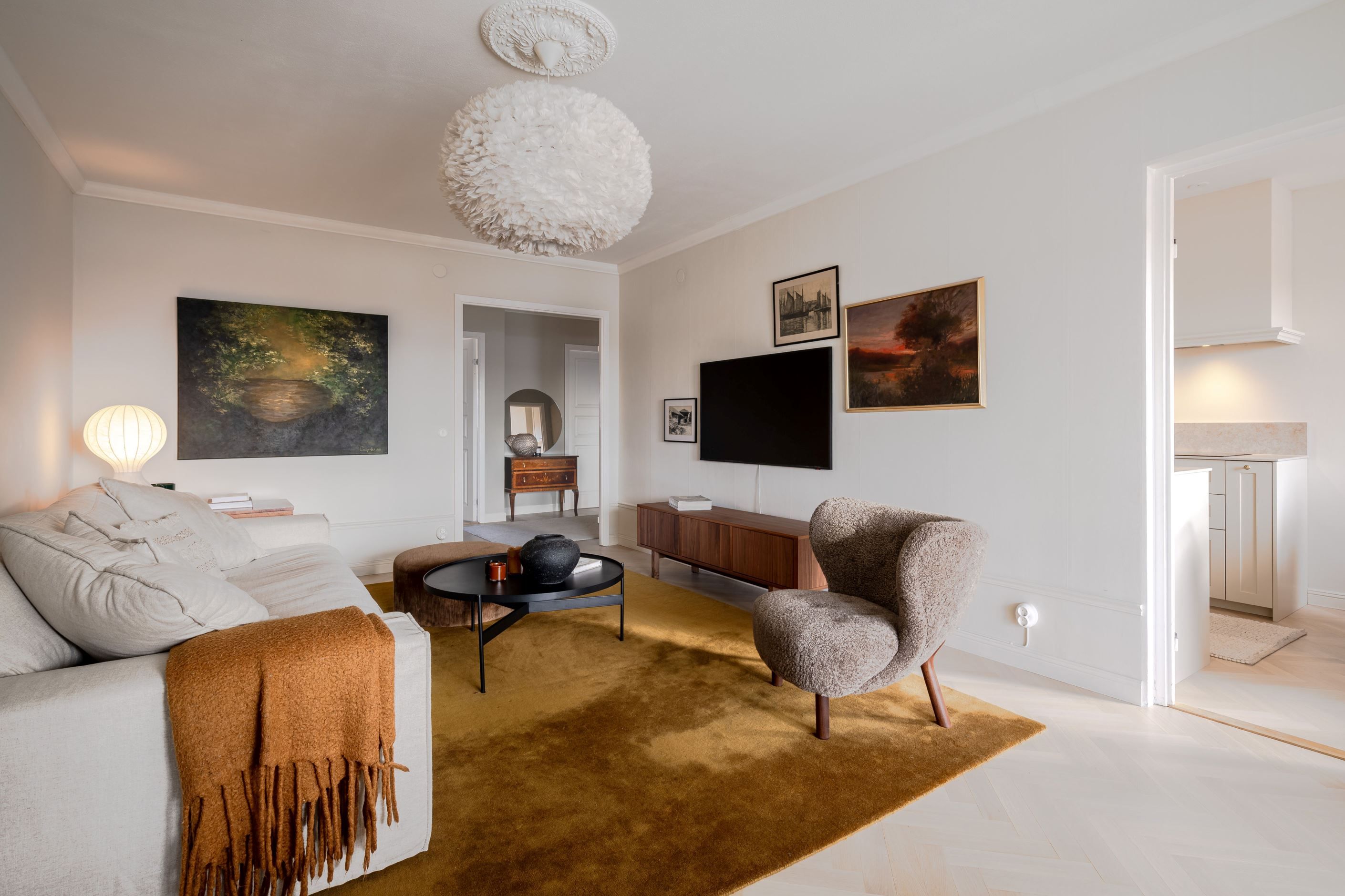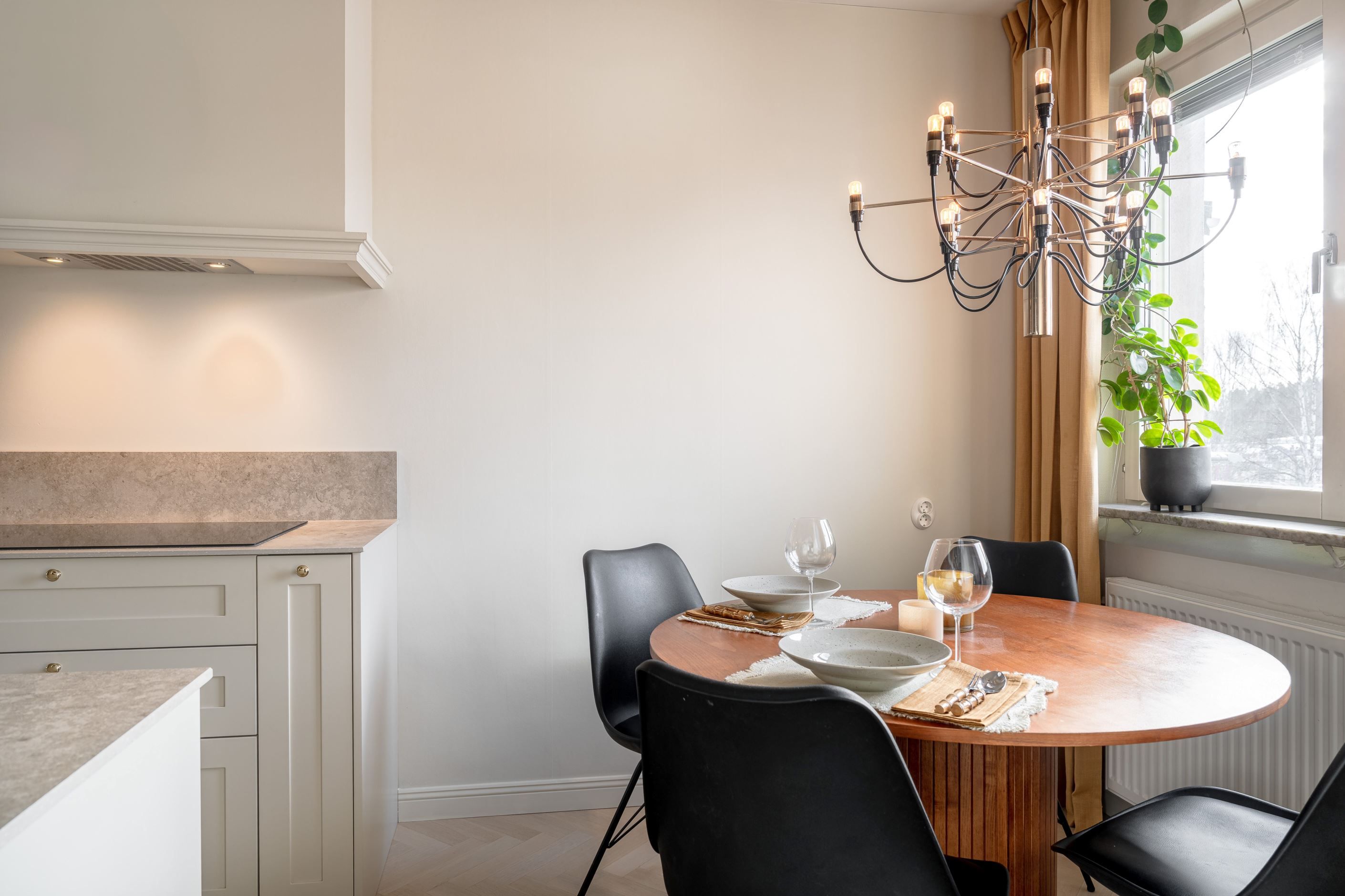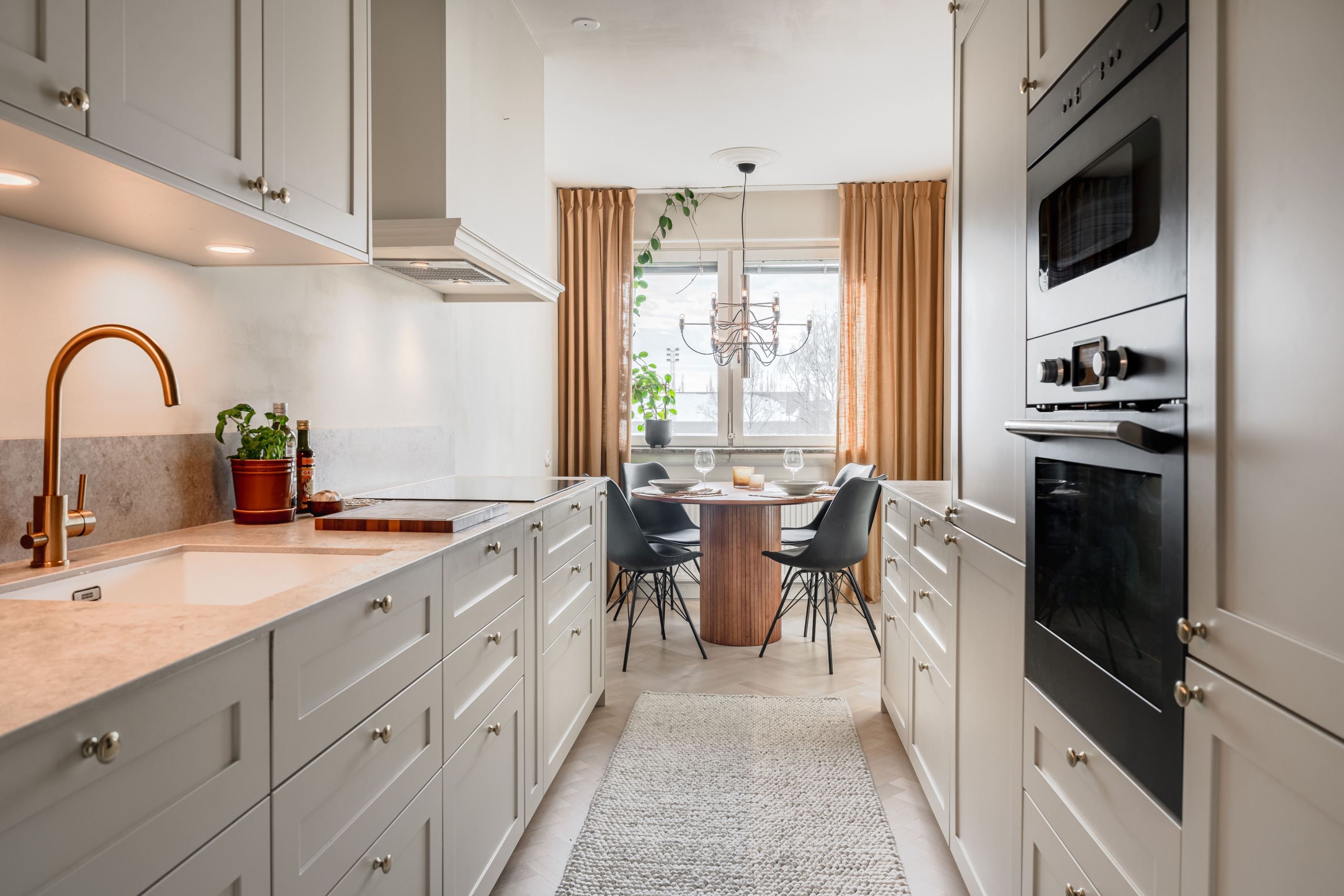 Planlösningen är både trivsam och funktionell med generösa sällskapsytor och fint ljusinsläpp. Det stilfulla köket är totalrenoverat med smakfulla materialval, stenskiva och moderna vitvaror, en perfekt plats för både vardagsliv och middagar i goda vänners lag.