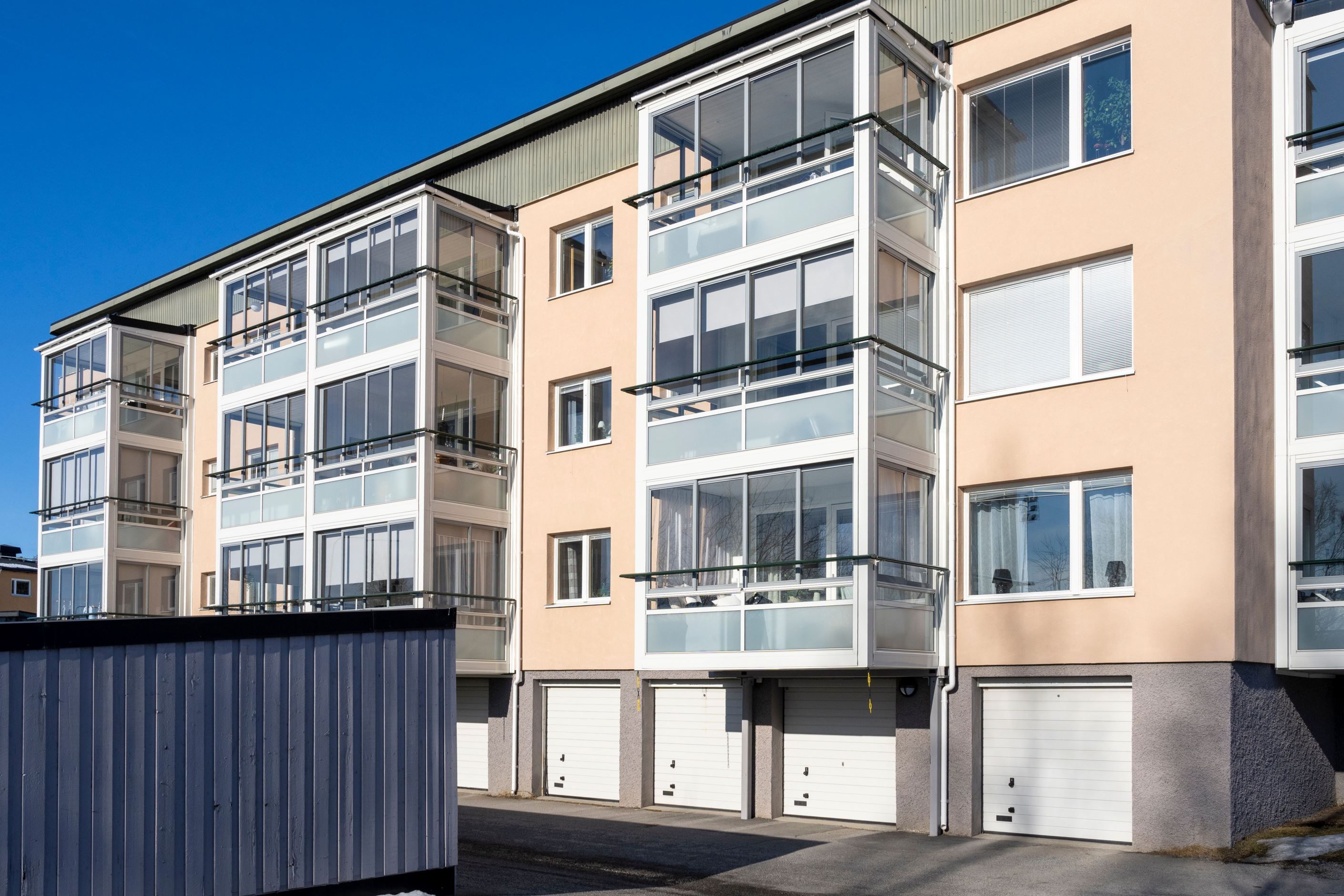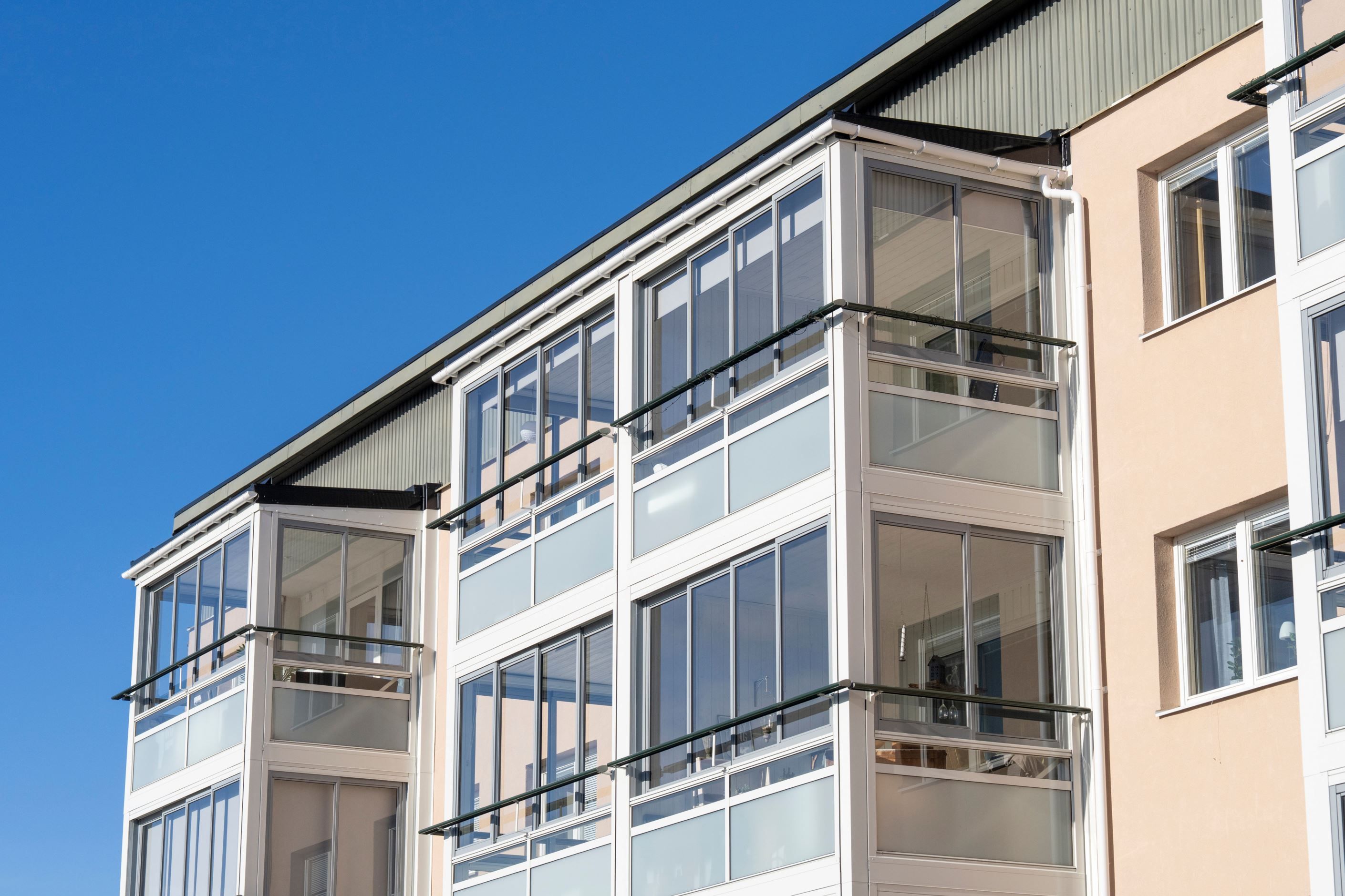 Trea högst upp i huset med solig inglasad balkong i söder