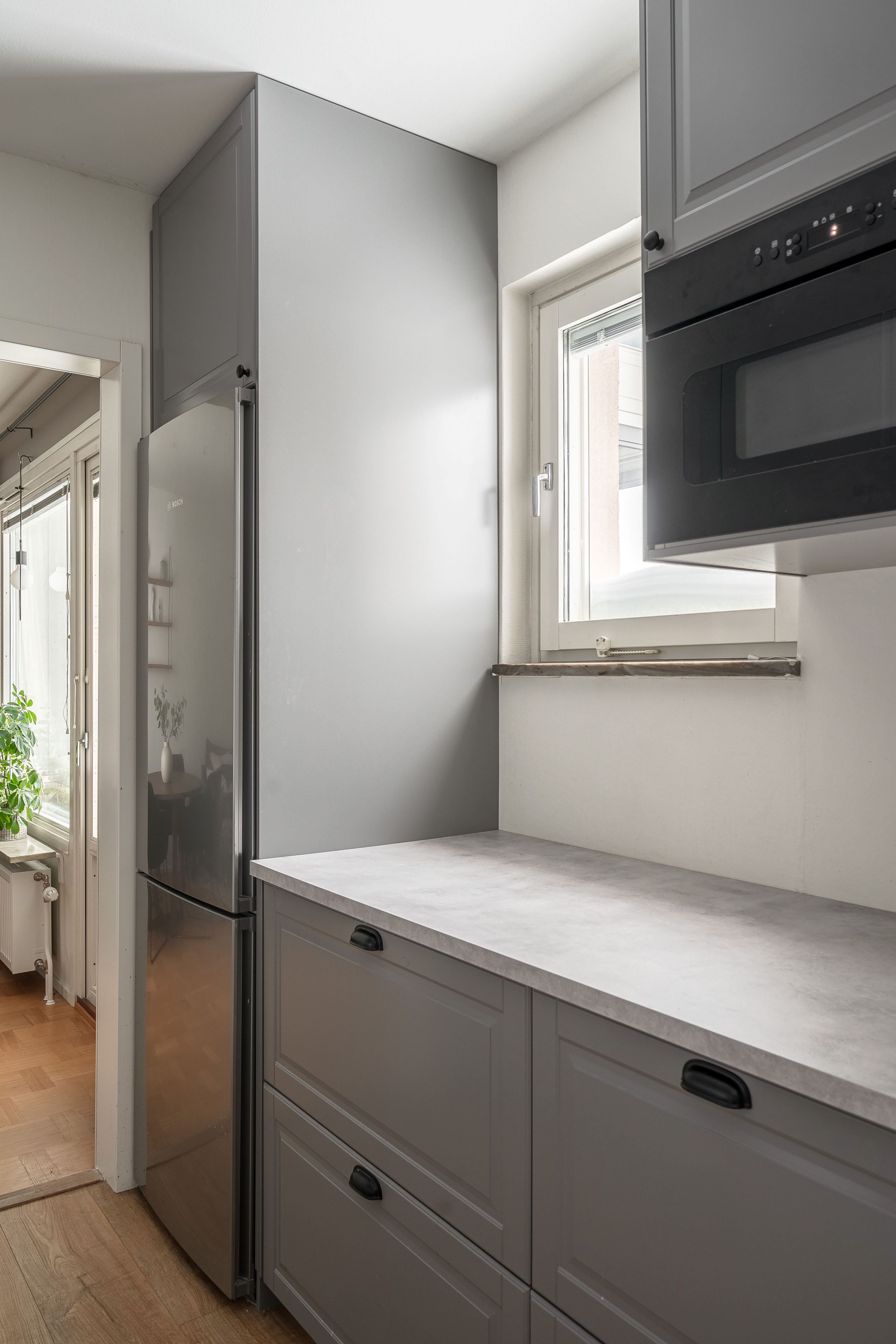 Köket är renoverat 2020 och stoltserar nu med snygga grå luckor som tillsammans med en ljust grå bänkskiva och ett stilfullt vitt kakel erbjuder dig ett mysigt utrymme att tillaga dina måltider. Här sker ljusinsläpp via ett fönsterparti i västläge, precis som i matsalsdelen som ligger precis intill köket. Här ryms ett större matsalsbord med till hörande stolar för trevliga sociala middagar eller häng med vänner och bekanta.