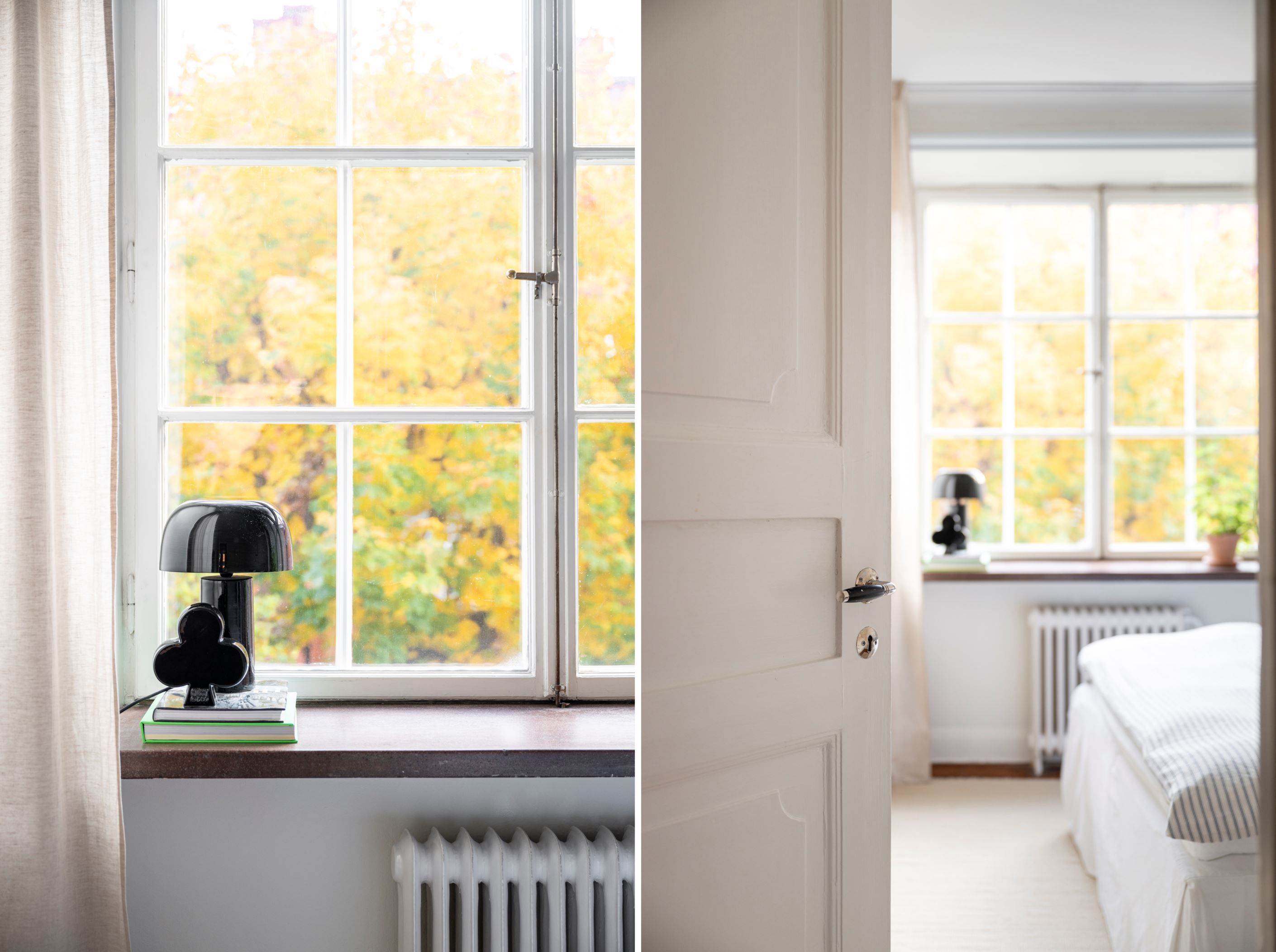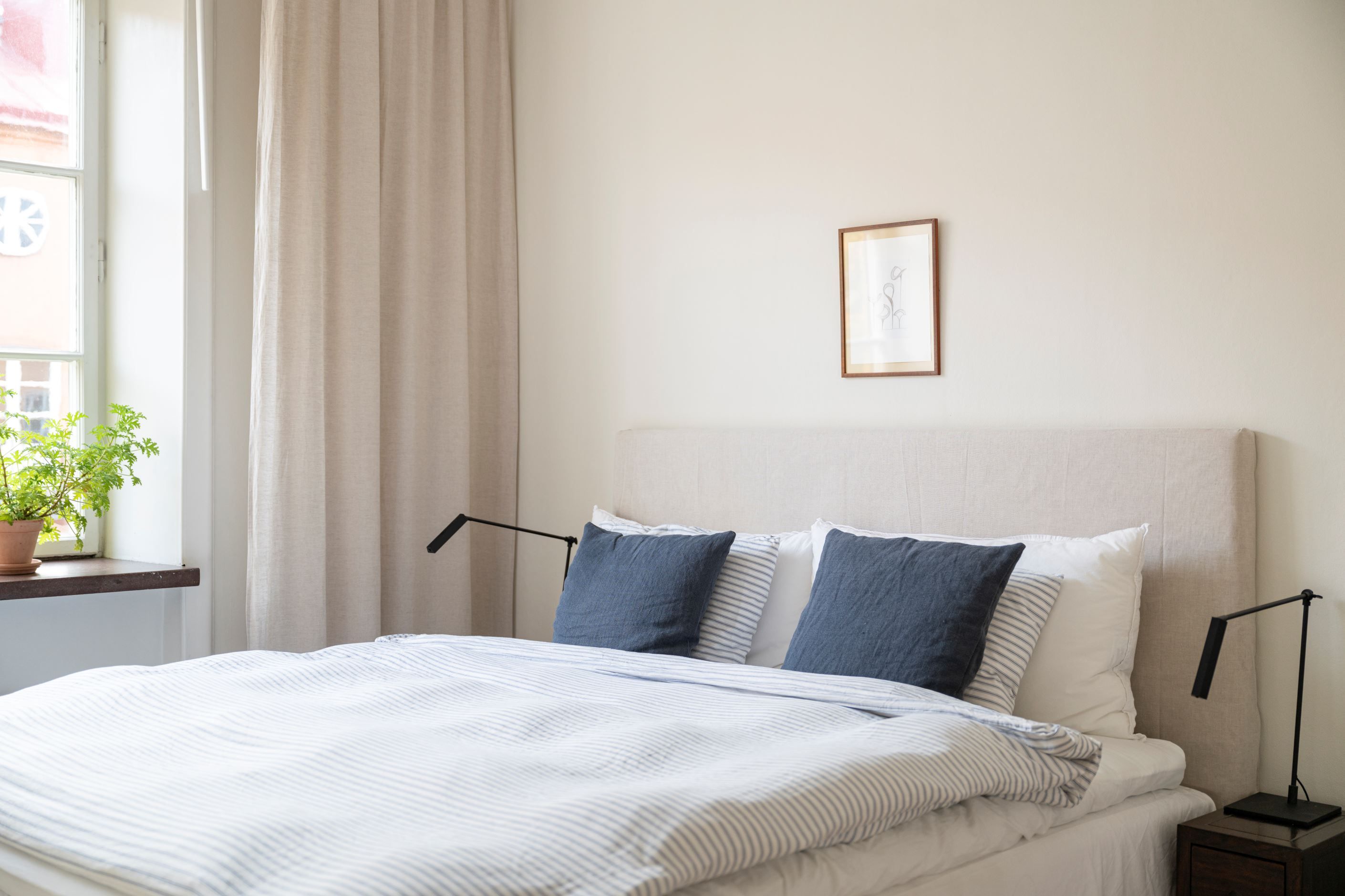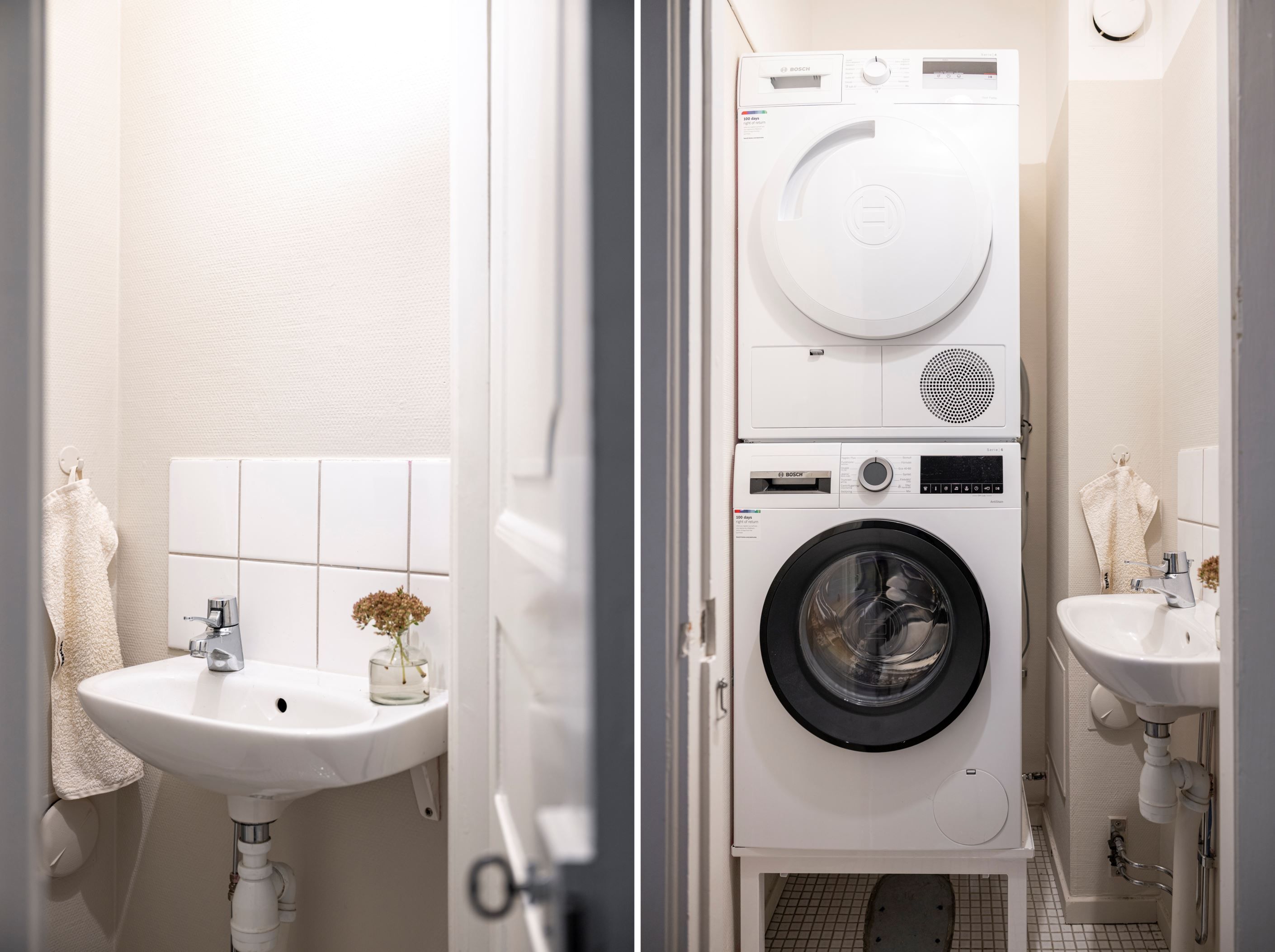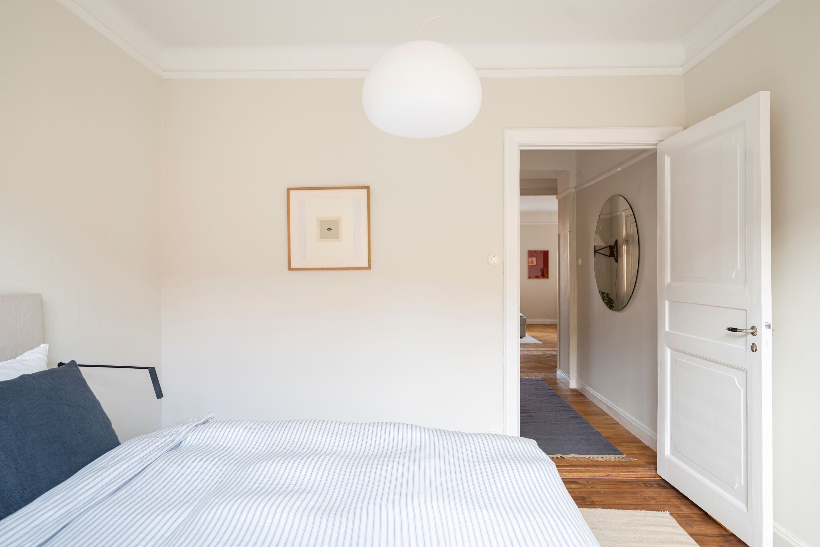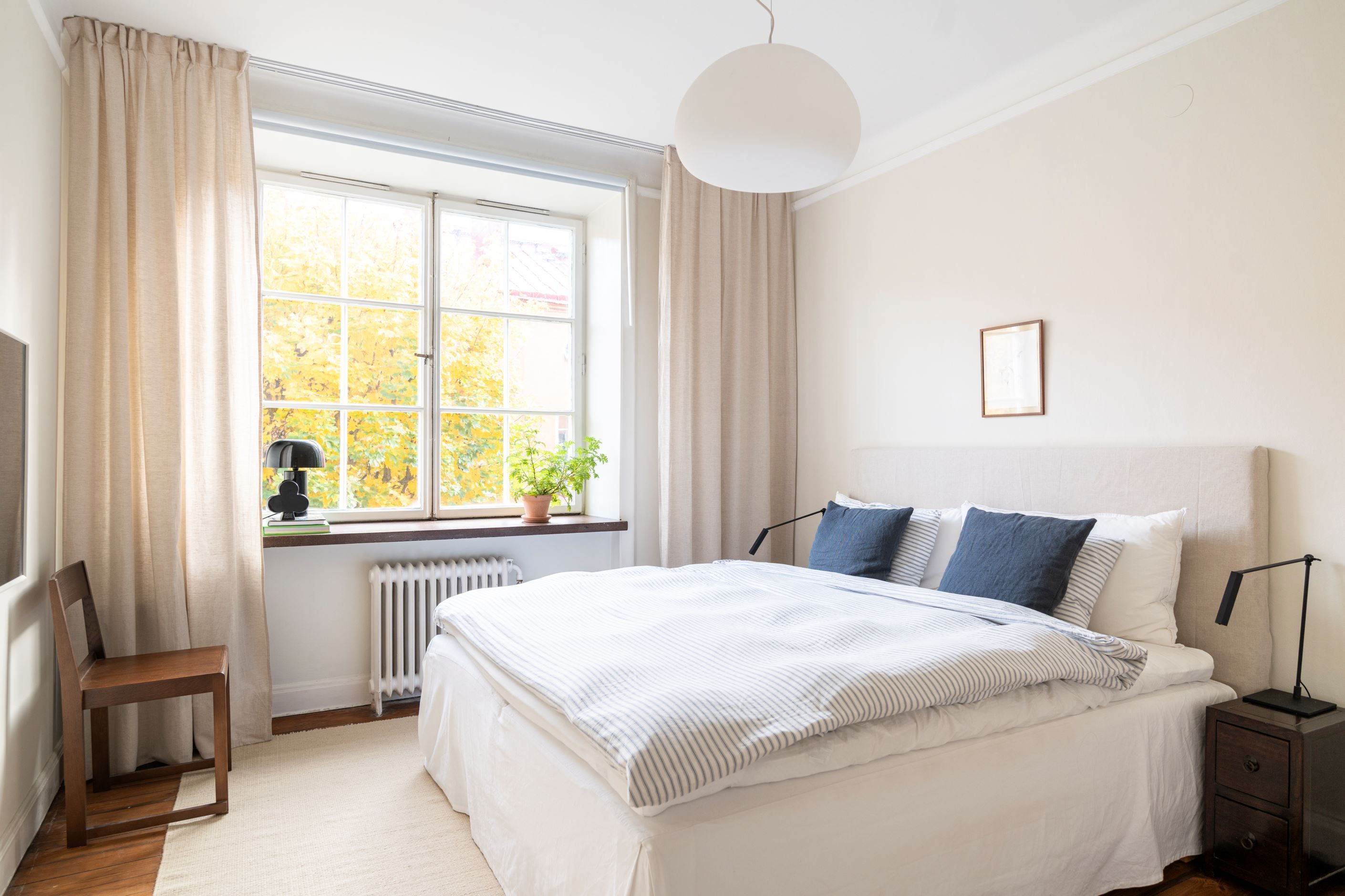 Det rogivande sovrummet vetter mot den tysta innergården, vilket ger en lugn atmosfär. Intill ligger en generös walk-in-closet med utmärkta förvaringsmöjligheter. Badrummet är stilrent renoverat med smakfulla materialval, och det separata tvättrummet med tvättmaskin och torktumlare gör vardagen extra bekväm.