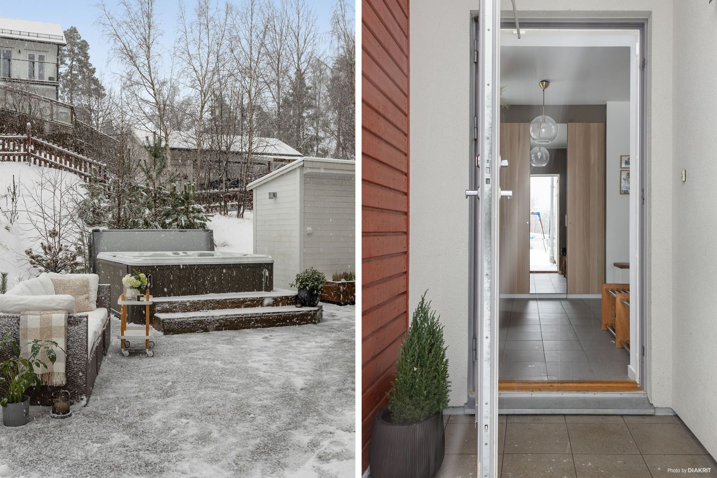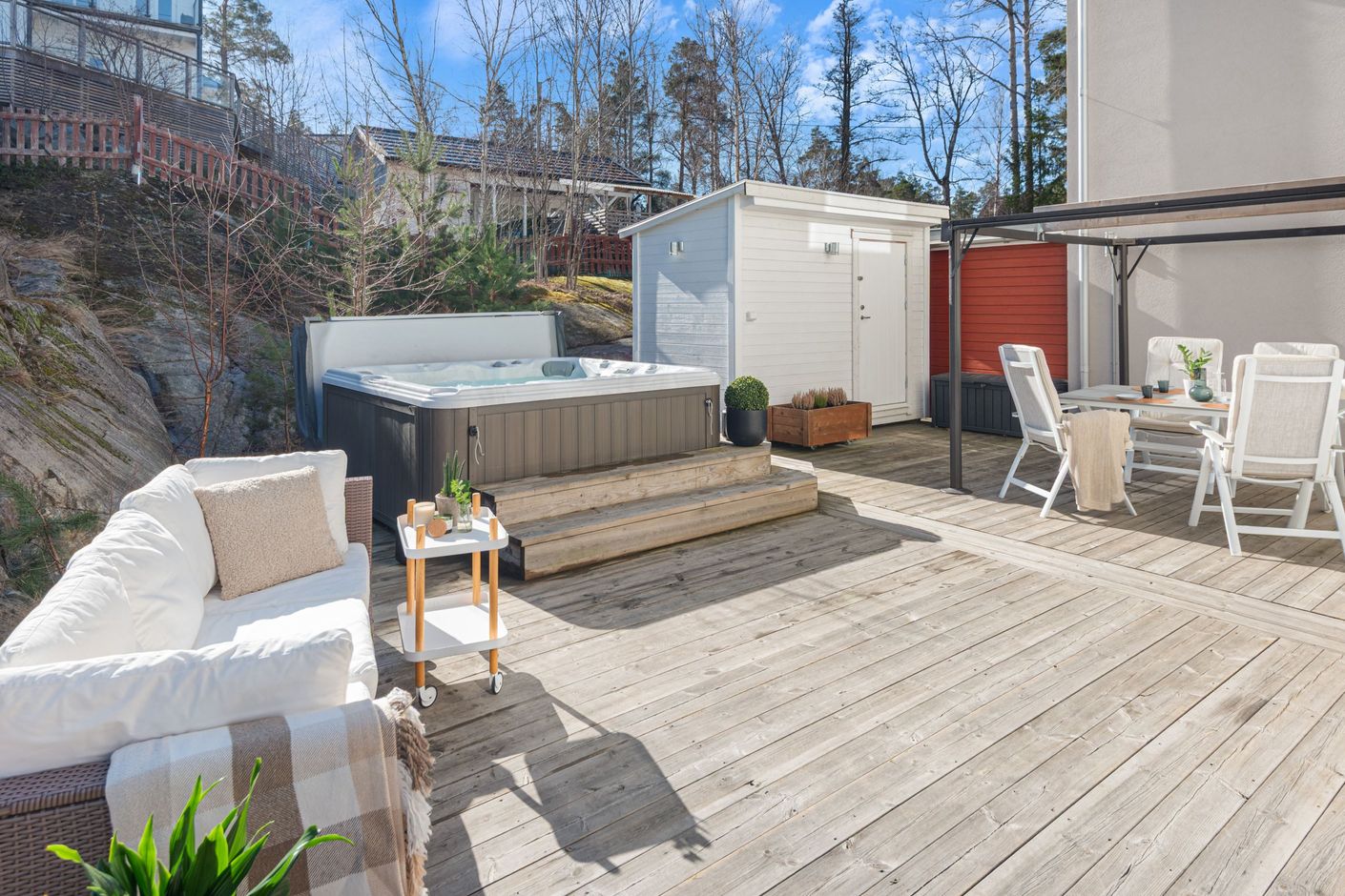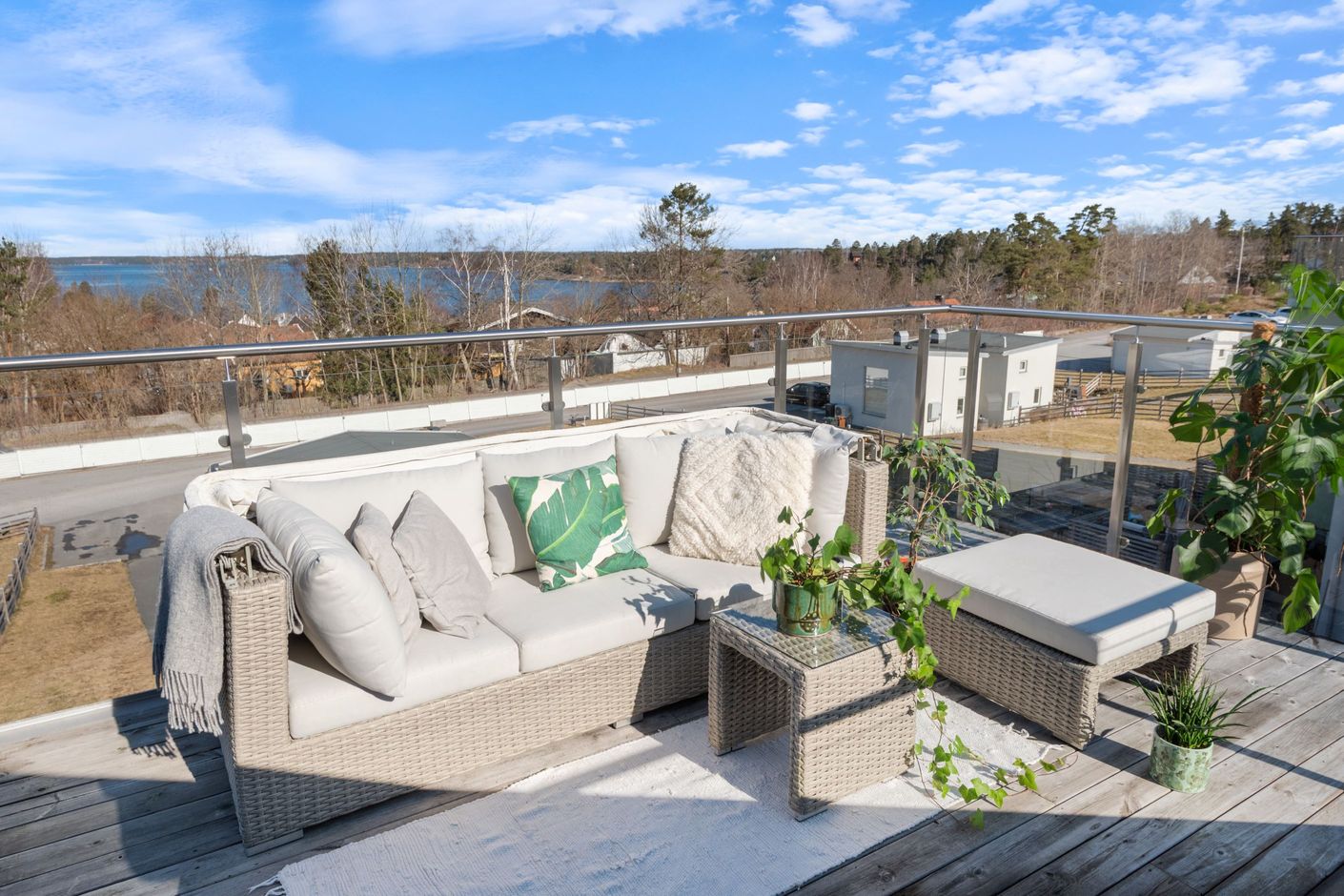Högst upp i huset, via en trappa från andra våningen, hittar ni den fantastiska takterrassen med gott om plats för större möblemang. Här ligger solen på större delar av dagen och kvällen och bjuder på härliga solnedgångar över Torsbyfjärden. Utöver takterrassen finns även en balkong på andra våningen som passar perfekt för att avnjuta förmiddagssolen. På framsidan finns ett stort altandäck med direkt anslutning till kök/vardagsrum. Altanen tillsammans med trädgårdens gräsmatta skapar härliga ytor för lek och umgänge. Till huset hör ett isolerat garage med intilliggande förråd. Det finns även gott om plats för fler bilar. På husets baksida finner ni ett spabad och en altan med insynsskyddat läge samt ytterligare ett isolerat förråd med indragen el.