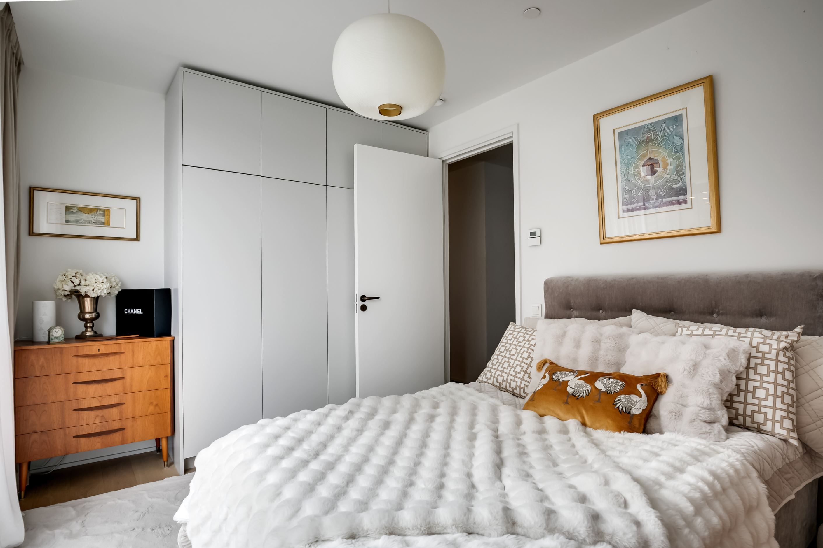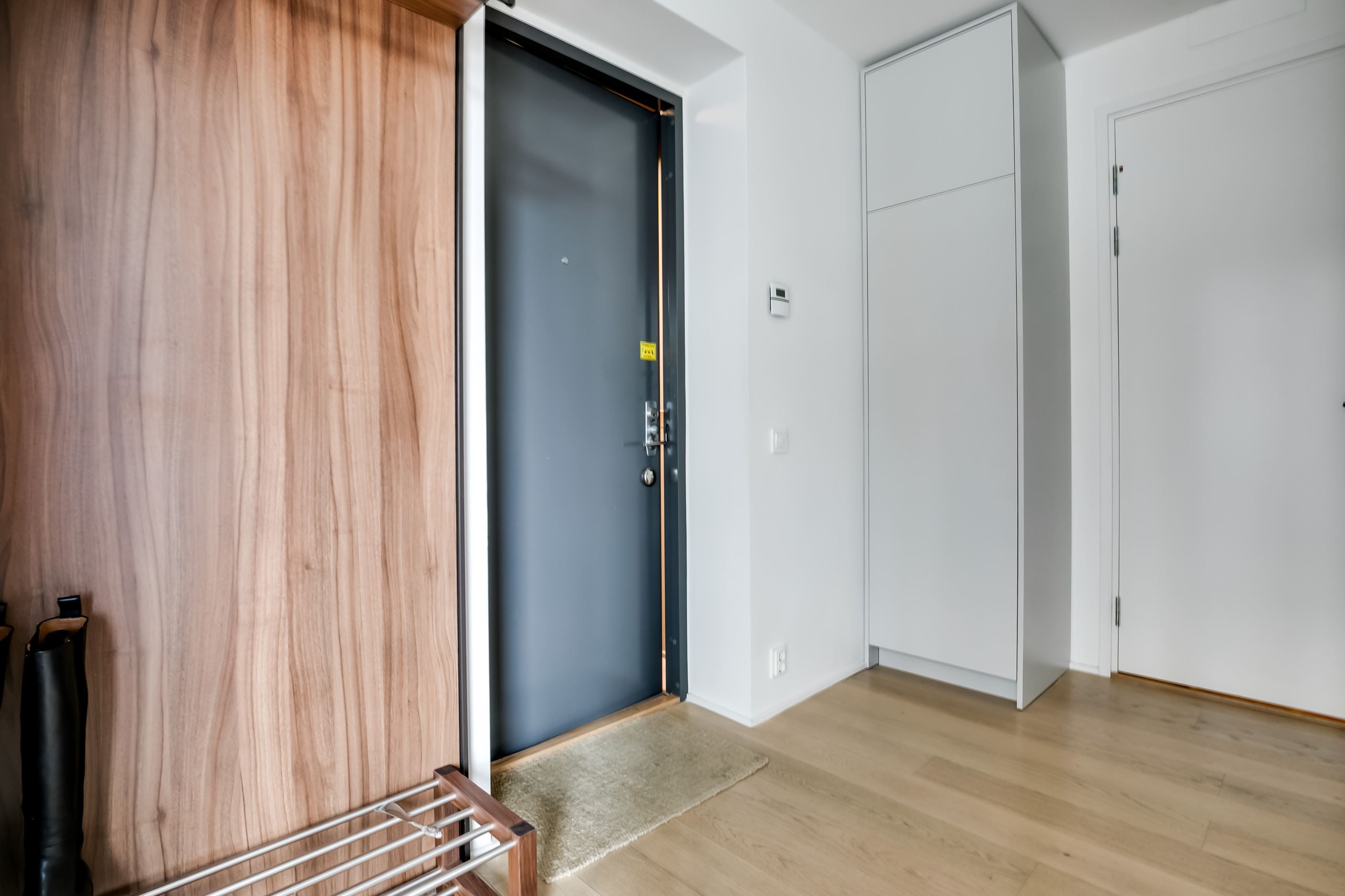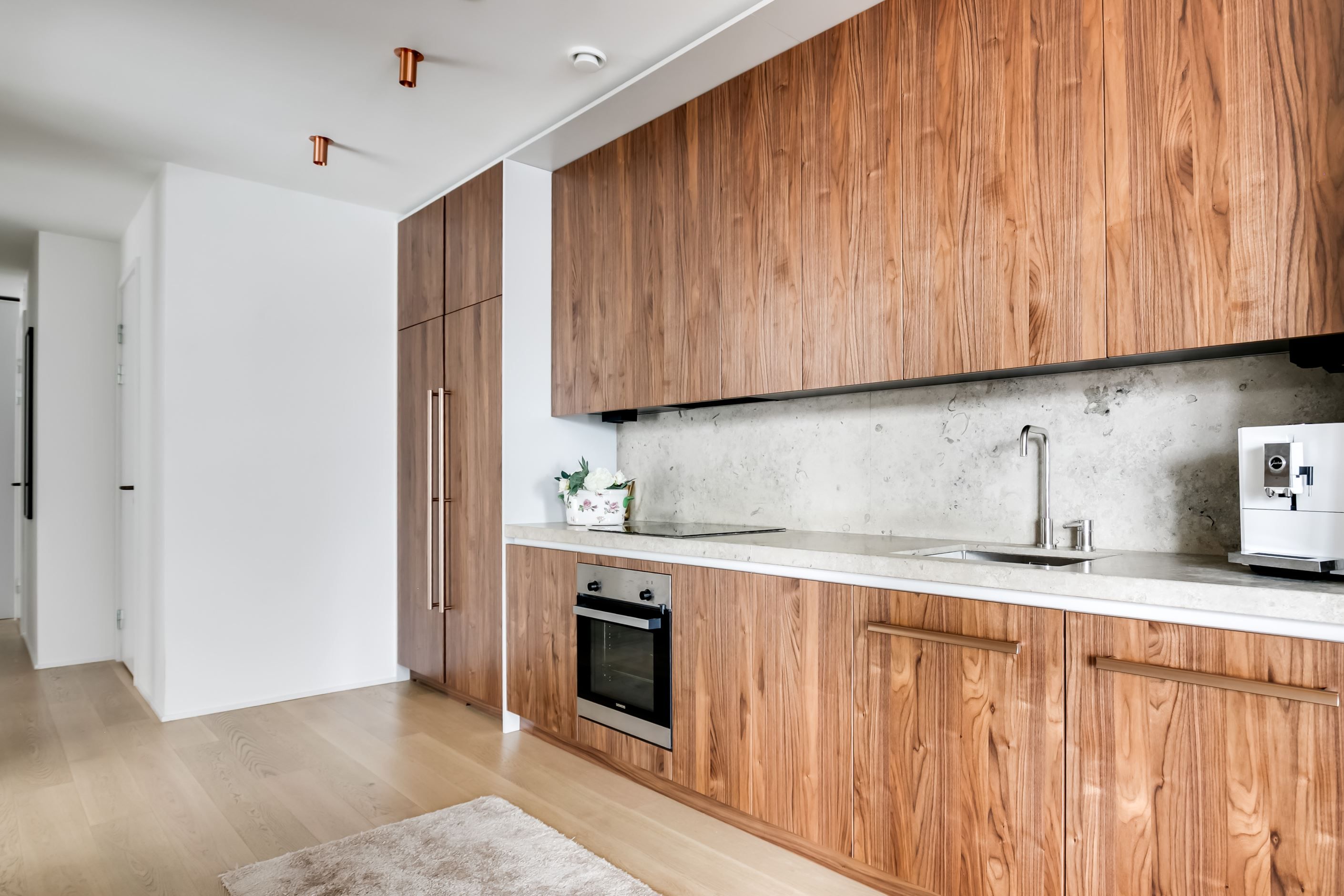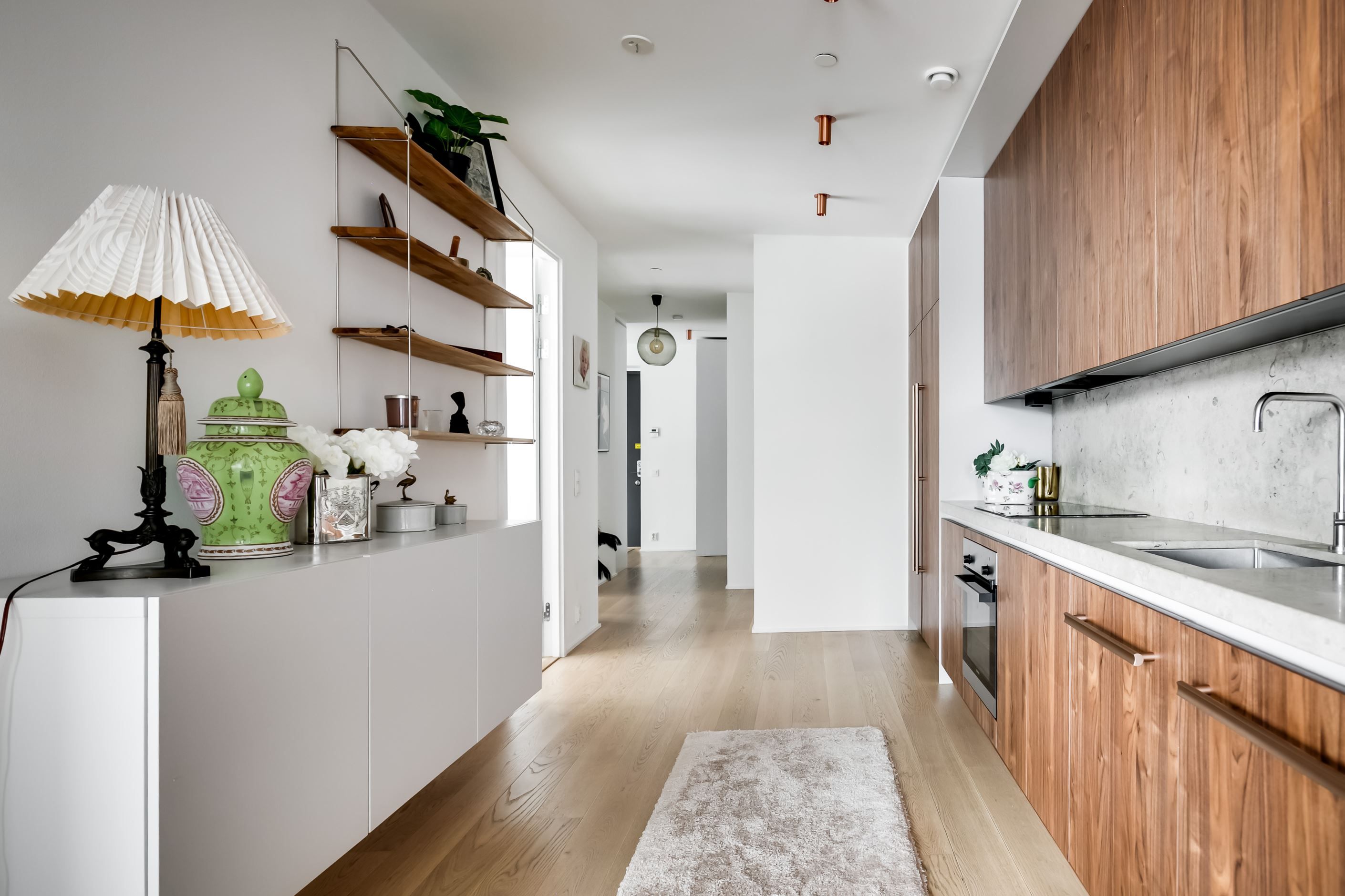 Materialvalen är påkostade och harmoniska, med ljusa ytor, vackra valnötsdetaljer och noggrant utvalda lösningar som kombinerar estetik med funktion. Väggar med platsbyggd förvaring smälter diskret in i arkitekturen och bidrar till ett stilrent, genomarbetat och lättmöblerat hem.